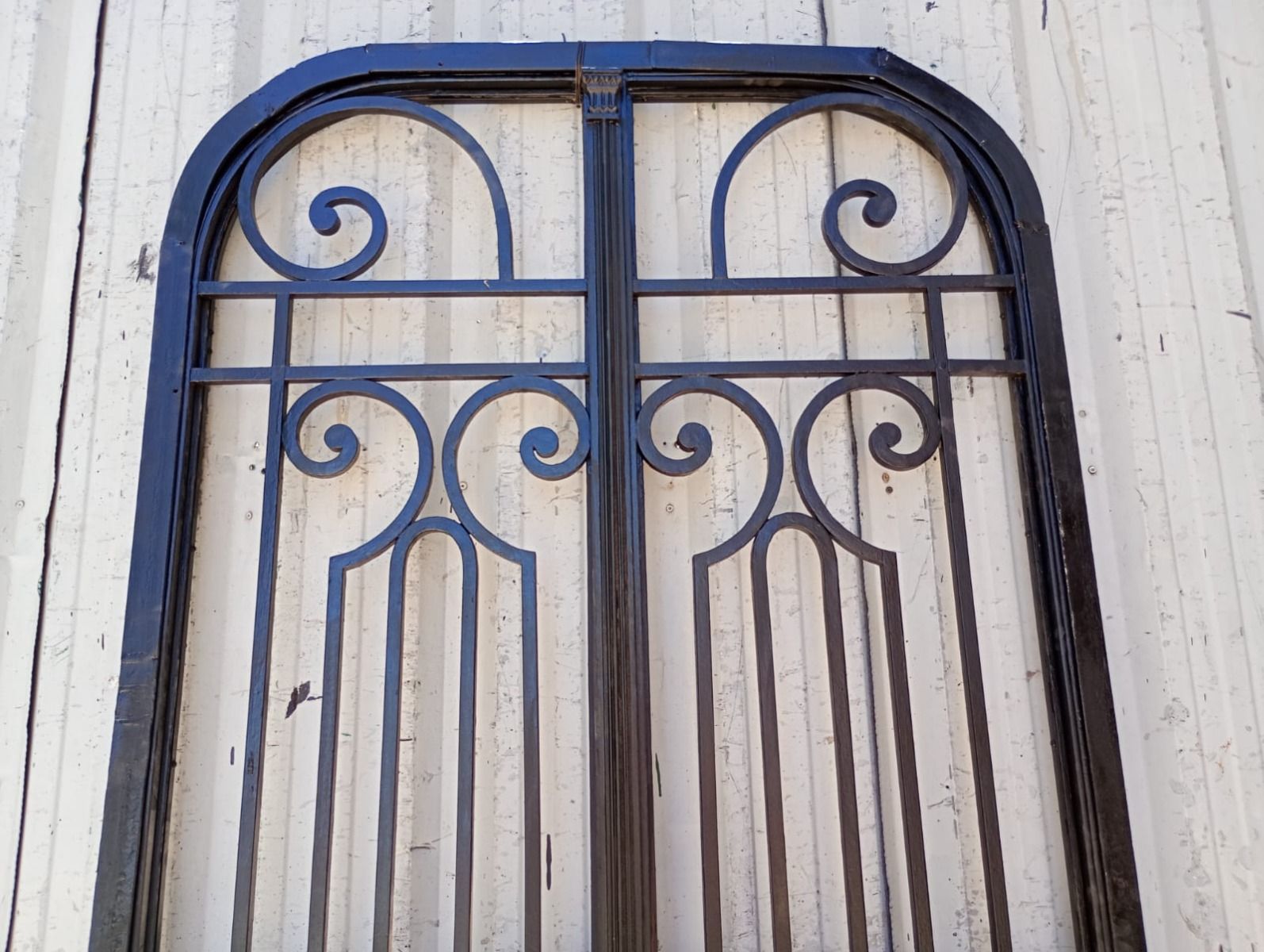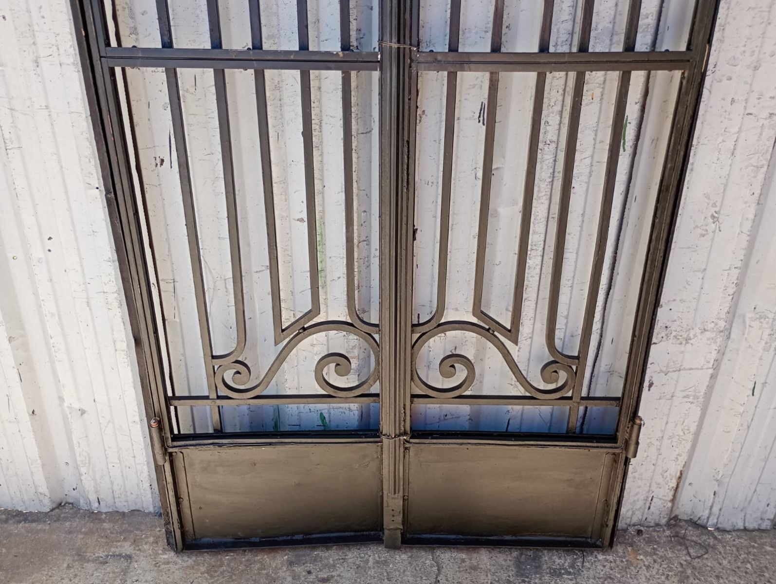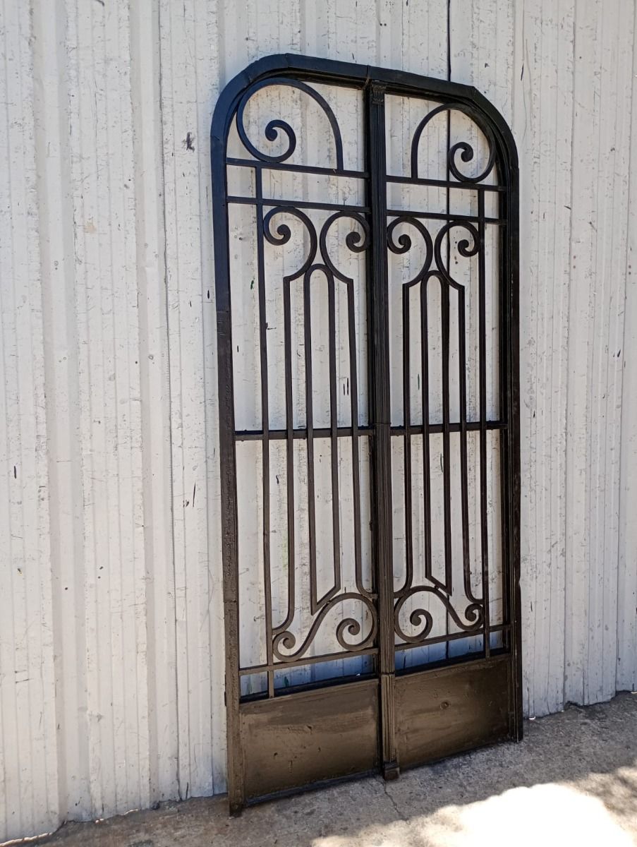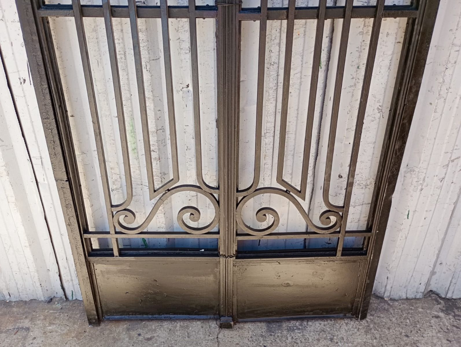 Antigua puerta de frente de hierro forjado reciclada y pintada de negro. Es a dos hojas de abrir, con tapajunta, chapón inferior y marco de hierro. No incluye vidrios, caja para cerradura, cerradura ni picaporte. Hojas de 50x217cm.
