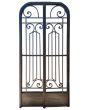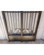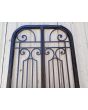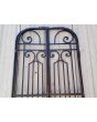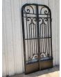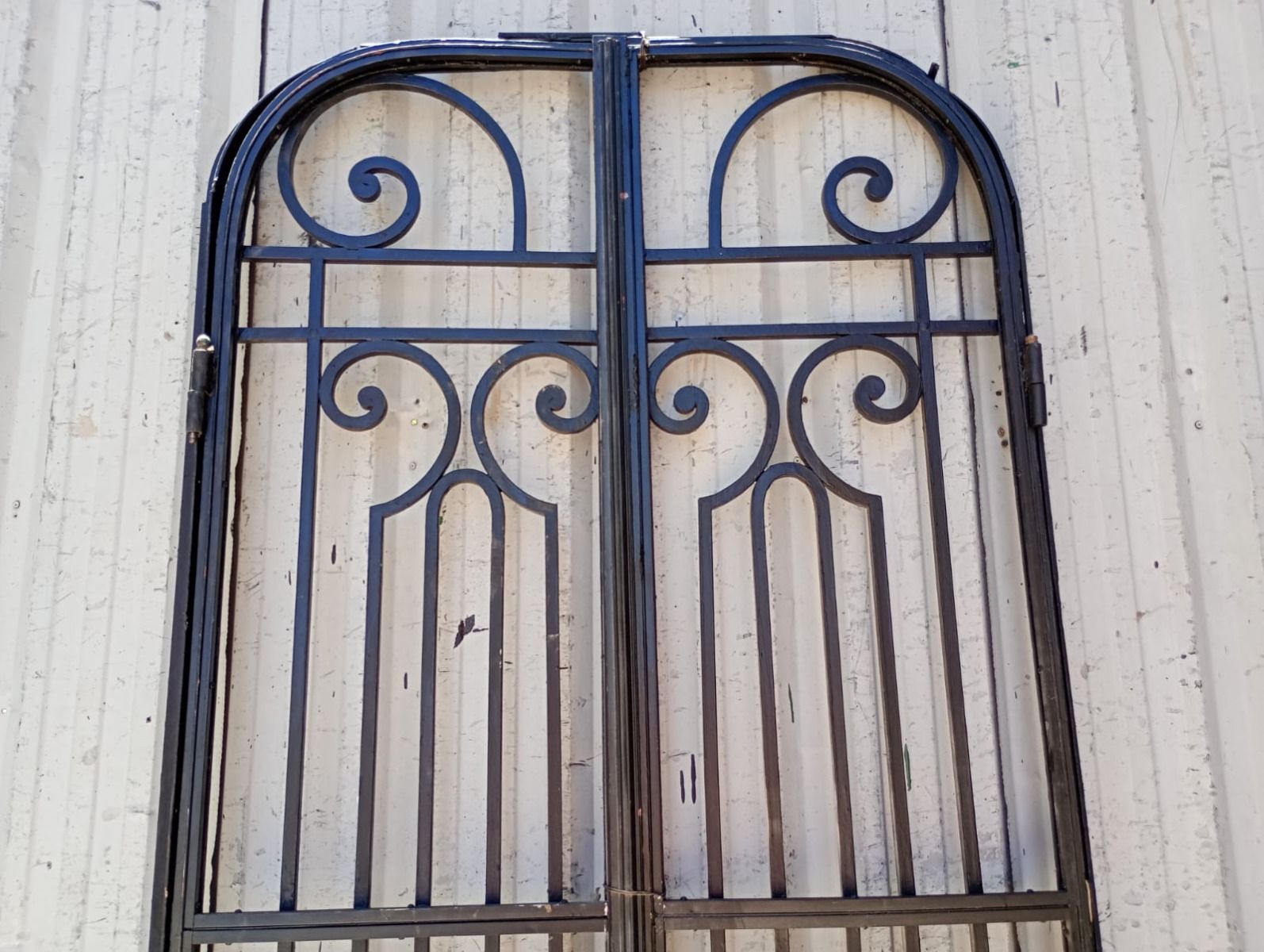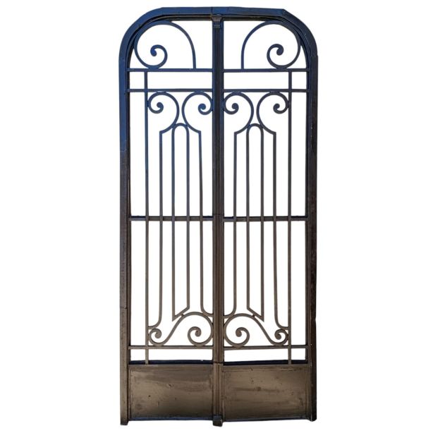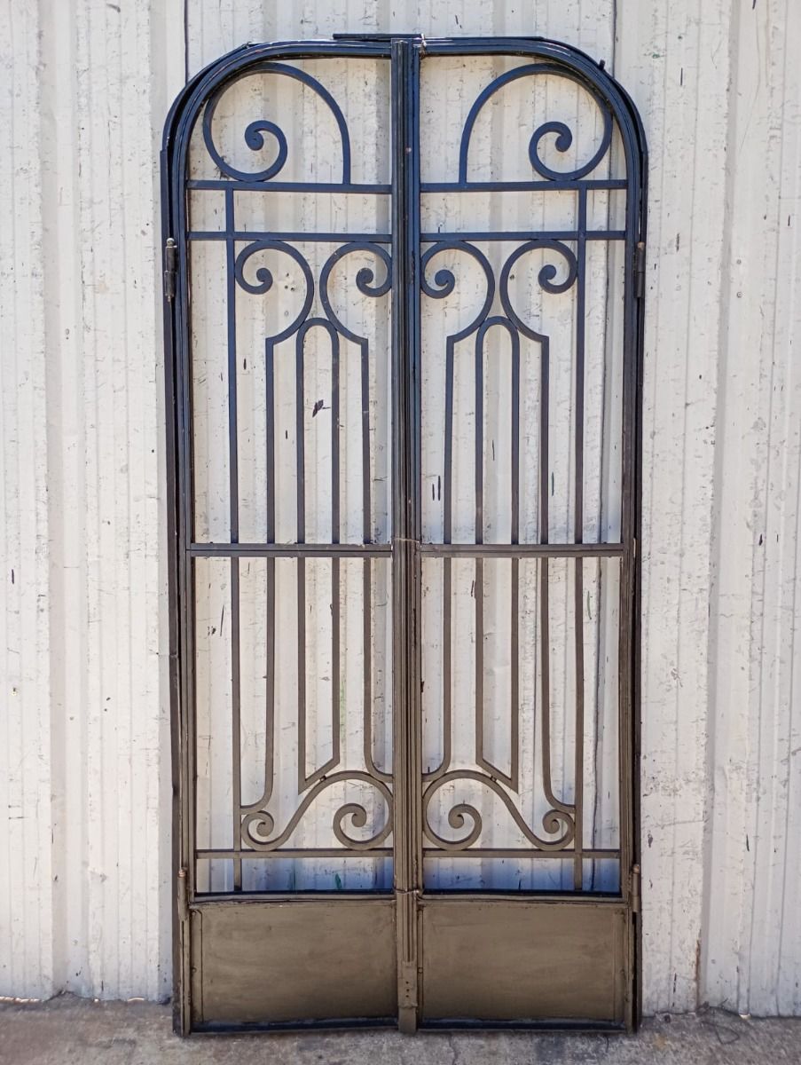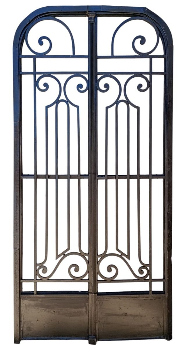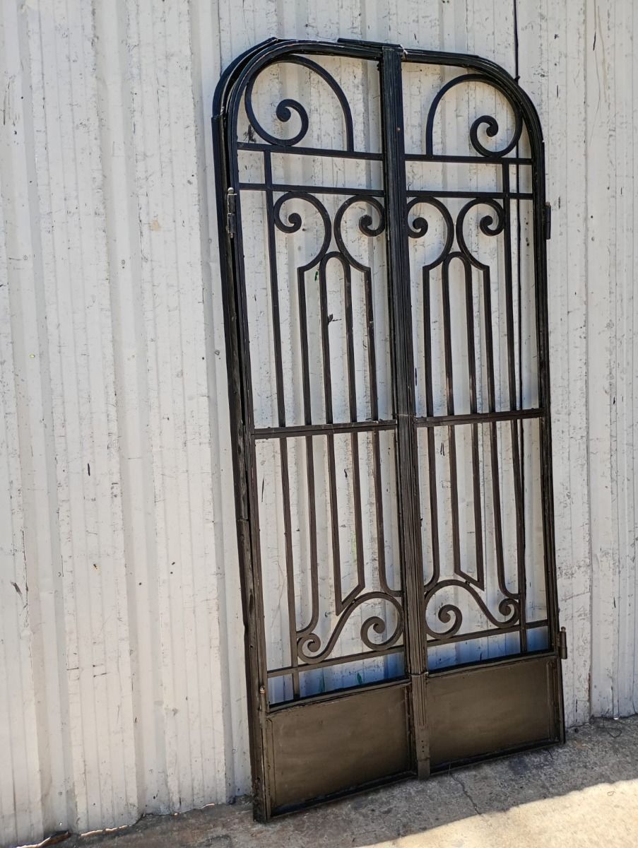 Antigua puerta de frente de hierro forjado reciclada y pintada de negro. Es a dos hojas de abrir, con tapajunta, chapón inferior y marco de hierro. No incluye vidrios, caja para cerradura, cerradura ni picaporte. Hojas de 50x217cm.