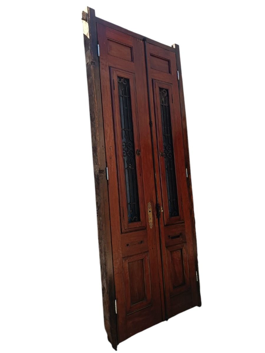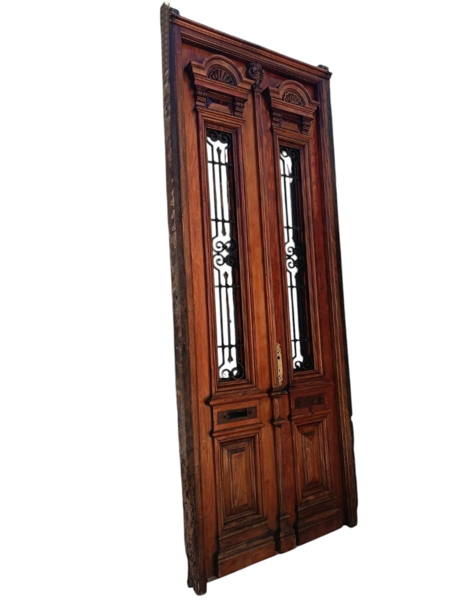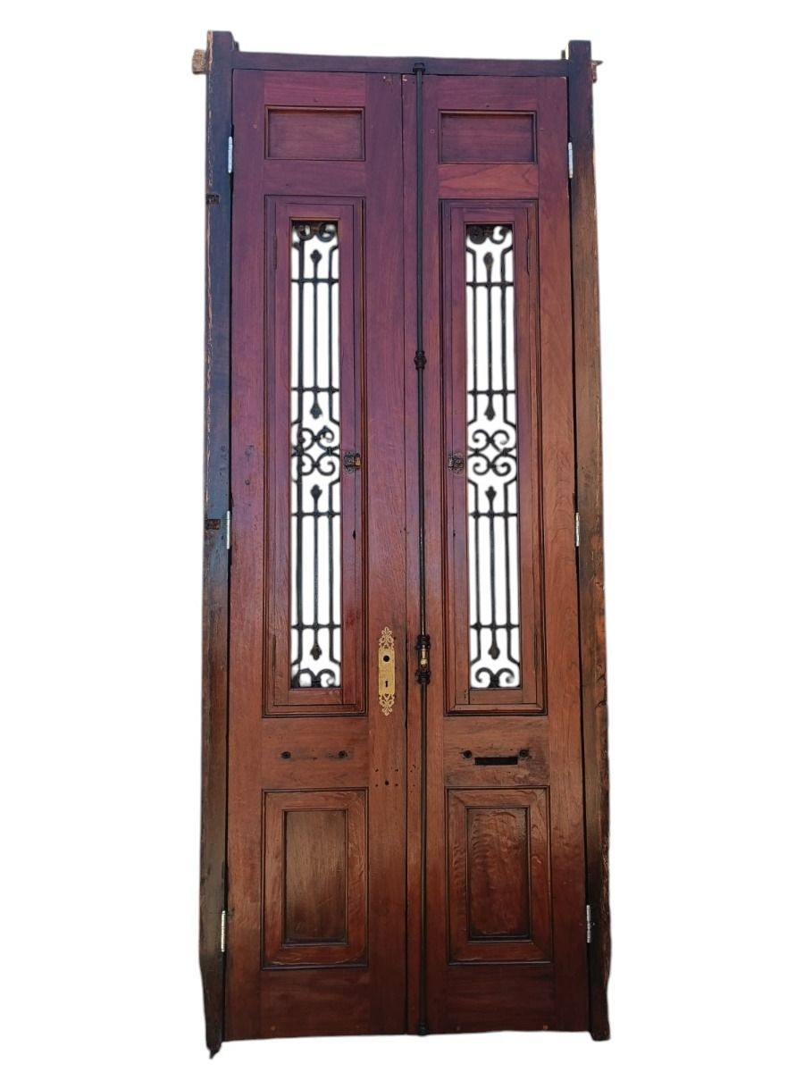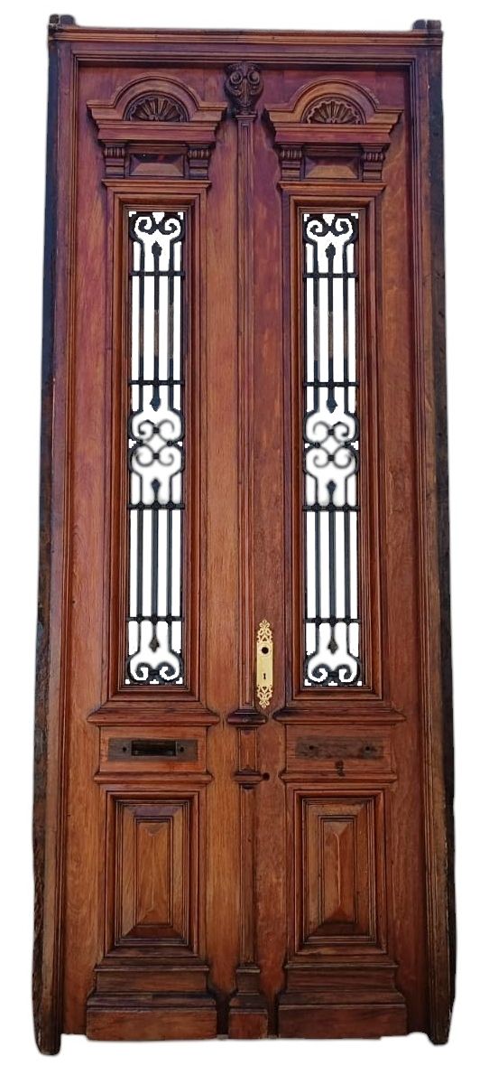 Antigua puerta de frente de madera cedro con cetol. Es a dos hojas de abrir, con rejas de hierro forjado, postigos vidriados de abrir, tapajunta, capitel y molduras superiores tallados, falleba, tableros replanados moldurados inferiores, faldones y marco de madera dura. La abertura no incluye los vidrios, la cerradura ni el picaporte. Hojas de 56x310cm.