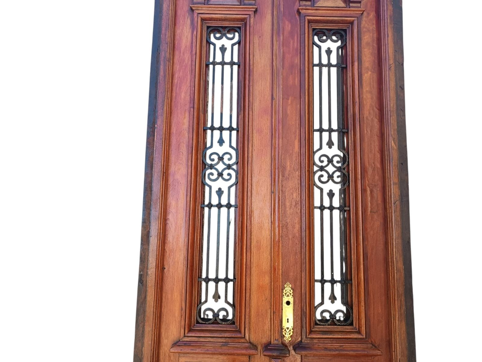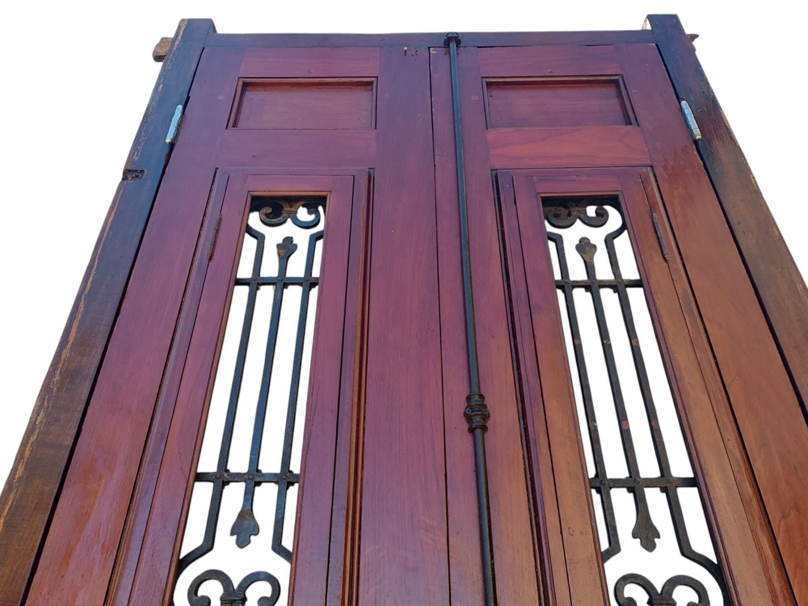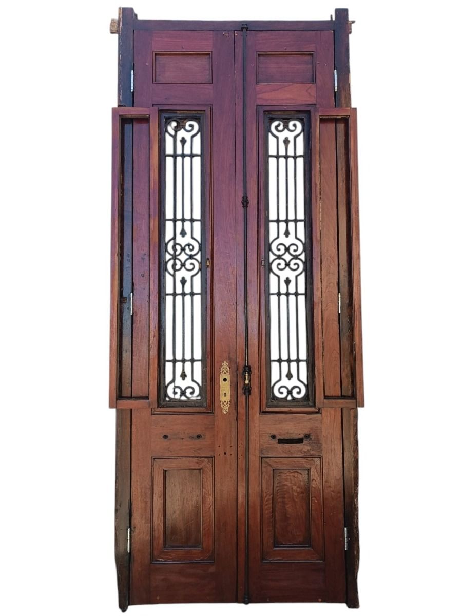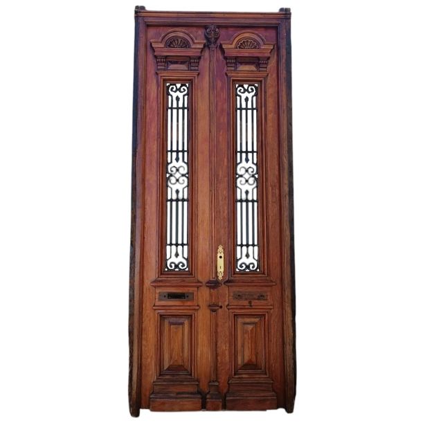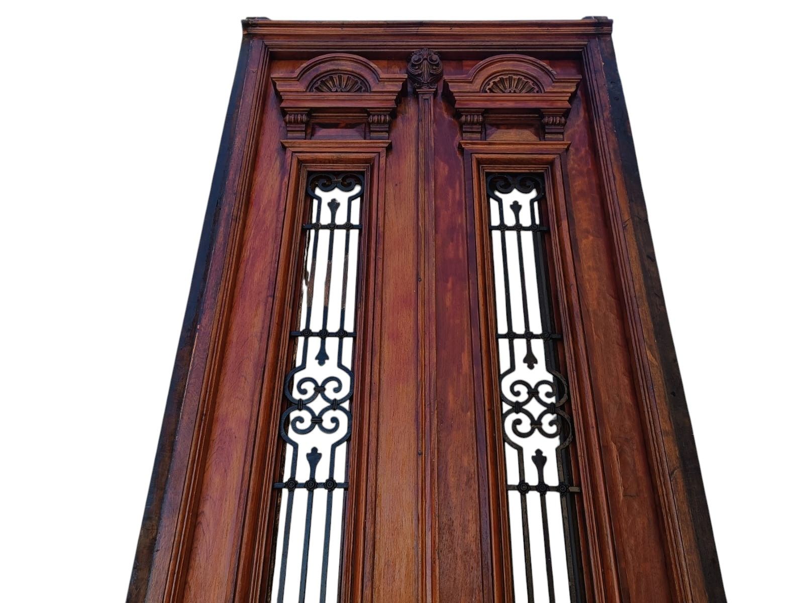 Antigua puerta de frente de madera cedro con cetol. Es a dos hojas de abrir, con rejas de hierro forjado, postigos vidriados de abrir, tapajunta, capitel y molduras superiores tallados, falleba, tableros replanados moldurados inferiores, faldones y marco de madera dura. La abertura no incluye los vidrios, la cerradura ni el picaporte. Hojas de 56x310cm.