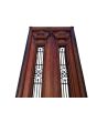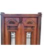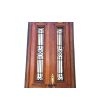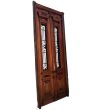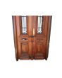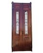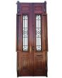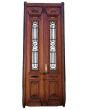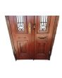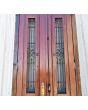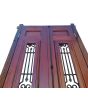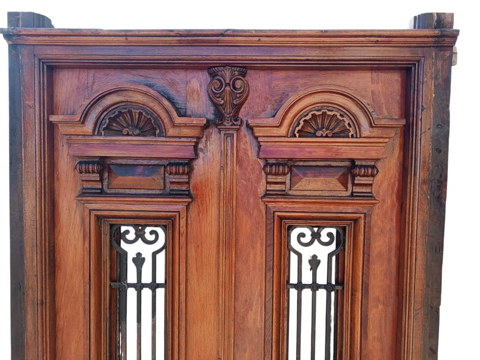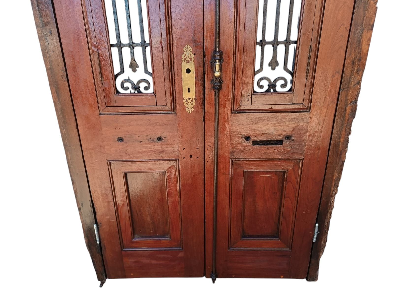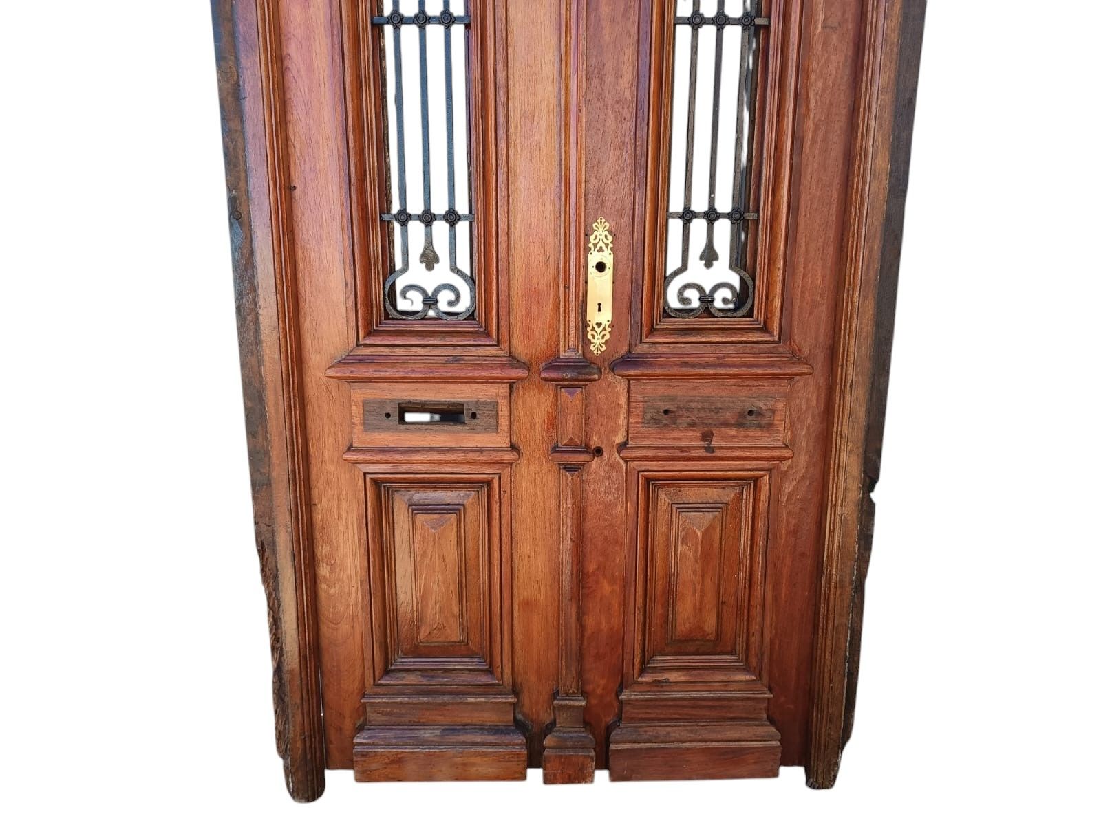 Antigua puerta de frente de madera cedro con cetol. Es a dos hojas de abrir, con rejas de hierro forjado, postigos vidriados de abrir, tapajunta, capitel y molduras superiores tallados, falleba, tableros replanados moldurados inferiores, faldones y marco de madera dura. La abertura no incluye los vidrios, la cerradura ni el picaporte. Hojas de 56x310cm.