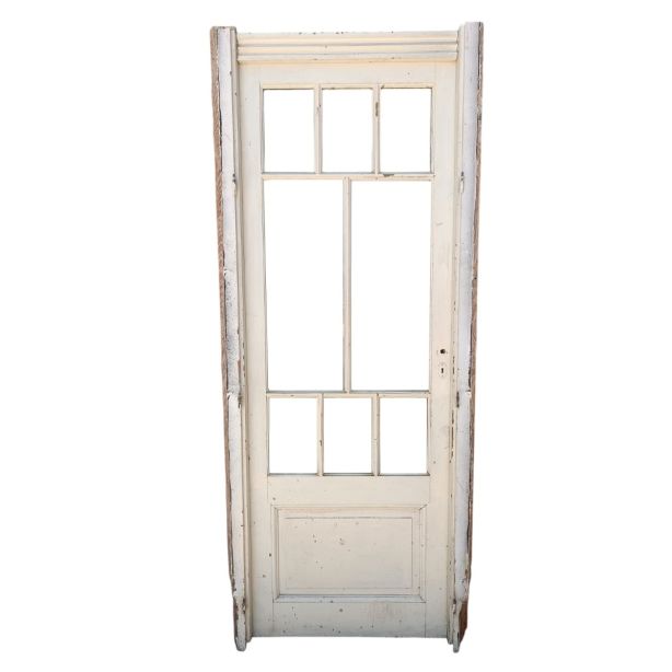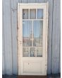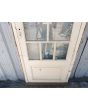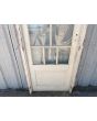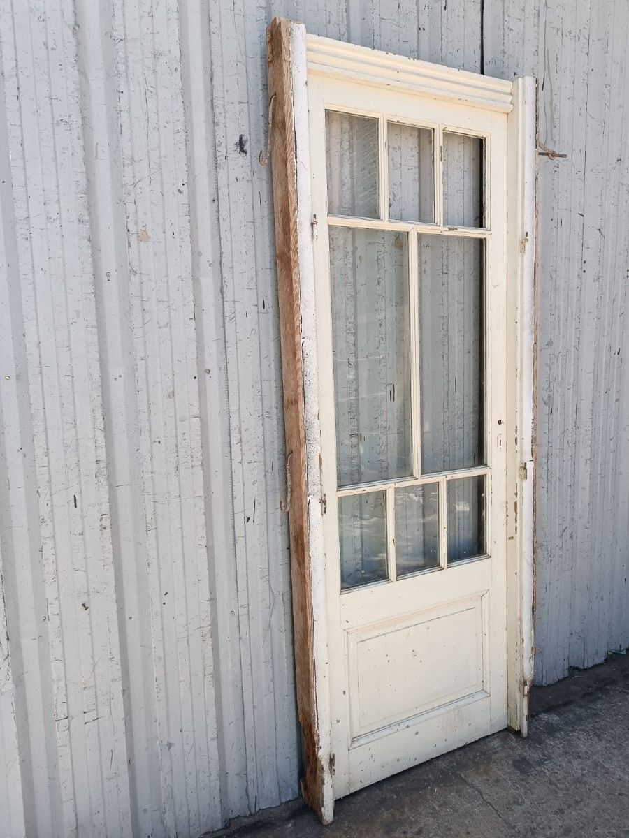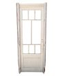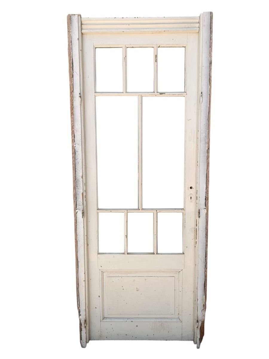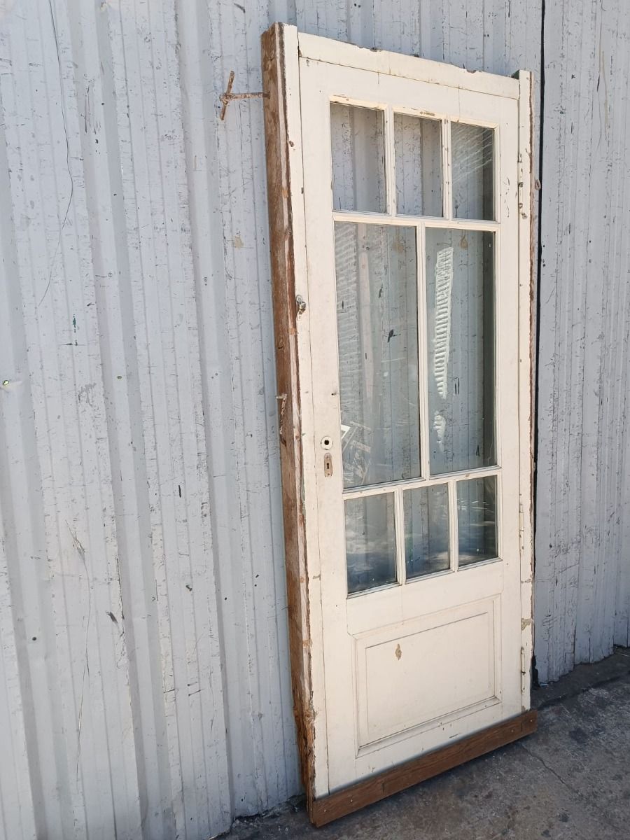 Antigua puerta de madera cedro pintada de blanco. Es a una hoja de abrir hacia la izquierda con vidrios tipo repartidos, tablero doble replanado inferior y marco de madera dura. Hoja de 76x213cm.