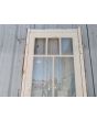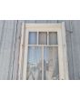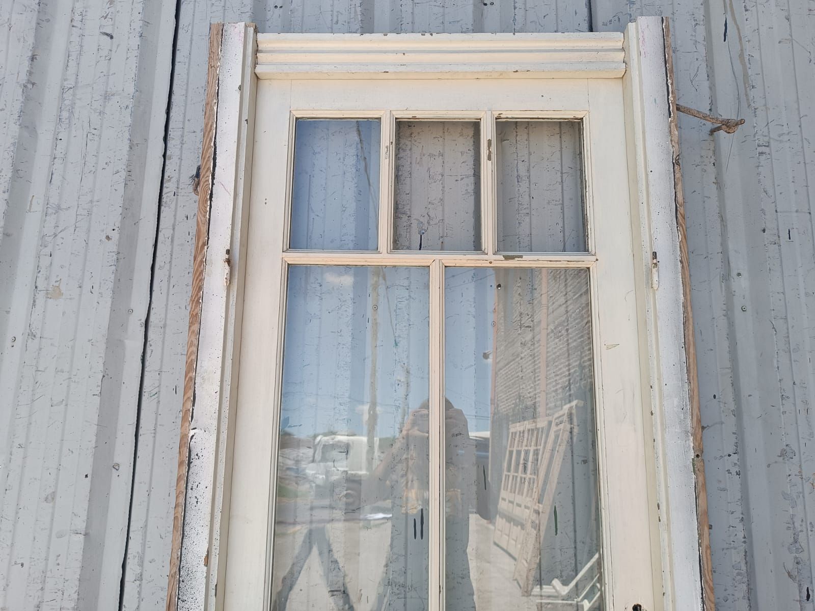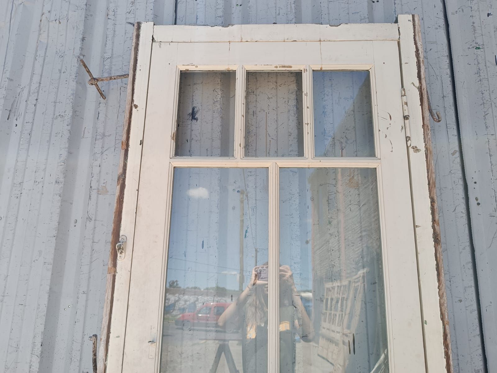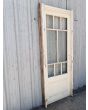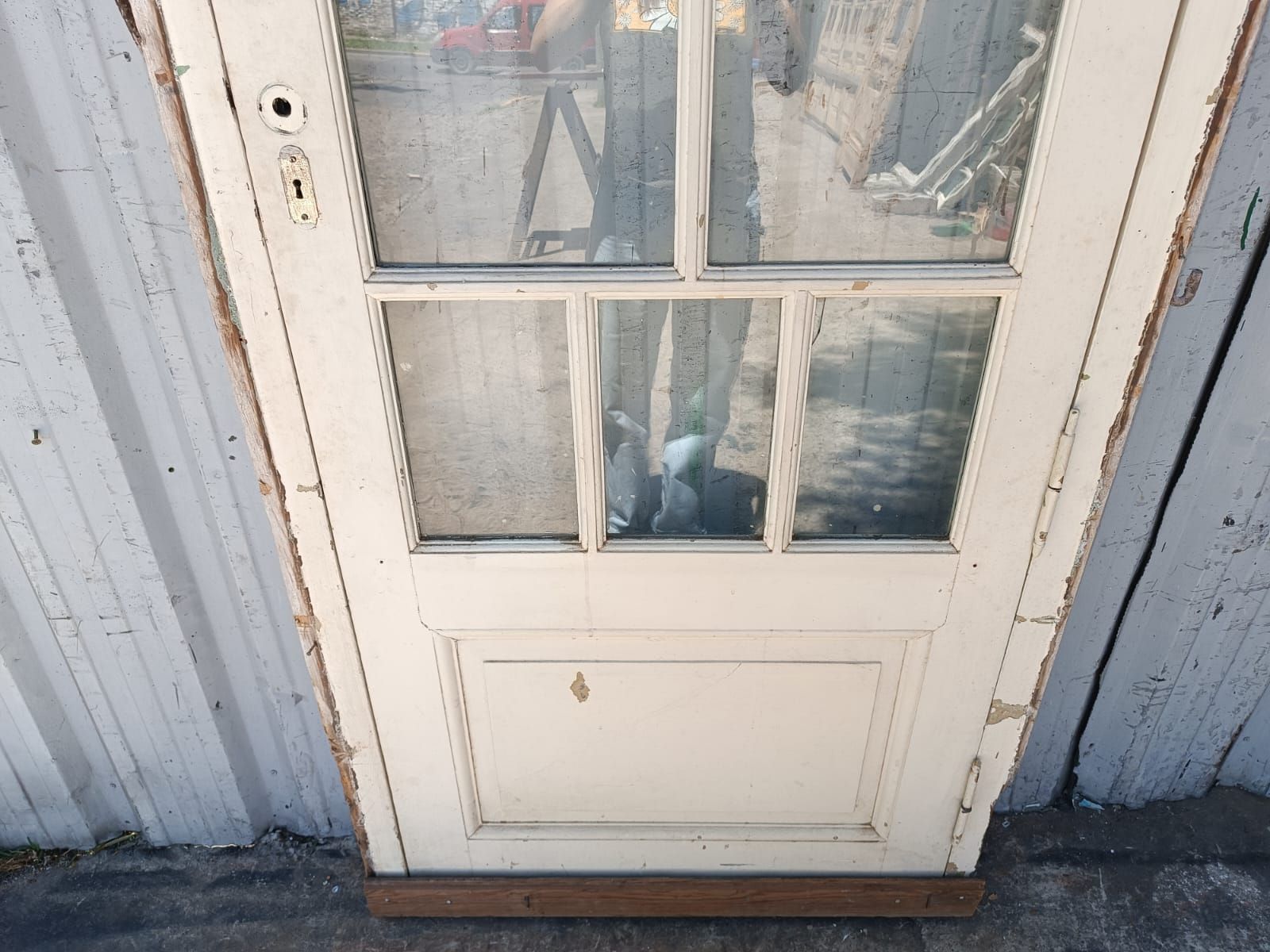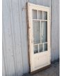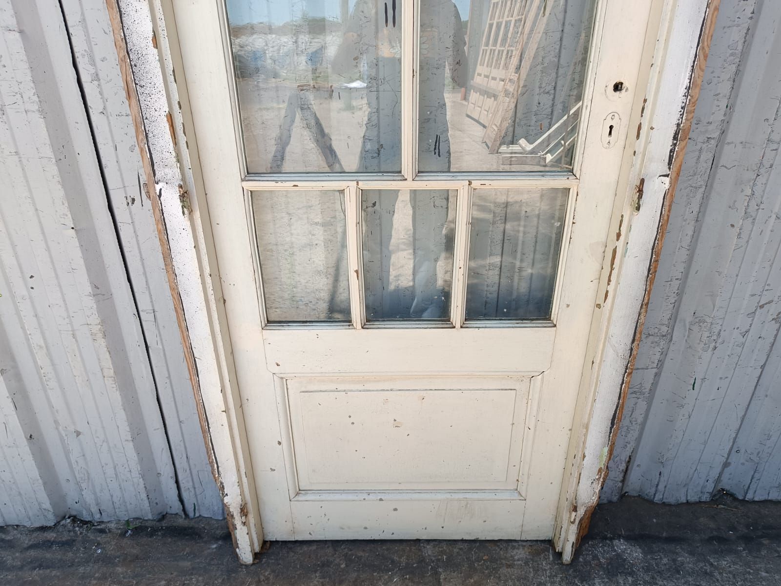 Antigua puerta de madera cedro pintada de blanco. Es a una hoja de abrir hacia la izquierda con vidrios tipo repartidos, tablero doble replanado inferior y marco de madera dura. Hoja de 76x213cm.