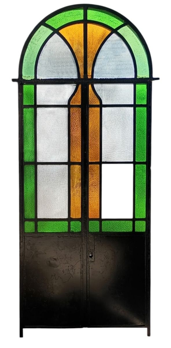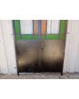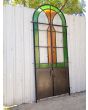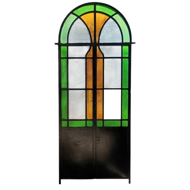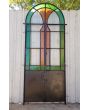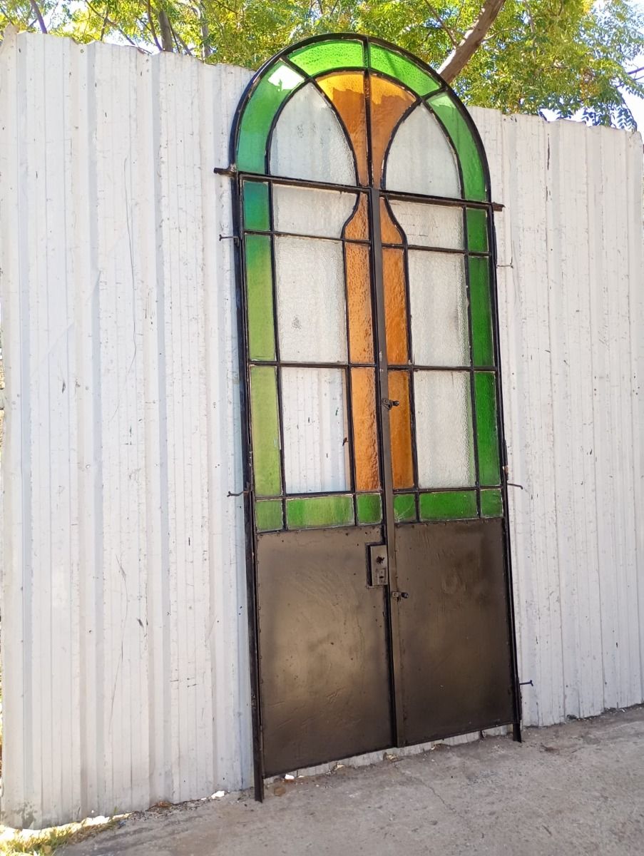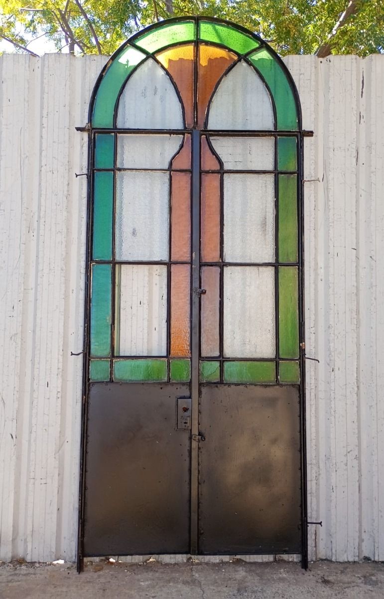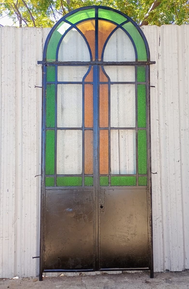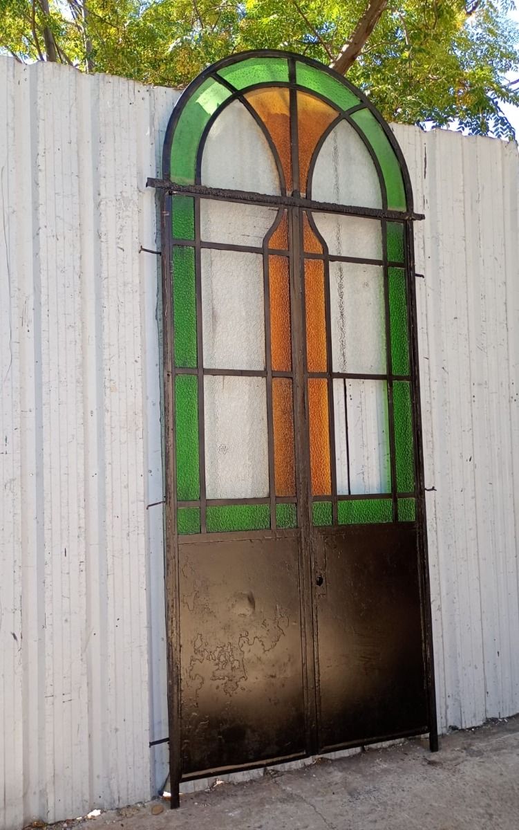 Antigua puerta tipo mampara de hierro. Es a dos hojas de abrir, con vidrios tipo repartidos, chapón inferior, guarda para vidrios de color, banderola fija medio punto y marco de hierro. La abertura no incluye todos los vidrios, cerradura ni picaporte. Hoja de 62x247cm.