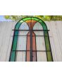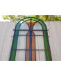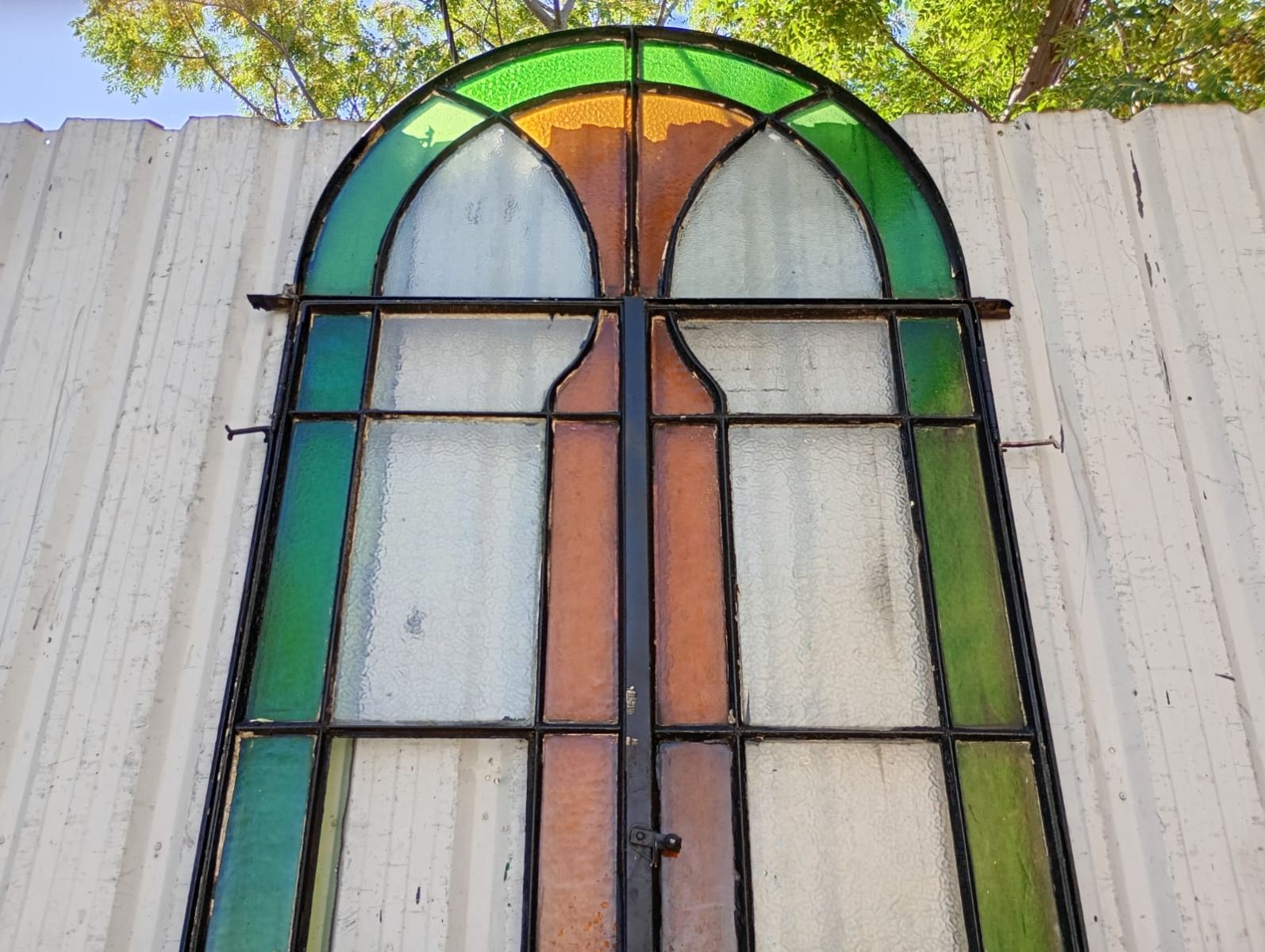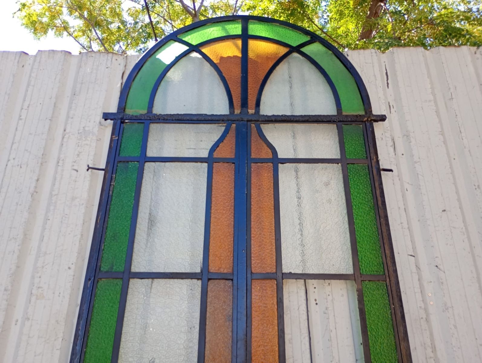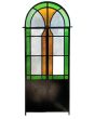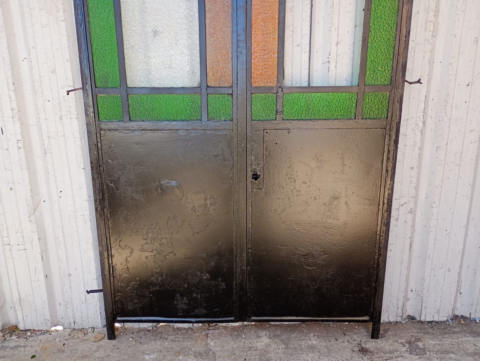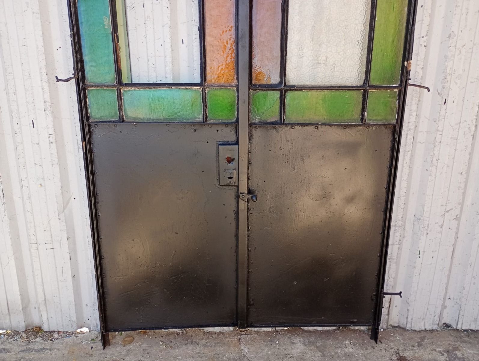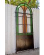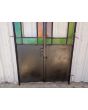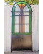 Antigua puerta tipo mampara de hierro. Es a dos hojas de abrir, con vidrios tipo repartidos, chapón inferior, guarda para vidrios de color, banderola fija medio punto y marco de hierro. La abertura no incluye todos los vidrios, cerradura ni picaporte. Hoja de 62x247cm.