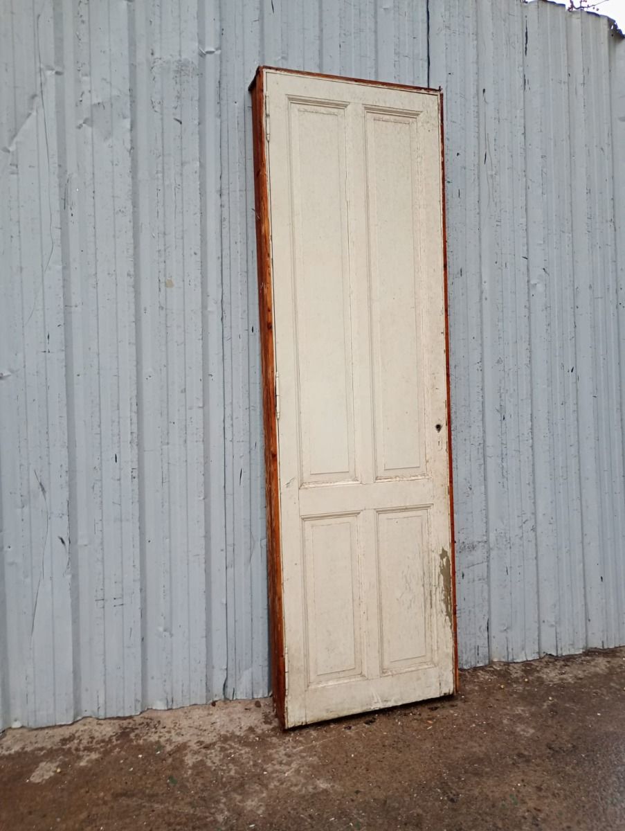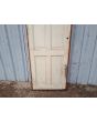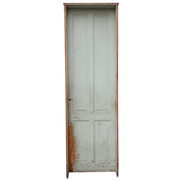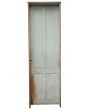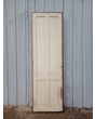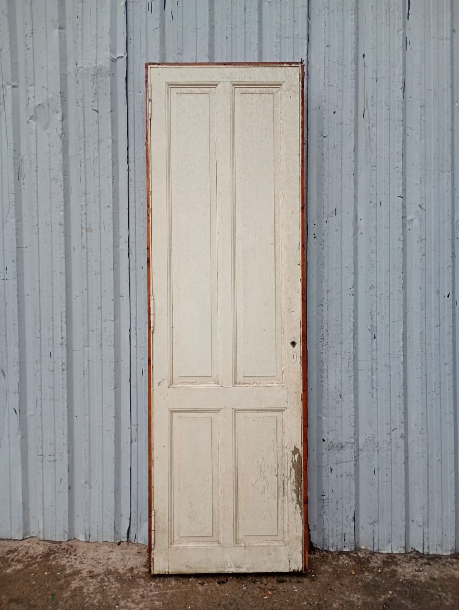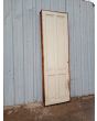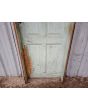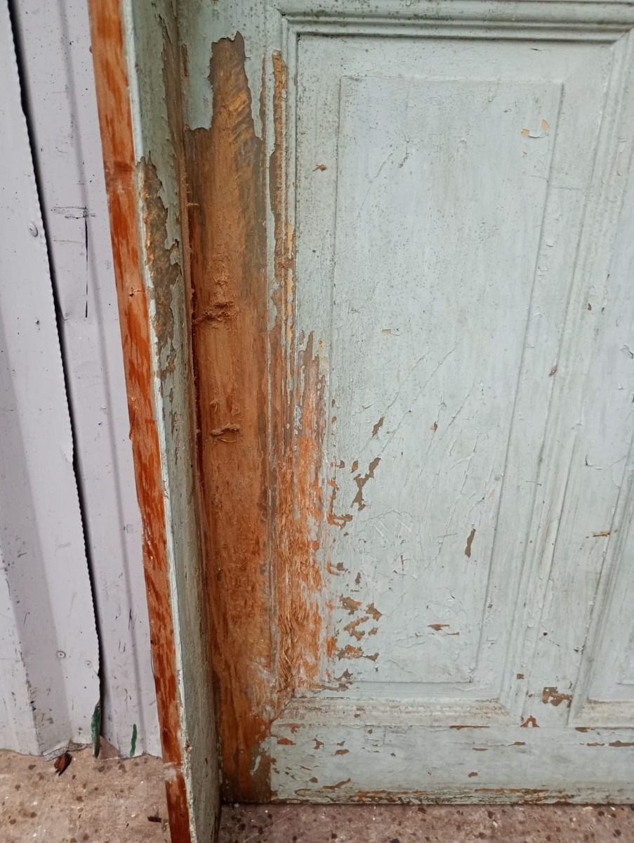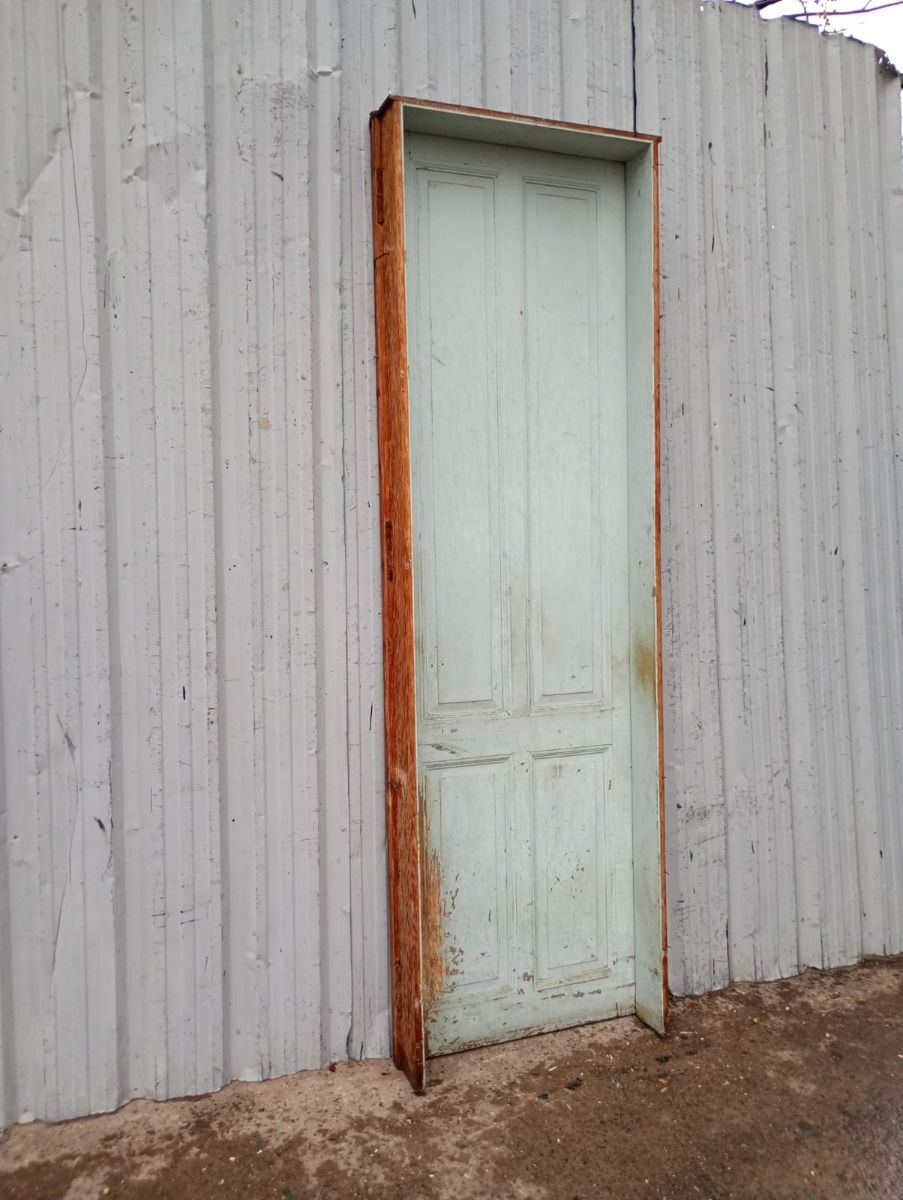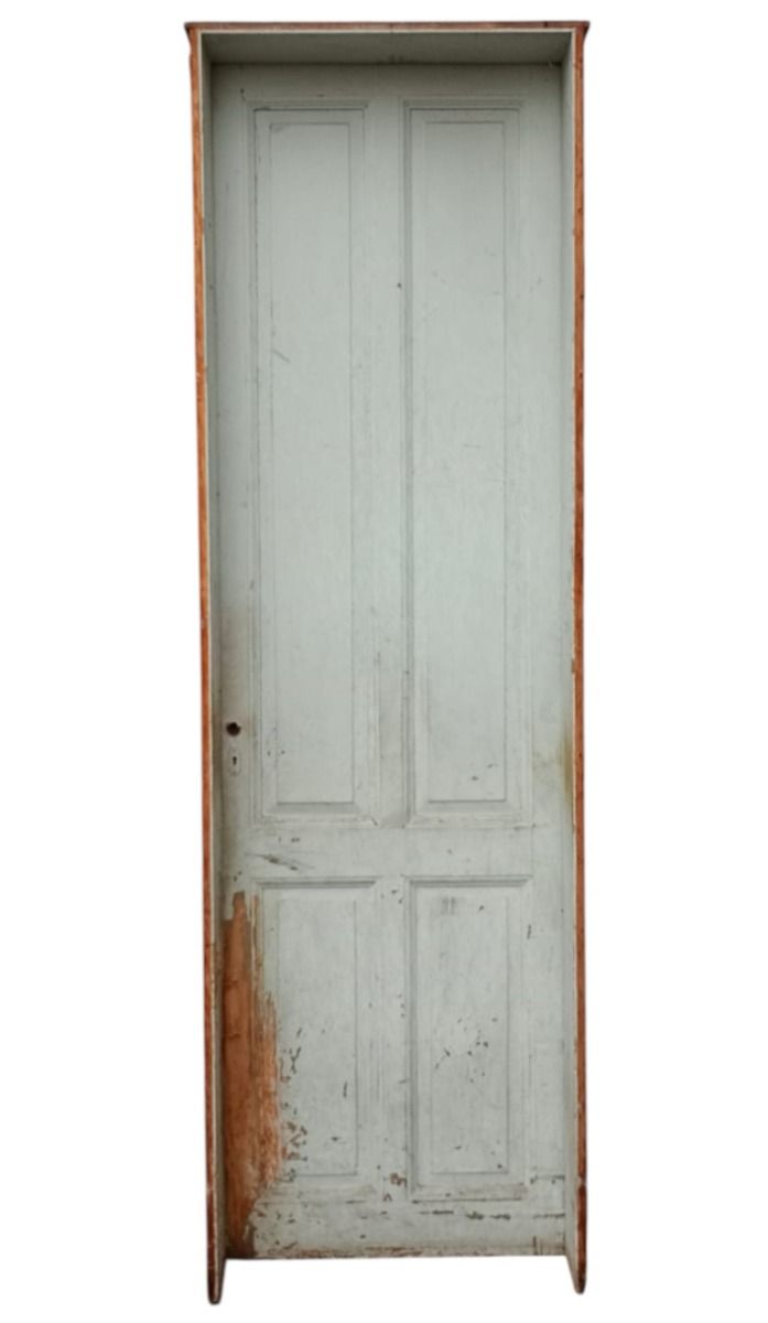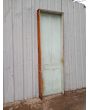 Antigua puerta tablero de madera cedro pintada. Es a una hoja de abrir hacia la derecha, con tableros doble replanados y marco tipo cajón de madera. La abertura no incluye cerradura ni picaporte. Hoja de 72x242cm