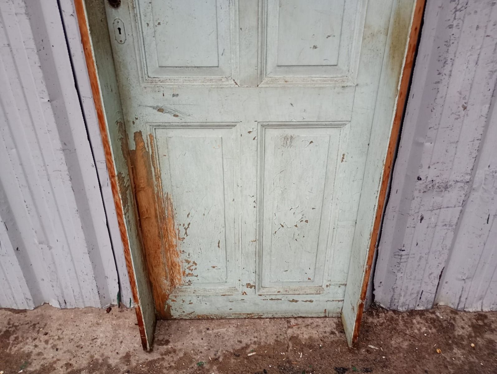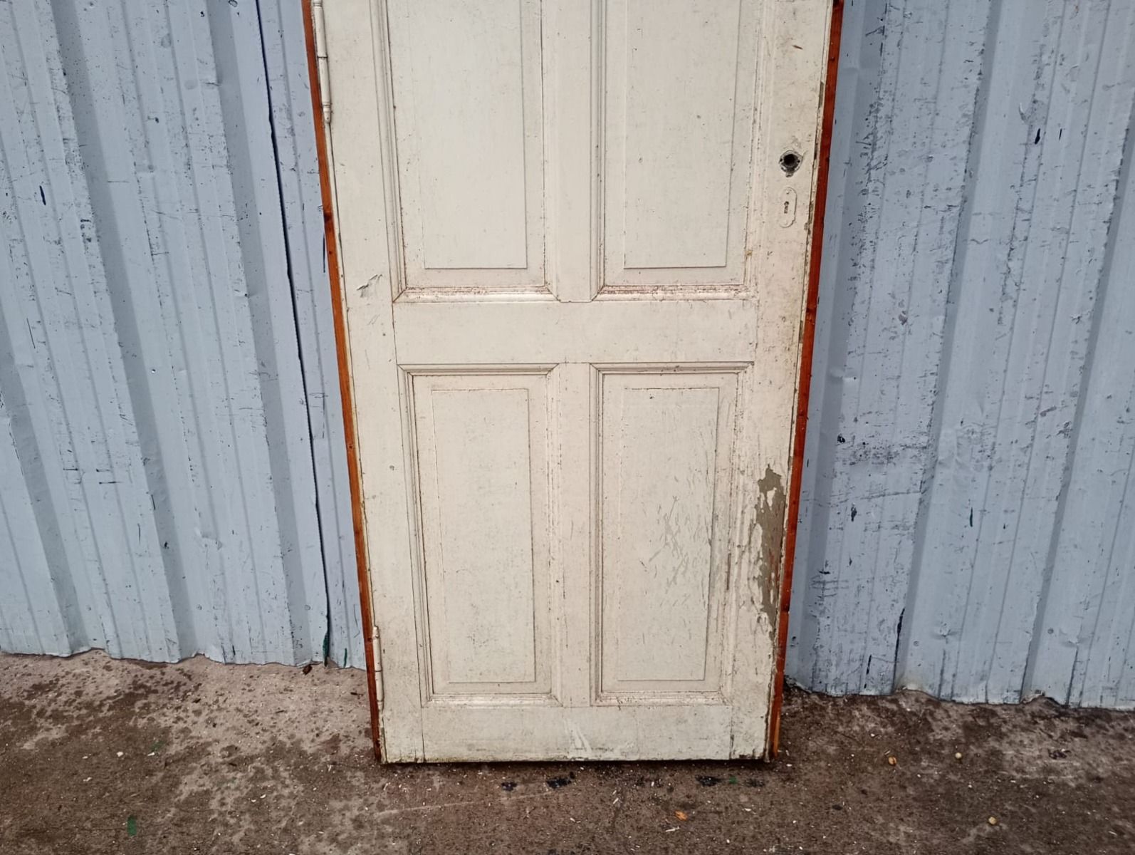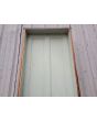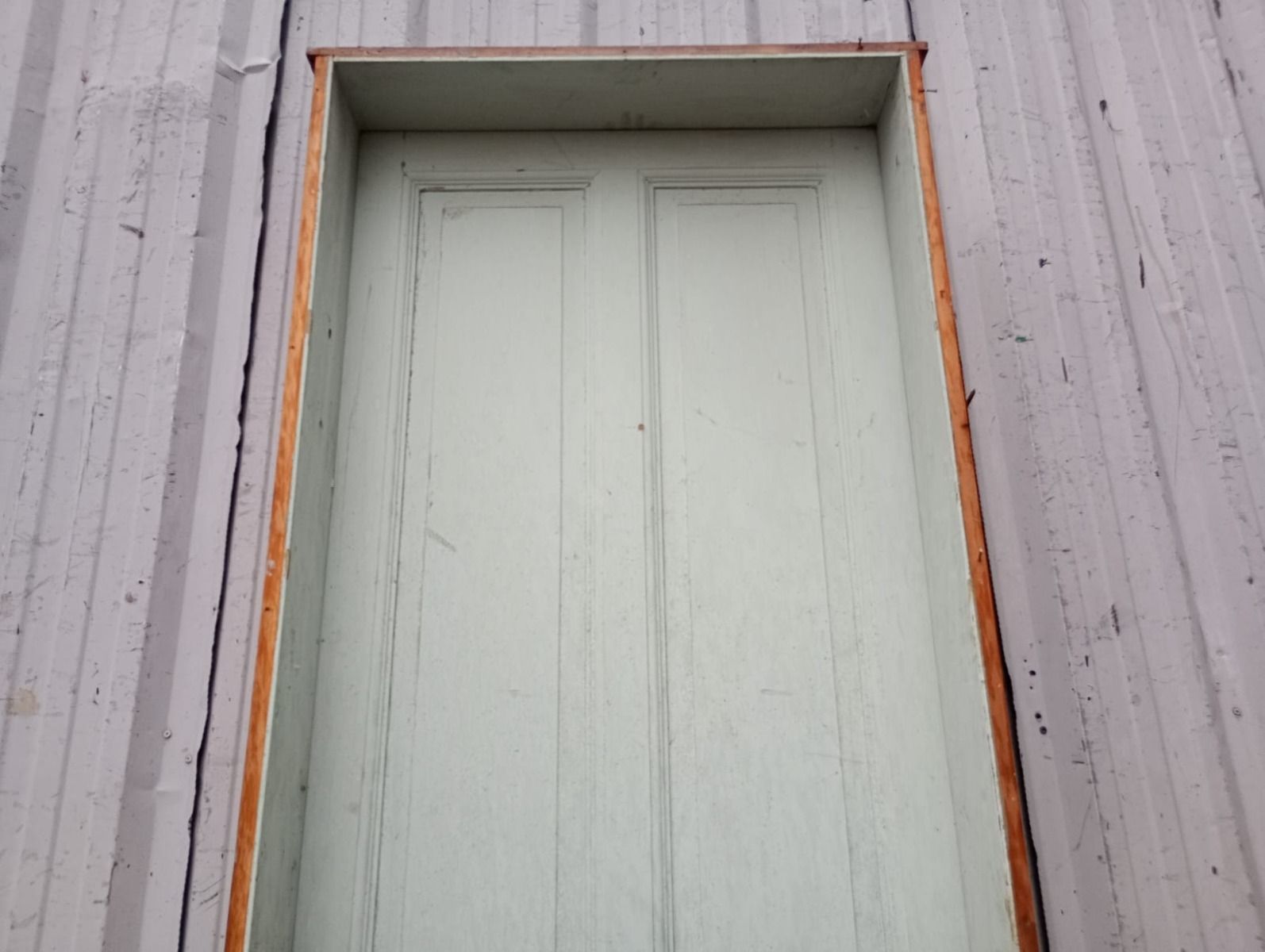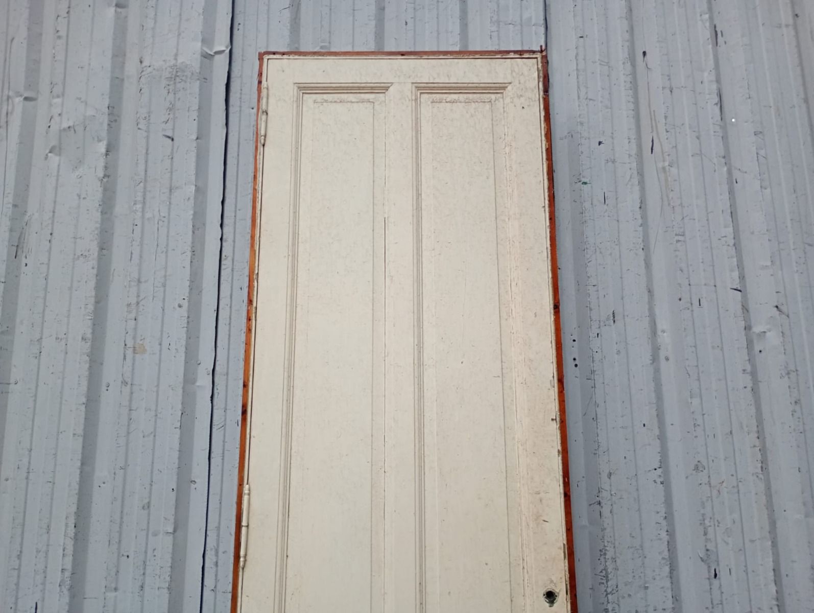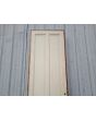 Antigua puerta tablero de madera cedro pintada. Es a una hoja de abrir hacia la derecha, con tableros doble replanados y marco tipo cajón de madera. La abertura no incluye cerradura ni picaporte. Hoja de 72x242cm