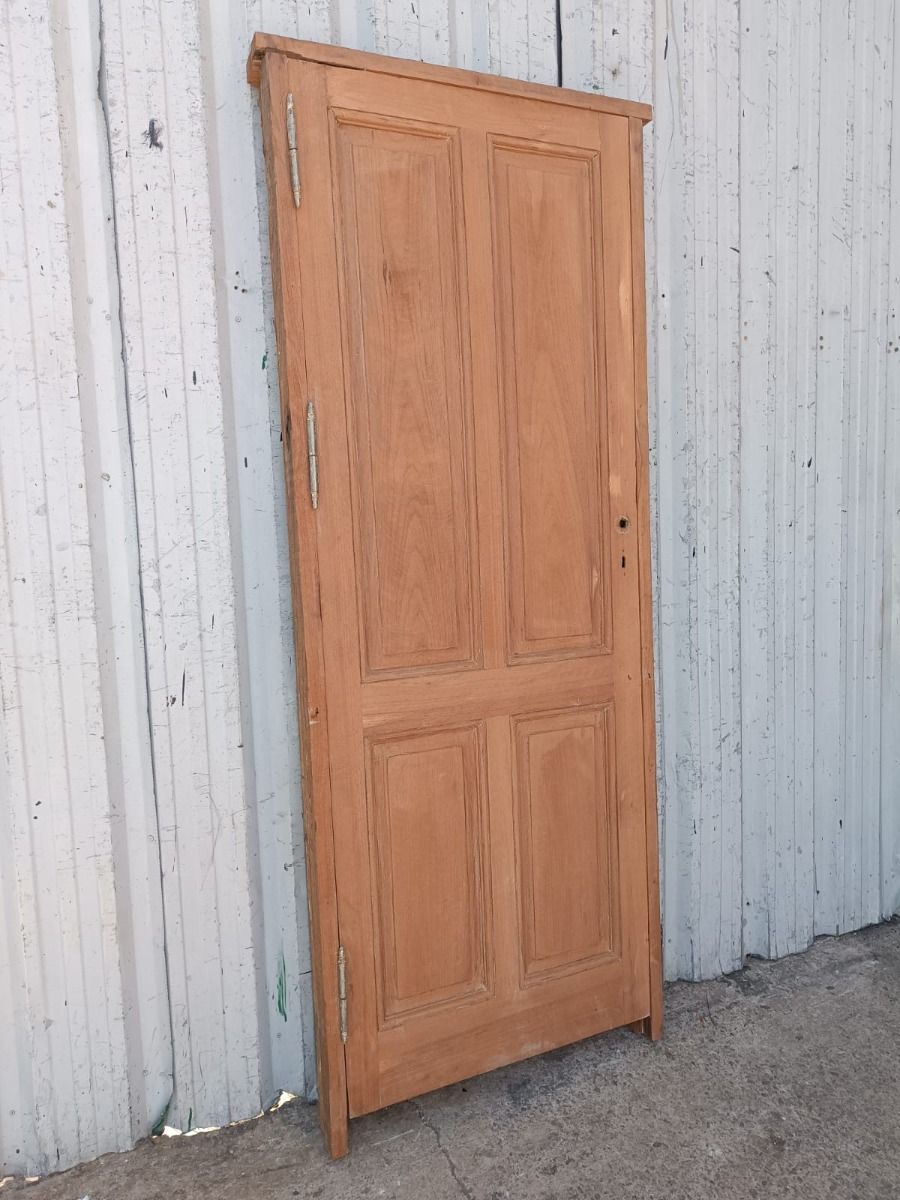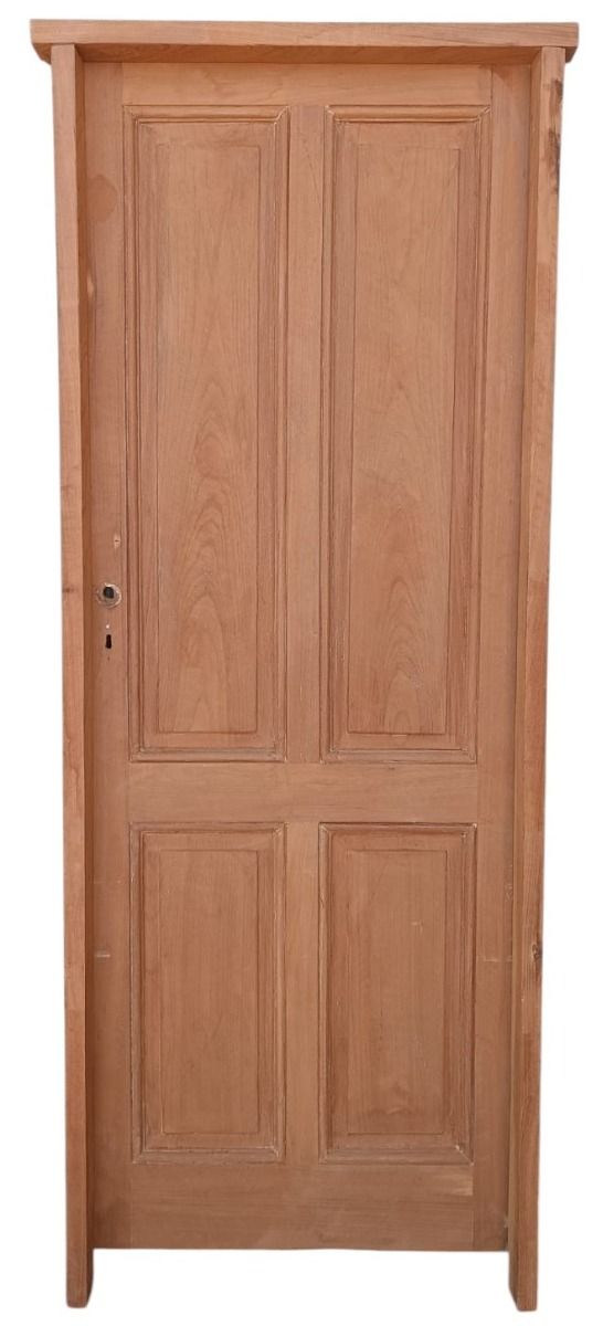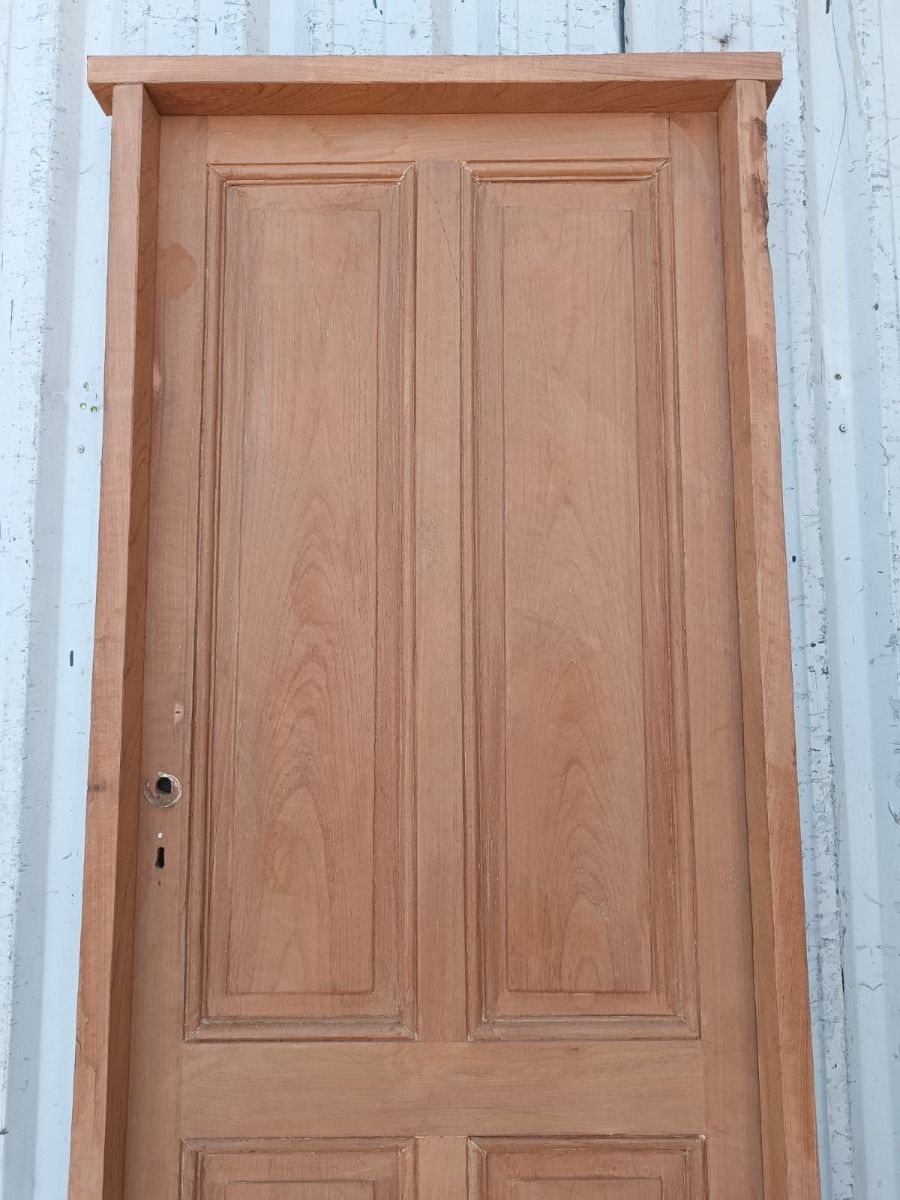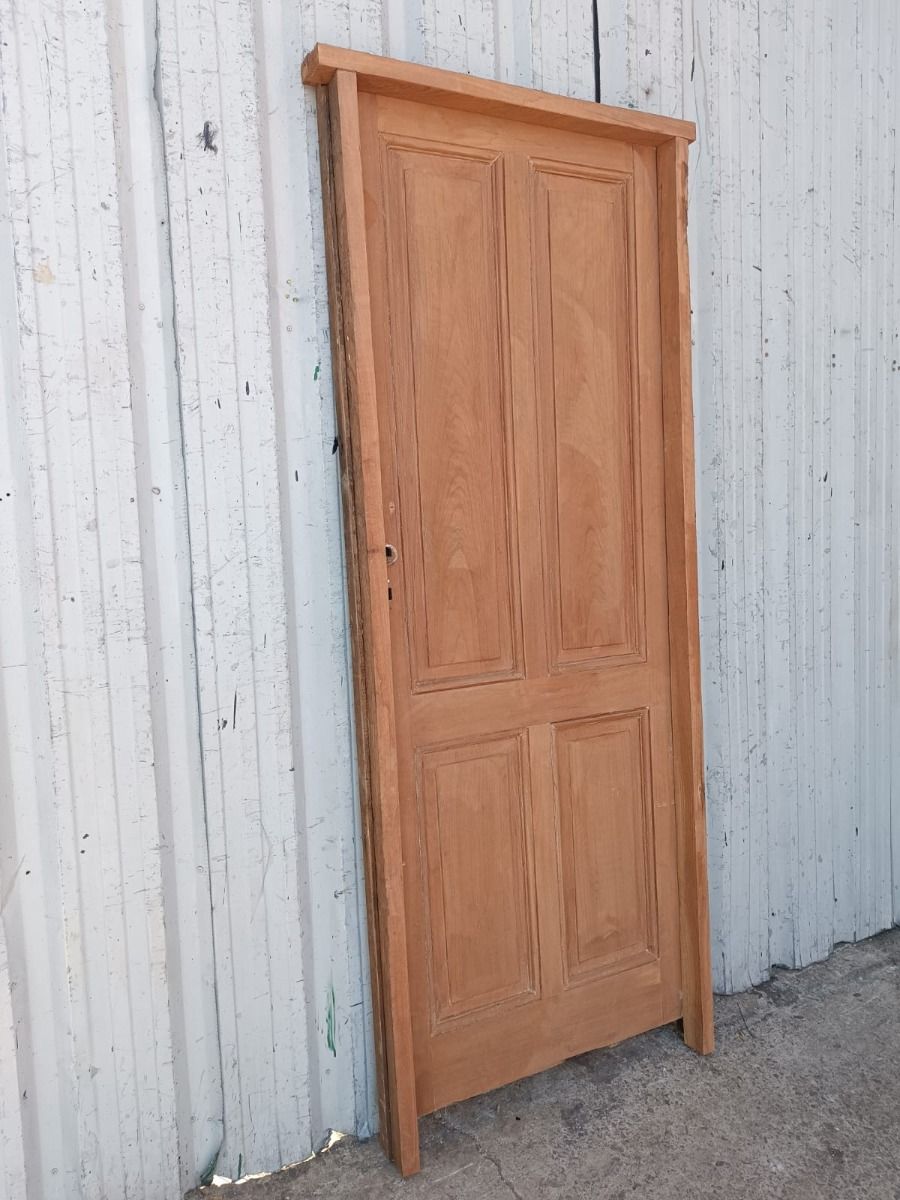 Antigua puerta tablero de madera cedro al natural. Es a una hoja de abrir hacia la derecha, con tableros doble replanados y marco de madera dura. La abertura no incluye cerradura, llave ni picaporte. Hoja de 73x200cm.