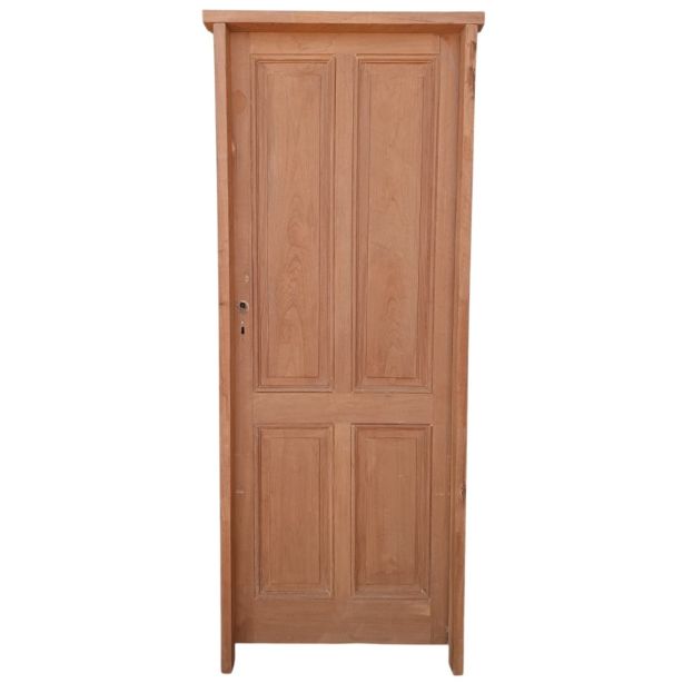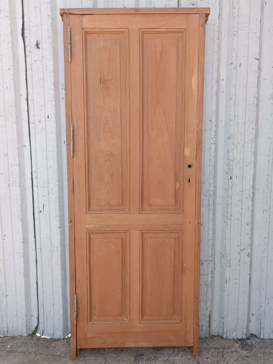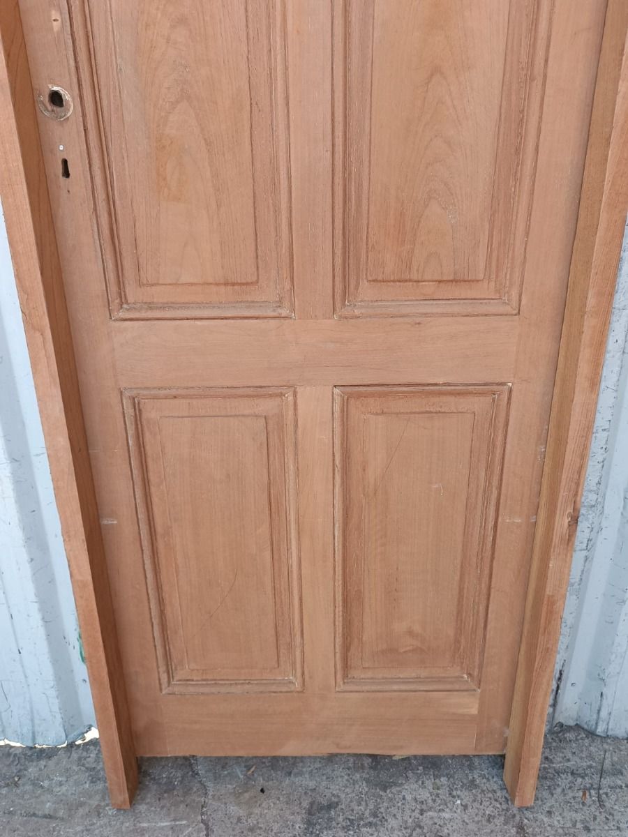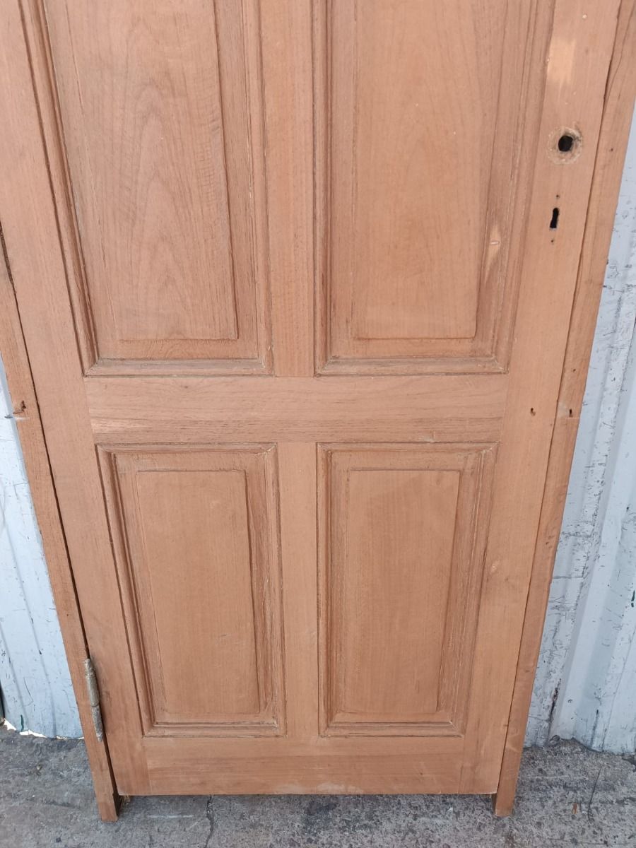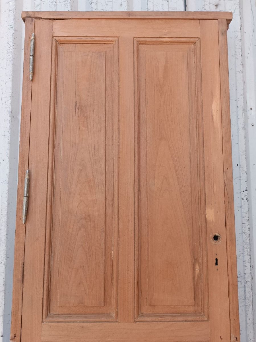Antigua puerta tablero de madera cedro al natural. Es a una hoja de abrir hacia la derecha, con tableros doble replanados y marco de madera dura. La abertura no incluye cerradura, llave ni picaporte. Hoja de 73x200cm.