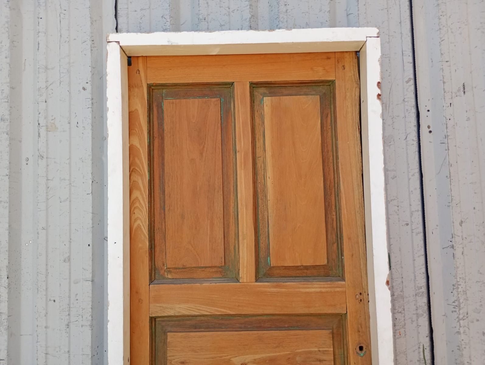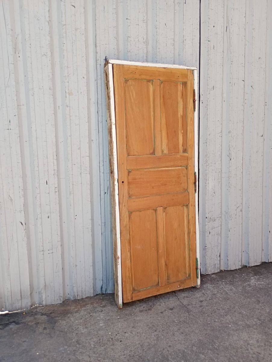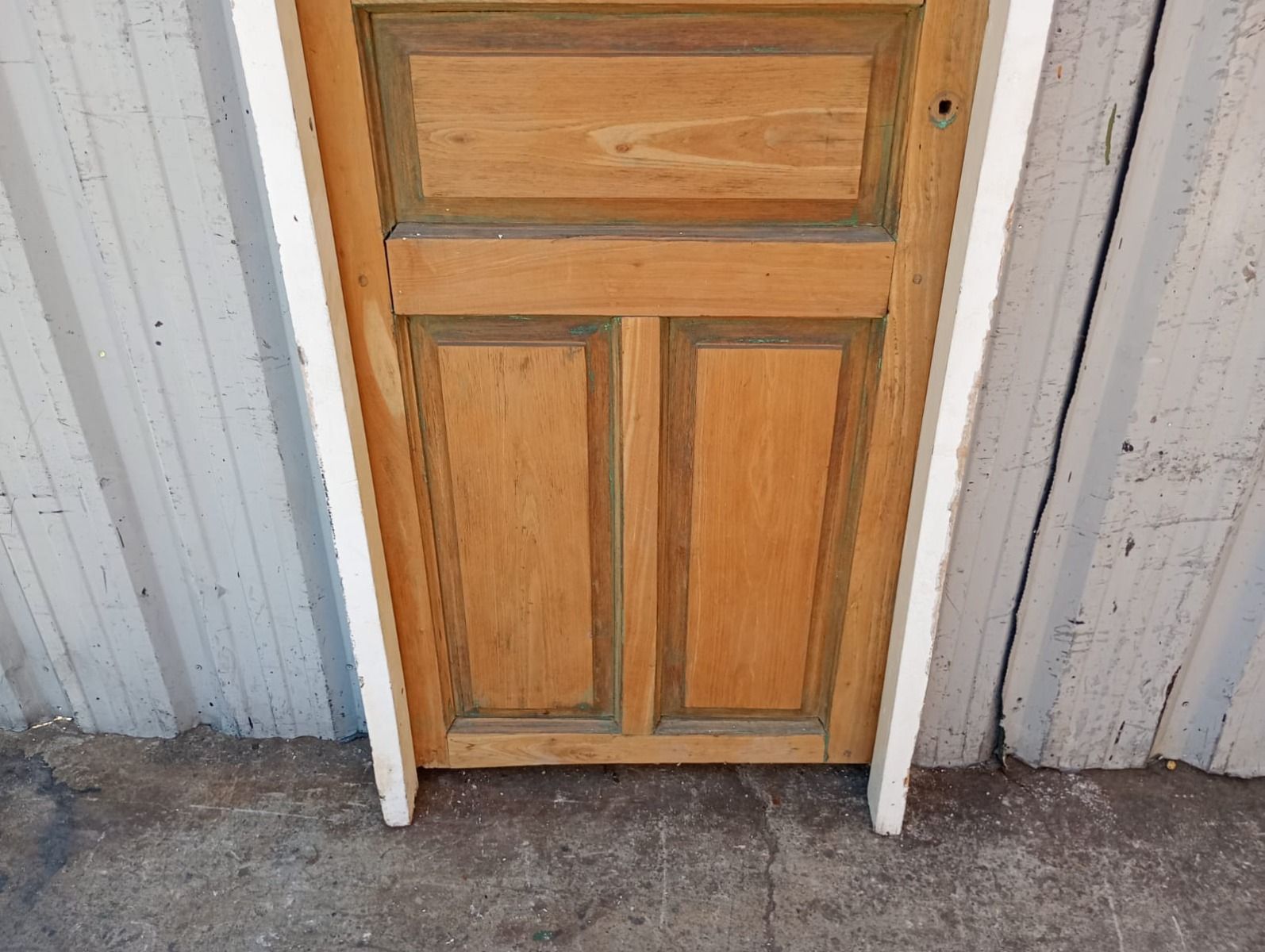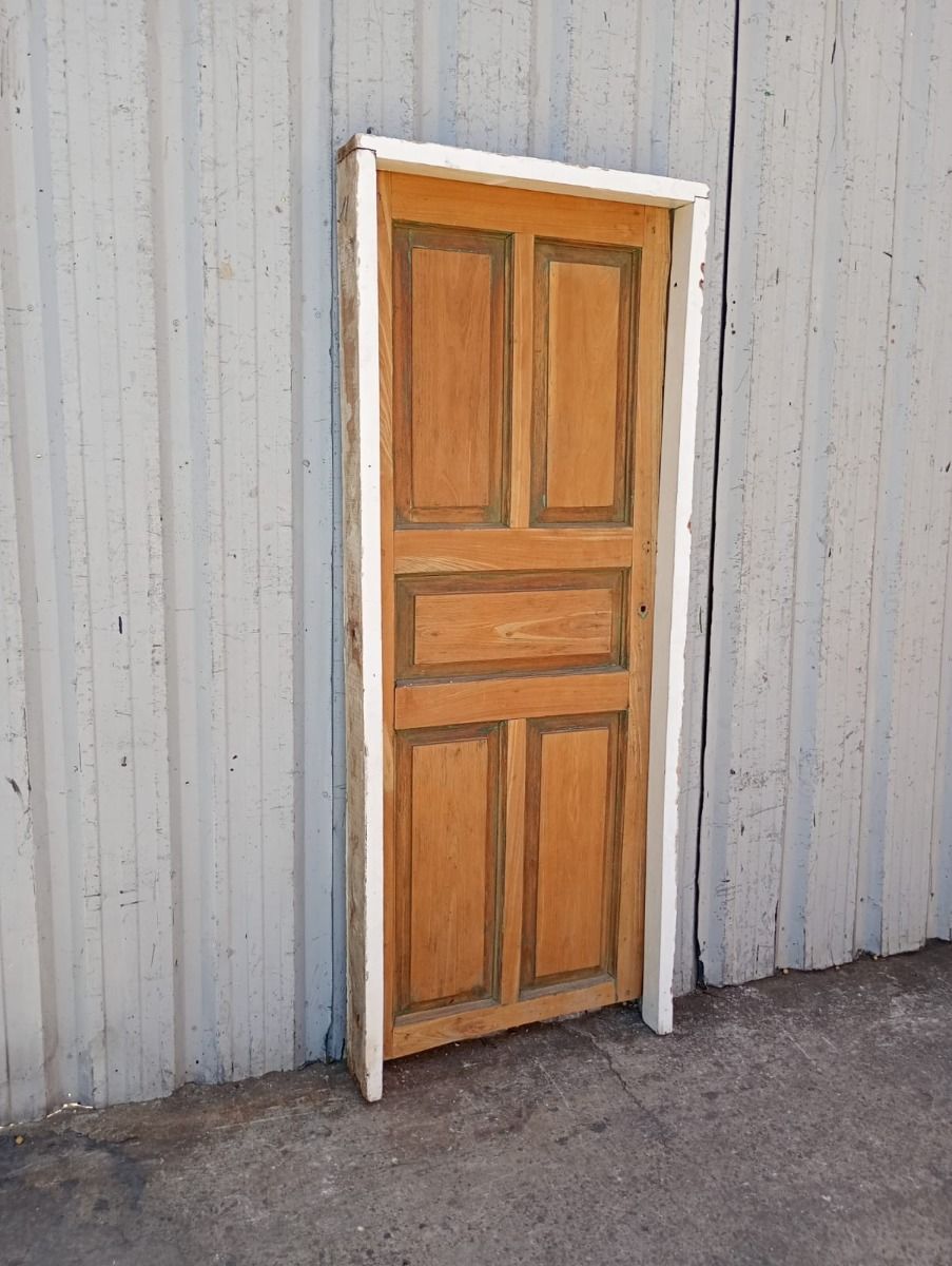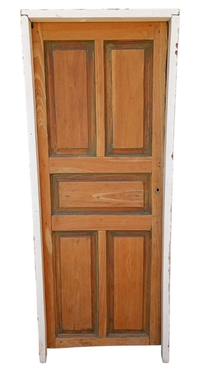 Antigua puerta tablero de madera cedro al natural. Es a una hoja de abrir hacia la izquierda, con tableros doble replanados y marco de madera dura. Su hoja tiene unas pequeñas averías que pueden observarse en las fotos. La abertura no incluye cerradura ni picaporte. Hoja de 70x185cm.