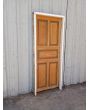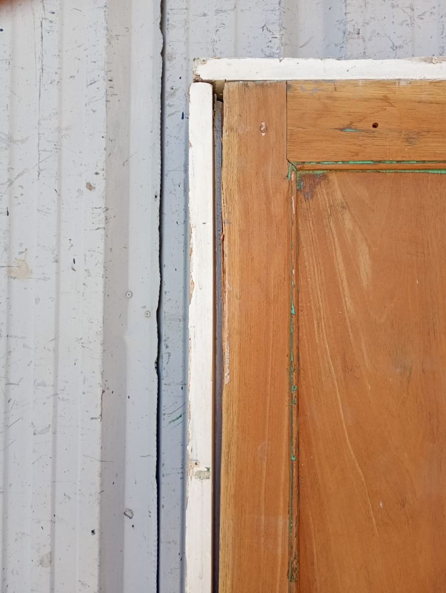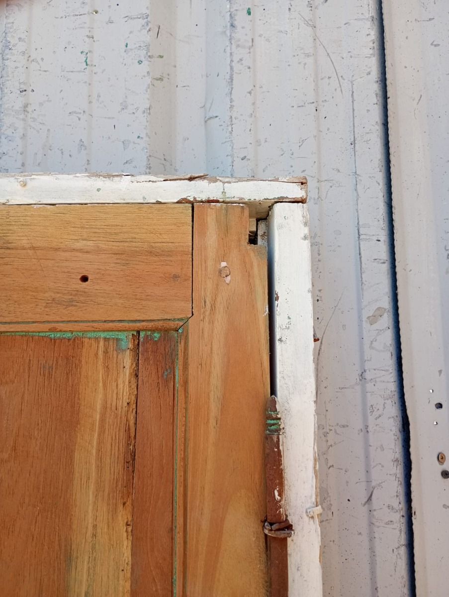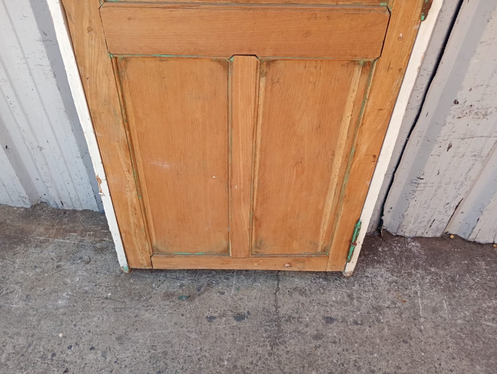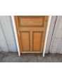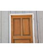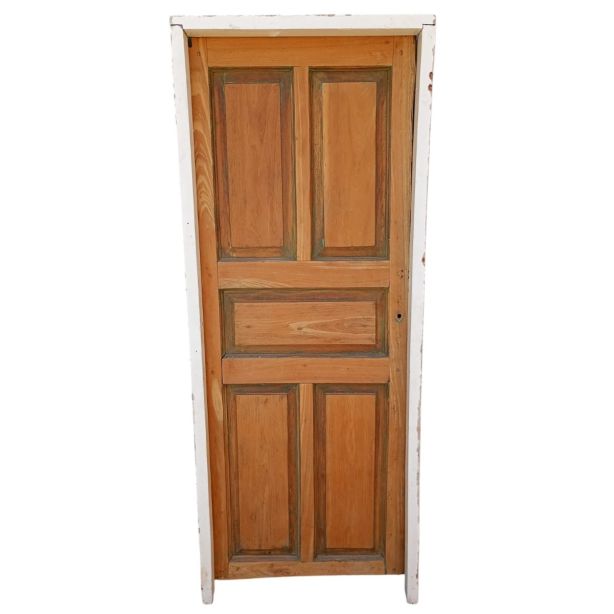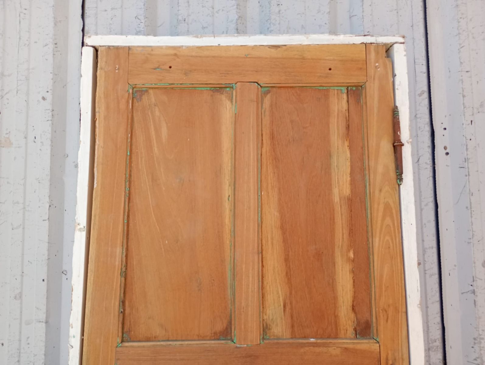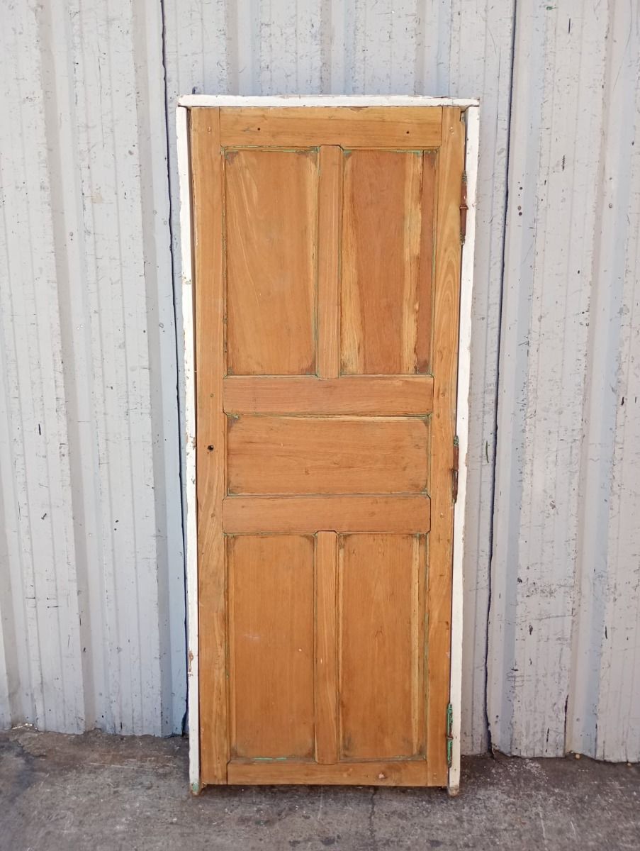 Antigua puerta tablero de madera cedro al natural. Es a una hoja de abrir hacia la izquierda, con tableros doble replanados y marco de madera dura. Su hoja tiene unas pequeñas averías que pueden observarse en las fotos. La abertura no incluye cerradura ni picaporte. Hoja de 70x185cm.