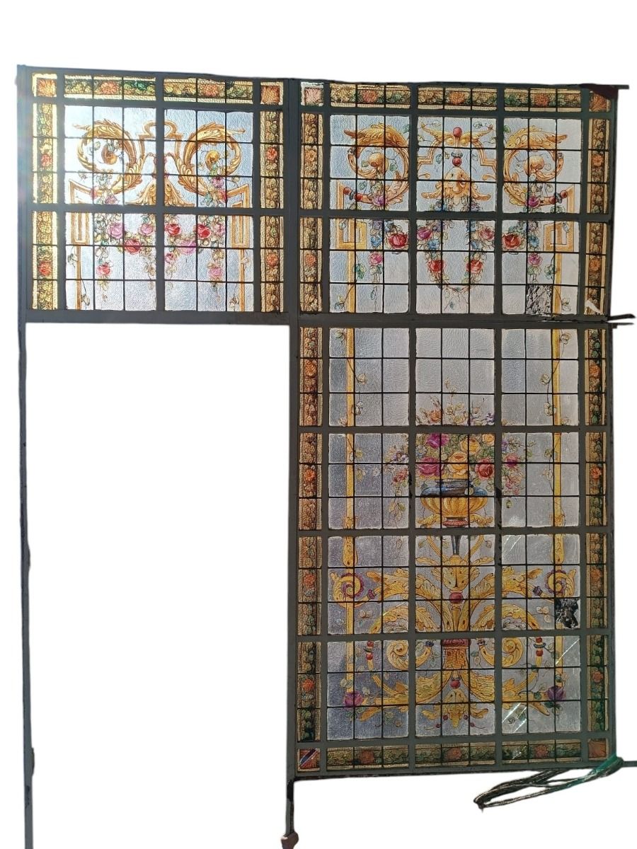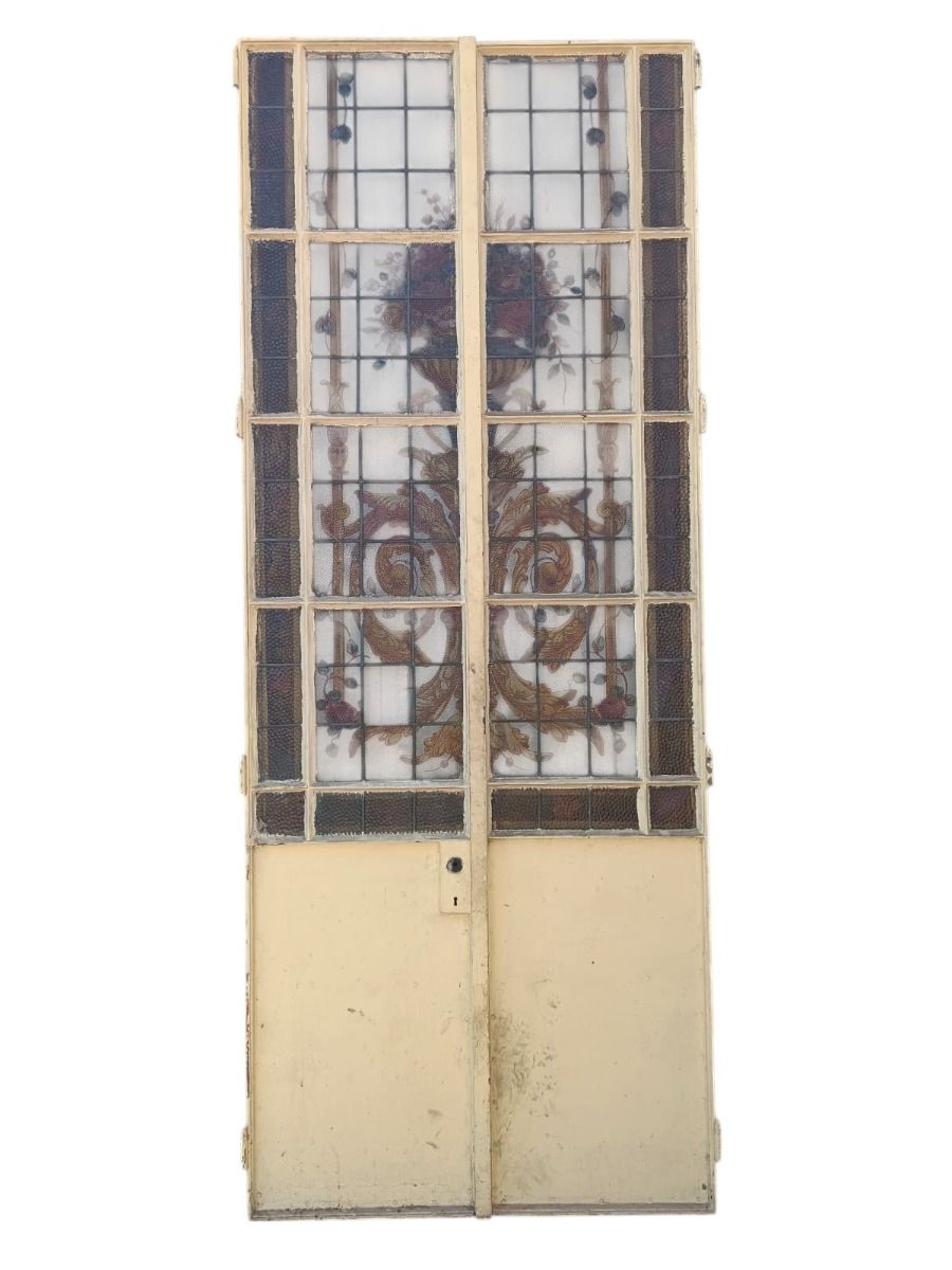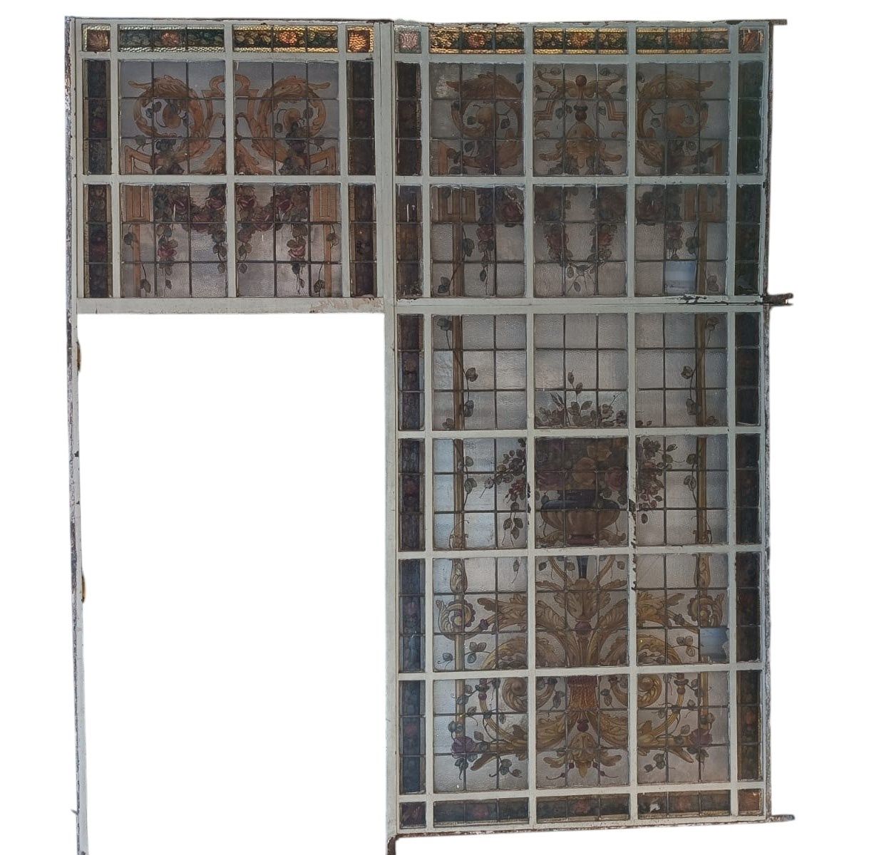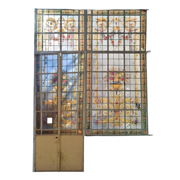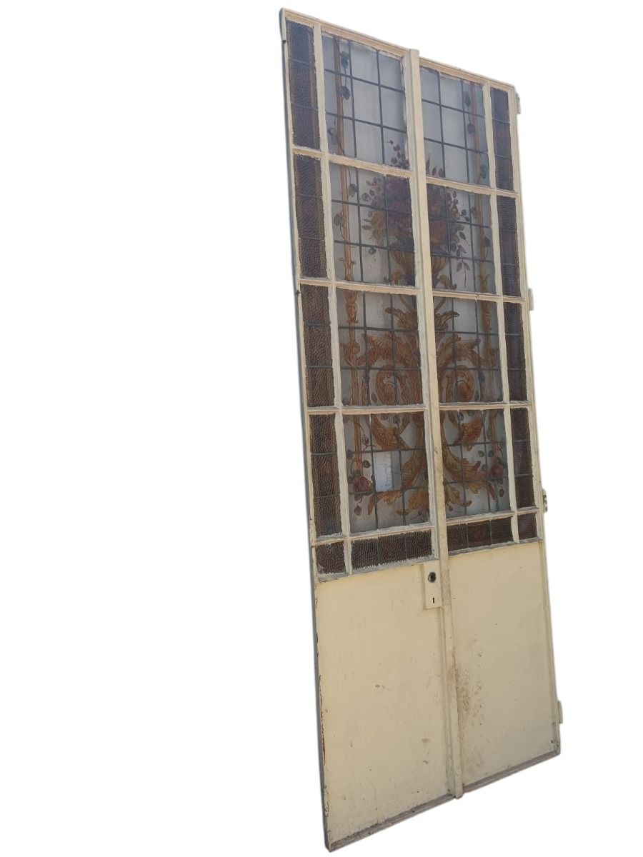 Antigua puerta tipo mampara de hierro pintada de amarillo. Es a dos hojas de abrir, con vitraux, paños fijos lateral y superior, molduras inferiores (en chapón de la puerta), trabas internas y marco de hierro. La abertura tiene algunas averías que pueden observarse en las fotografías. Imponente cerramiento proveniente de casona de estilo en CABA. La abertura no incluye todos los vidrios, la cerradura ni el picaporte. Su puerta tiene un ancho de 115cm, y sus hojas de 55x284cm. Su paño fijo lateral tiene 303cm de alto.