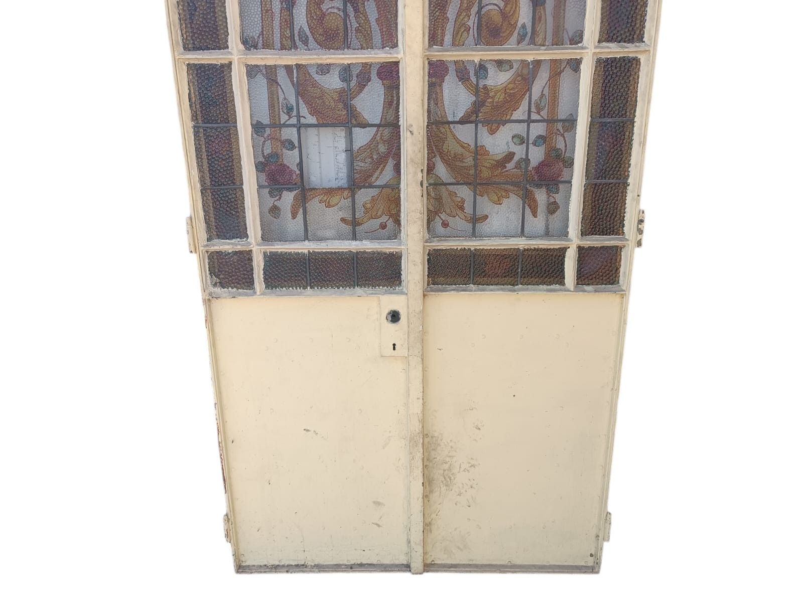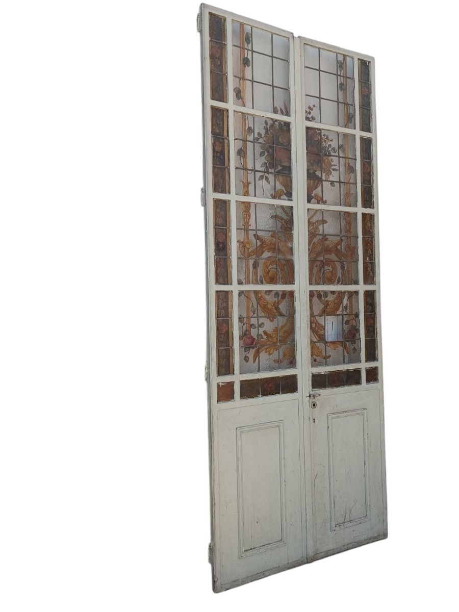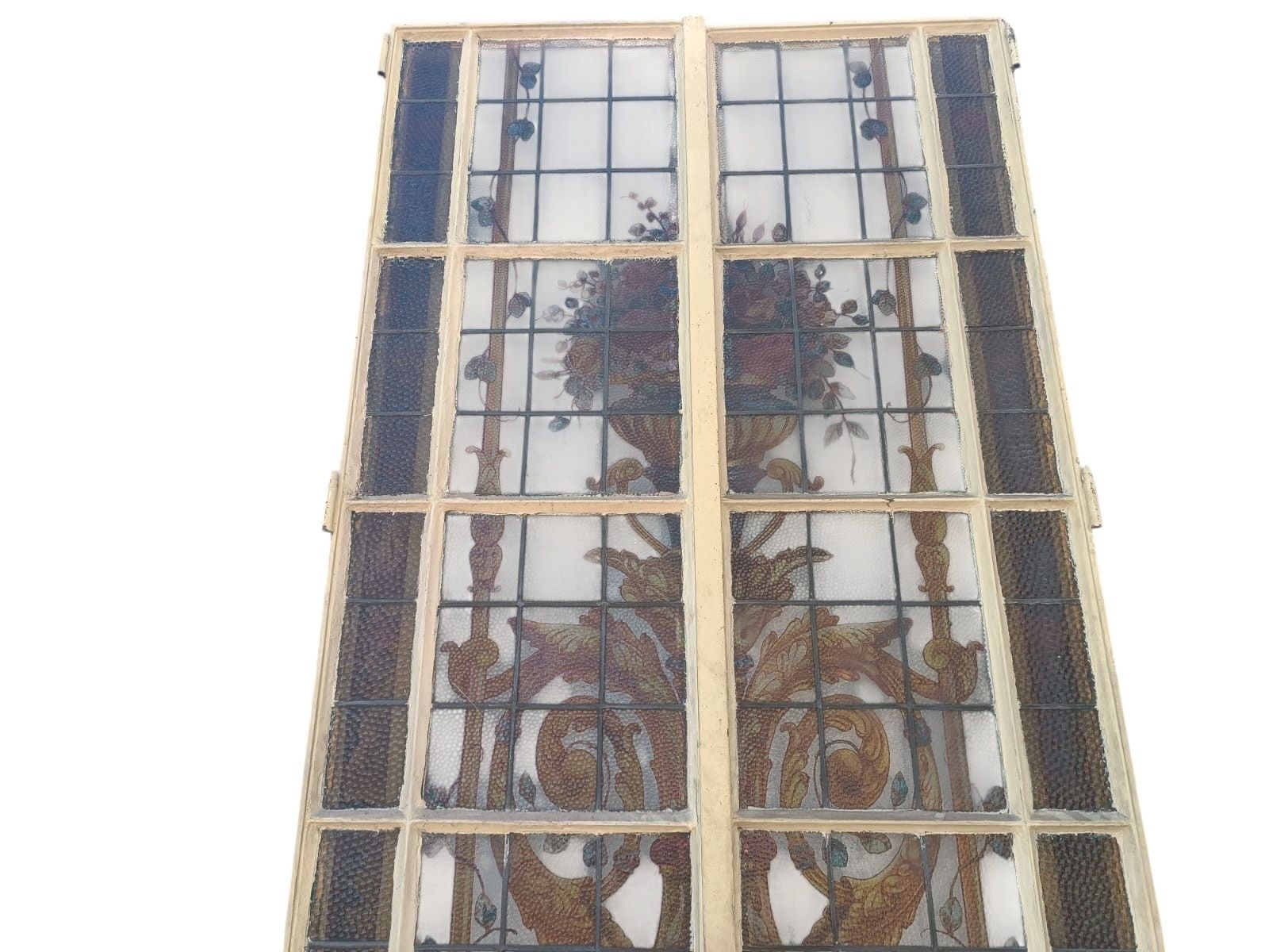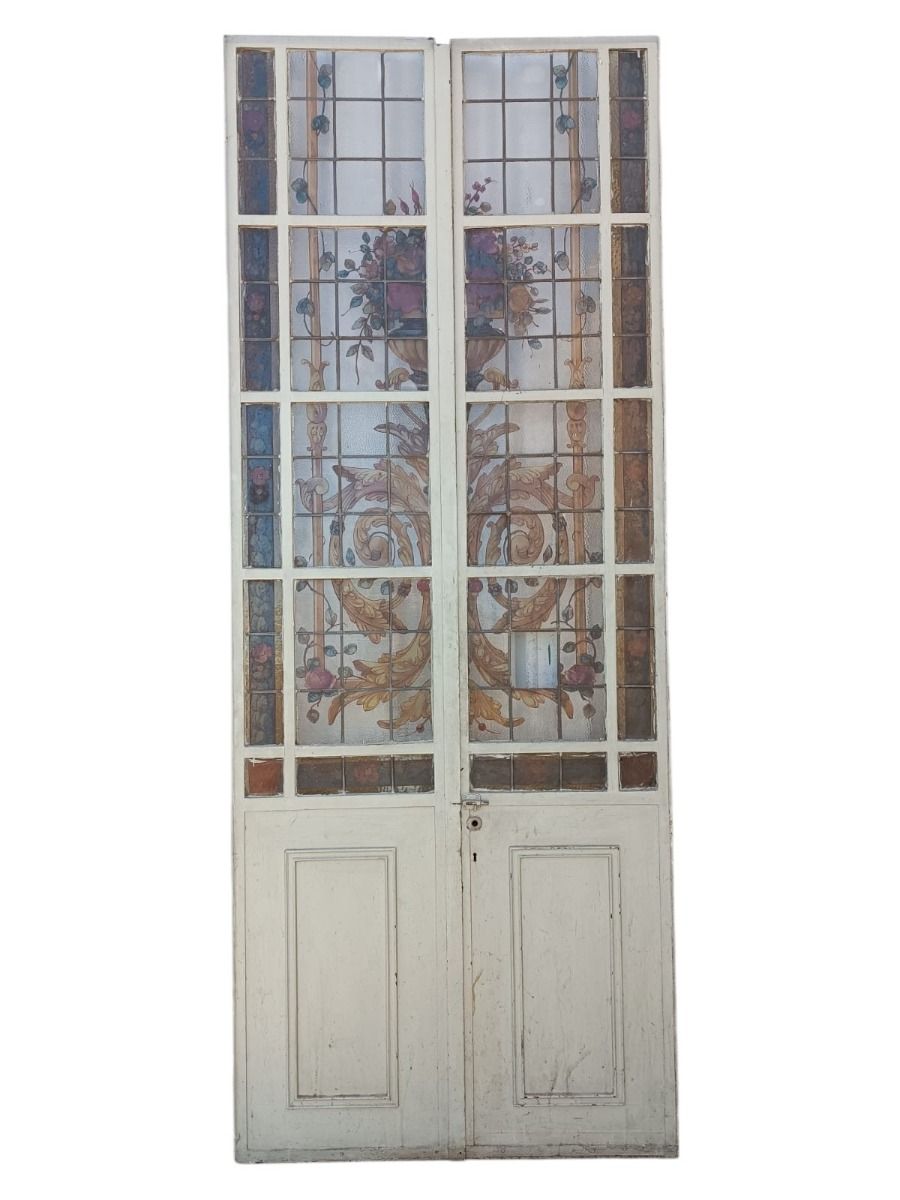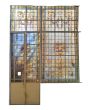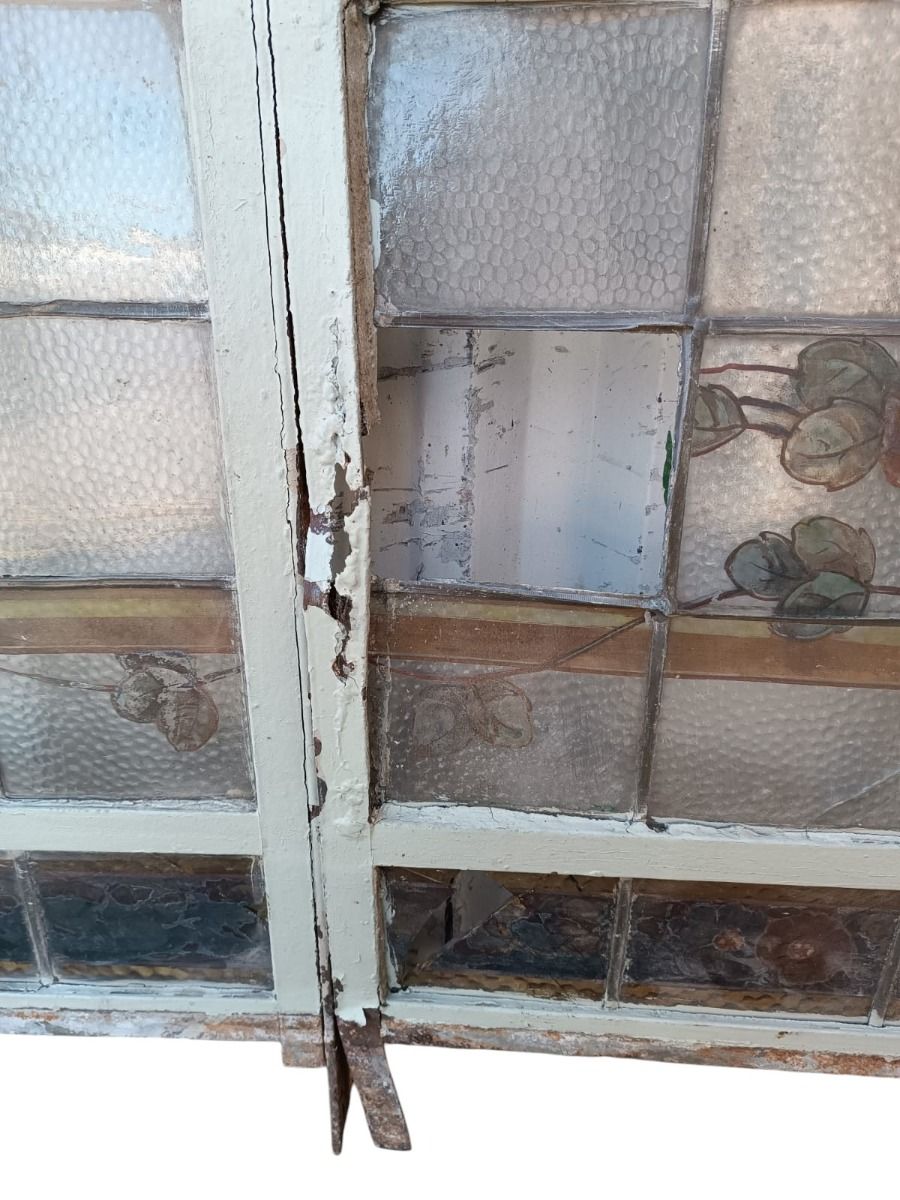 Antigua puerta tipo mampara de hierro pintada de amarillo. Es a dos hojas de abrir, con vitraux, paños fijos lateral y superior, molduras inferiores (en chapón de la puerta), trabas internas y marco de hierro. La abertura tiene algunas averías que pueden observarse en las fotografías. Imponente cerramiento proveniente de casona de estilo en CABA. La abertura no incluye todos los vidrios, la cerradura ni el picaporte. Su puerta tiene un ancho de 115cm, y sus hojas de 55x284cm. Su paño fijo lateral tiene 303cm de alto.