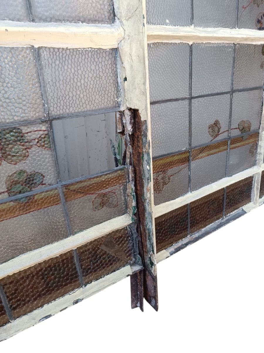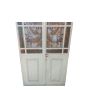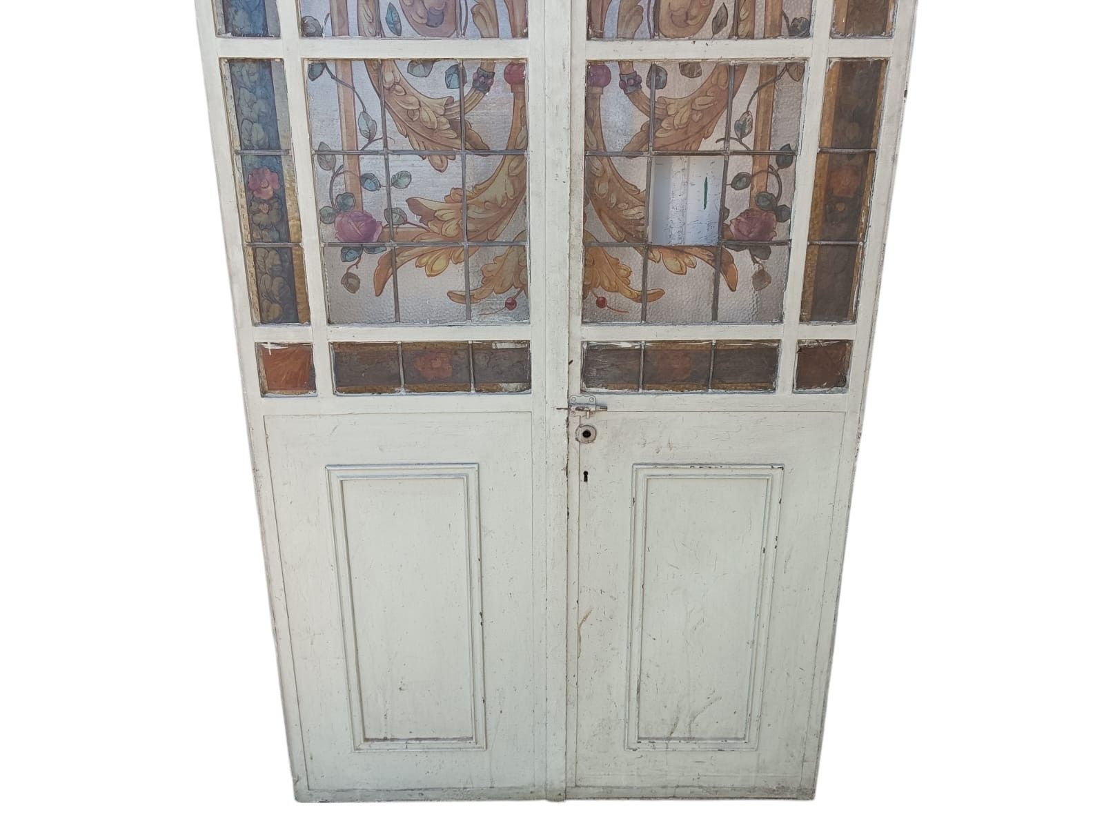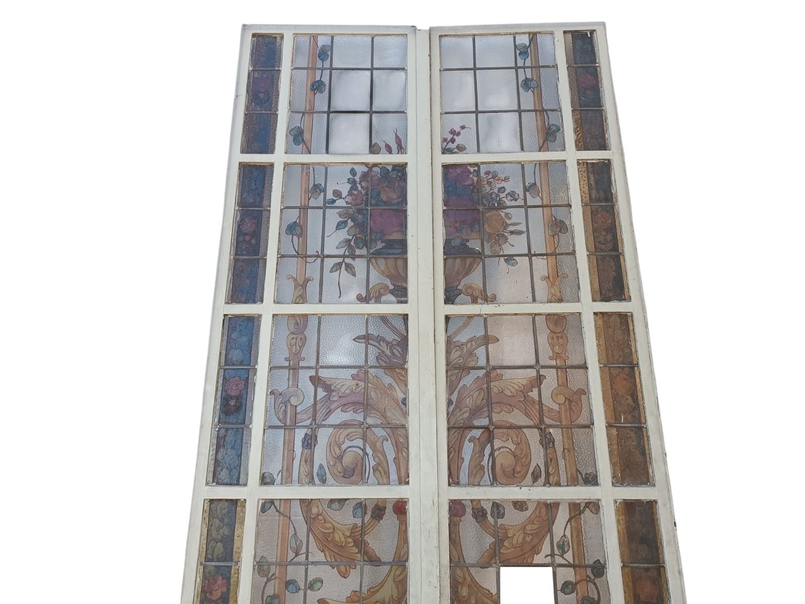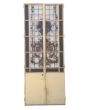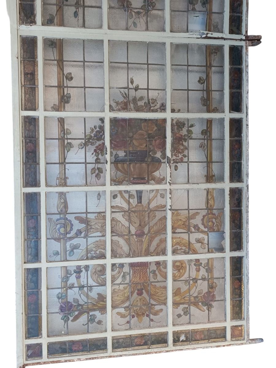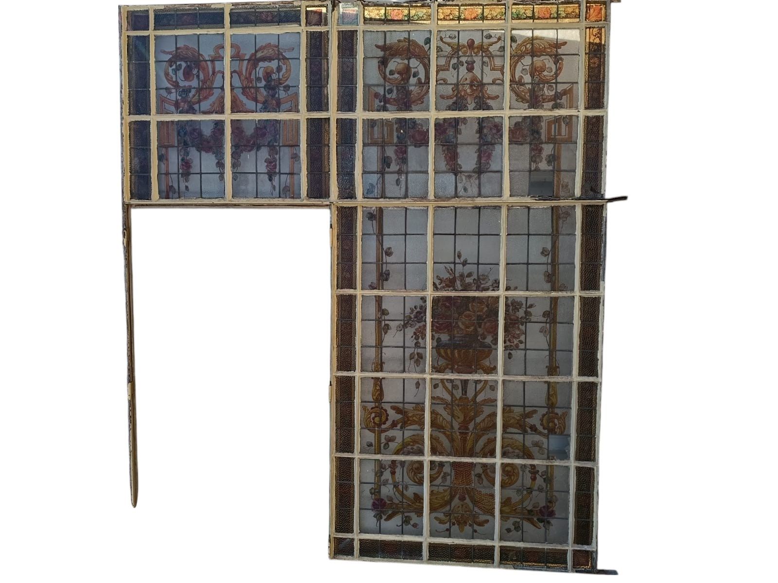 Antigua puerta tipo mampara de hierro pintada de amarillo. Es a dos hojas de abrir, con vitraux, paños fijos lateral y superior, molduras inferiores (en chapón de la puerta), trabas internas y marco de hierro. La abertura tiene algunas averías que pueden observarse en las fotografías. Imponente cerramiento proveniente de casona de estilo en CABA. La abertura no incluye todos los vidrios, la cerradura ni el picaporte. Su puerta tiene un ancho de 115cm, y sus hojas de 55x284cm. Su paño fijo lateral tiene 303cm de alto.