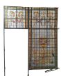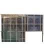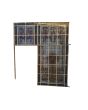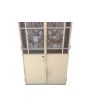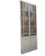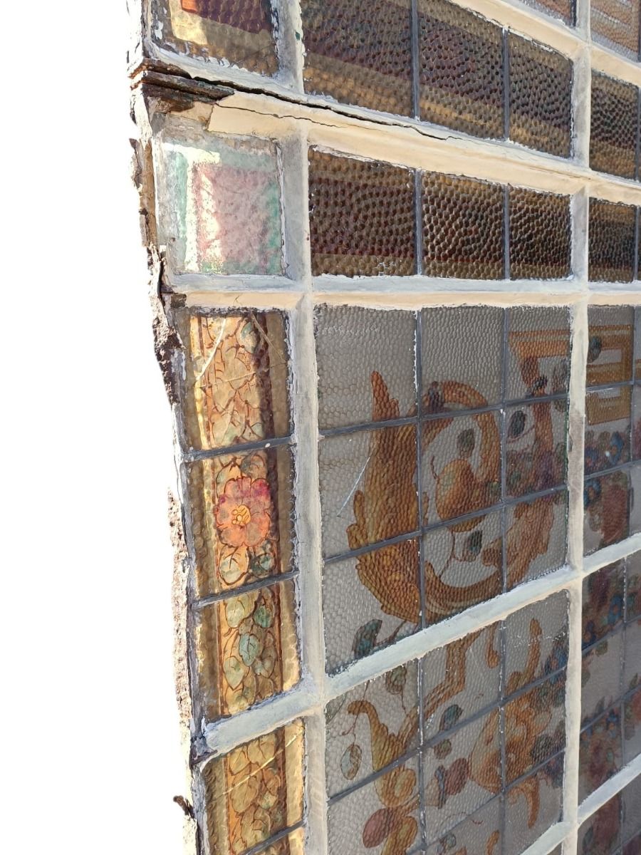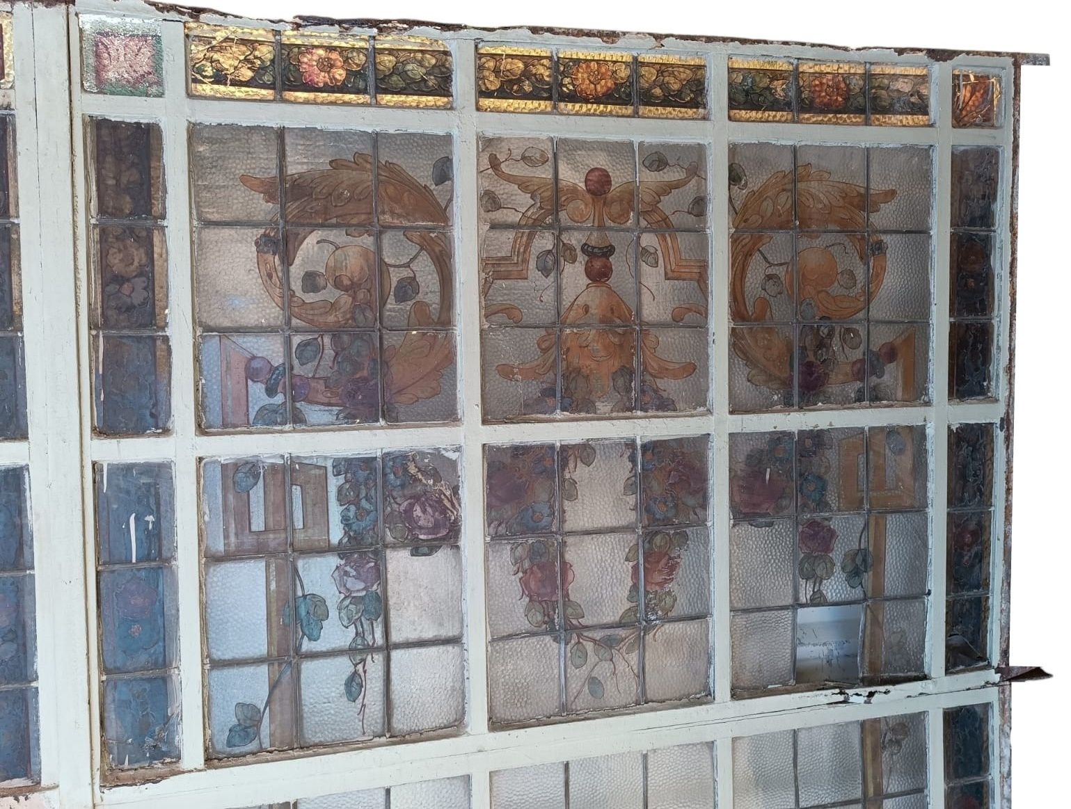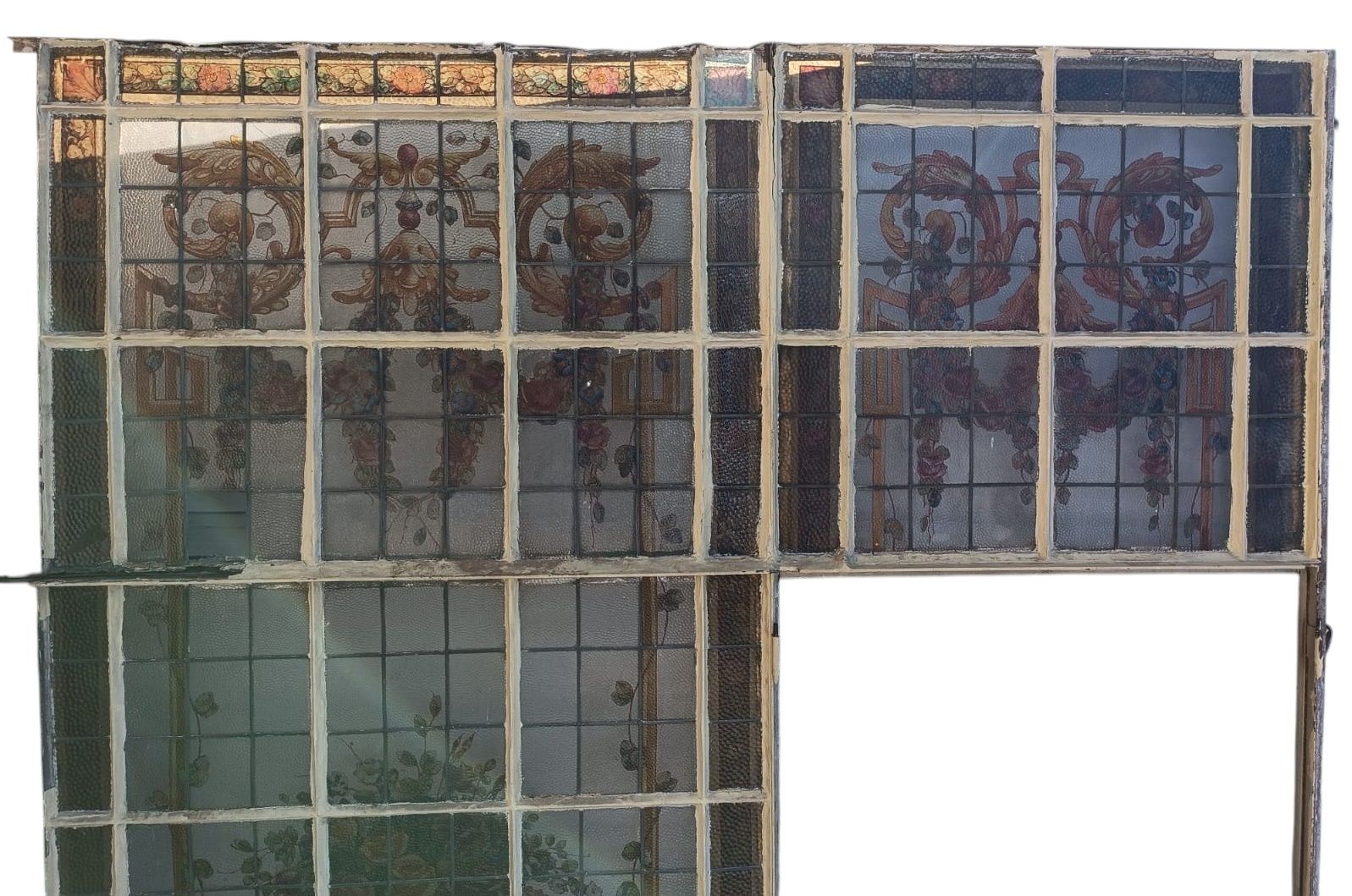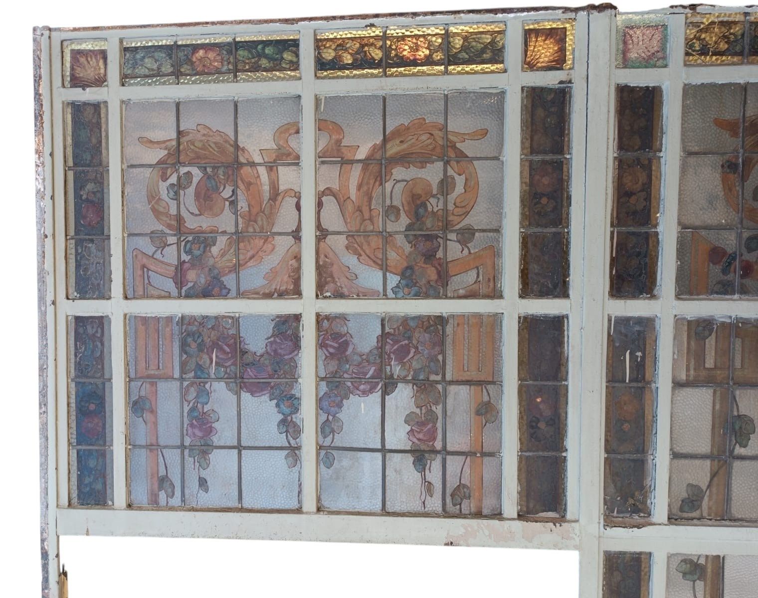 Antigua puerta tipo mampara de hierro pintada de amarillo. Es a dos hojas de abrir, con vitraux, paños fijos lateral y superior, molduras inferiores (en chapón de la puerta), trabas internas y marco de hierro. La abertura tiene algunas averías que pueden observarse en las fotografías. Imponente cerramiento proveniente de casona de estilo en CABA. La abertura no incluye todos los vidrios, la cerradura ni el picaporte. Su puerta tiene un ancho de 115cm, y sus hojas de 55x284cm. Su paño fijo lateral tiene 303cm de alto.