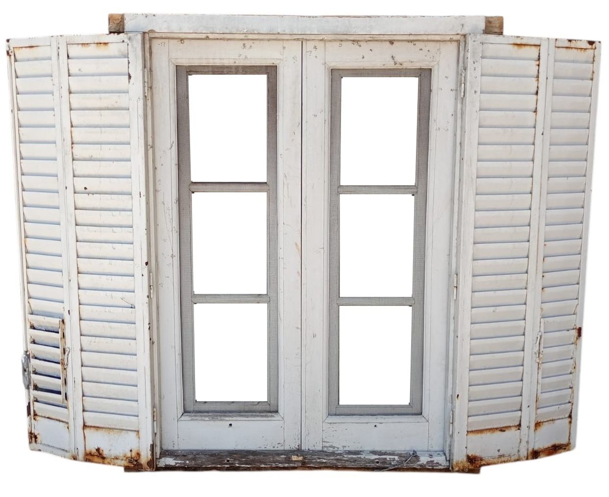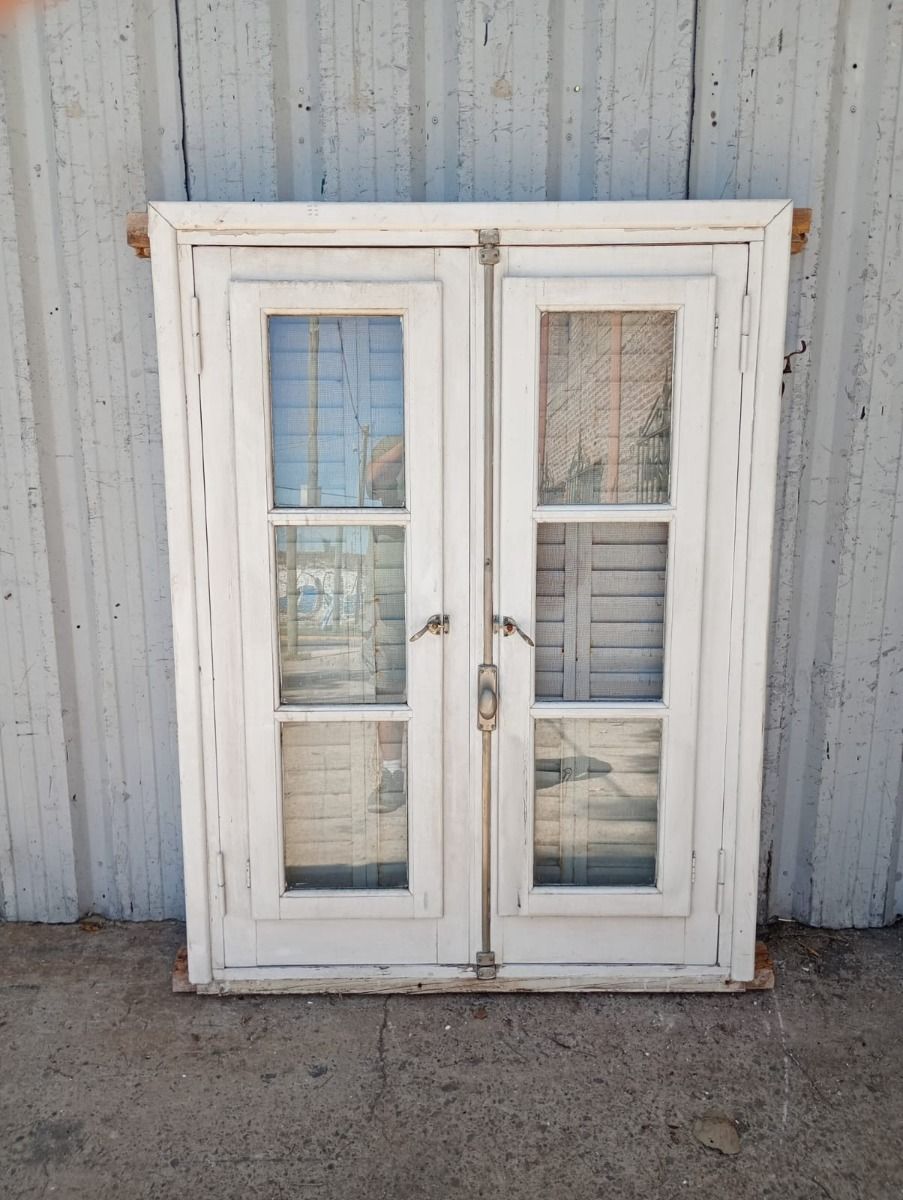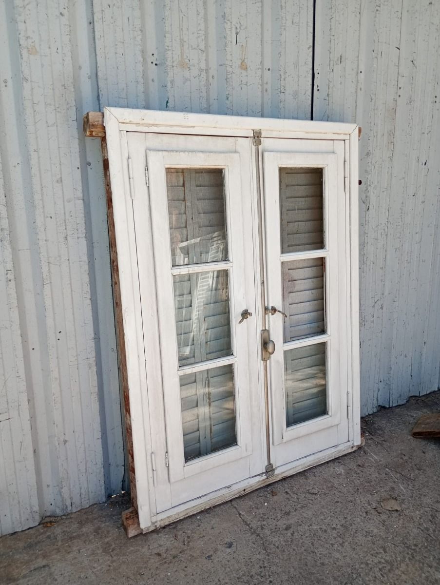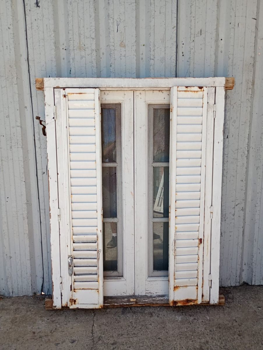 Antigua ventana de madera pino brasil. Es a dos hojas de abrir con mosquitero, con celosías de hierro, falleba, postigos vidriados a vidrios tipo repartidos en tres y marco de madera pinotea. La abertura no incluye los vidrios. Hojas de 48x138cm.