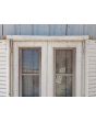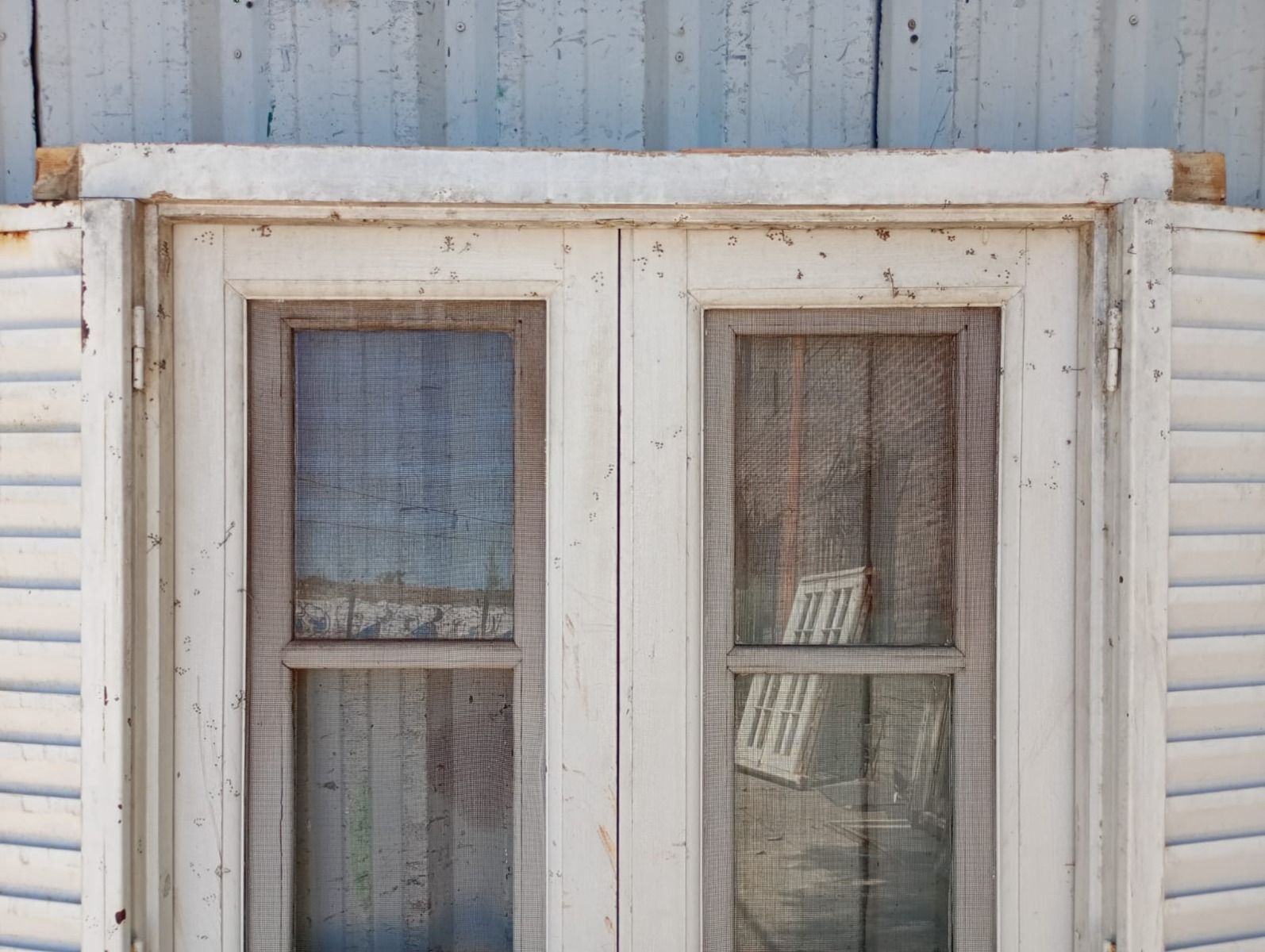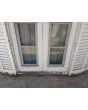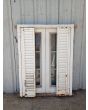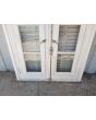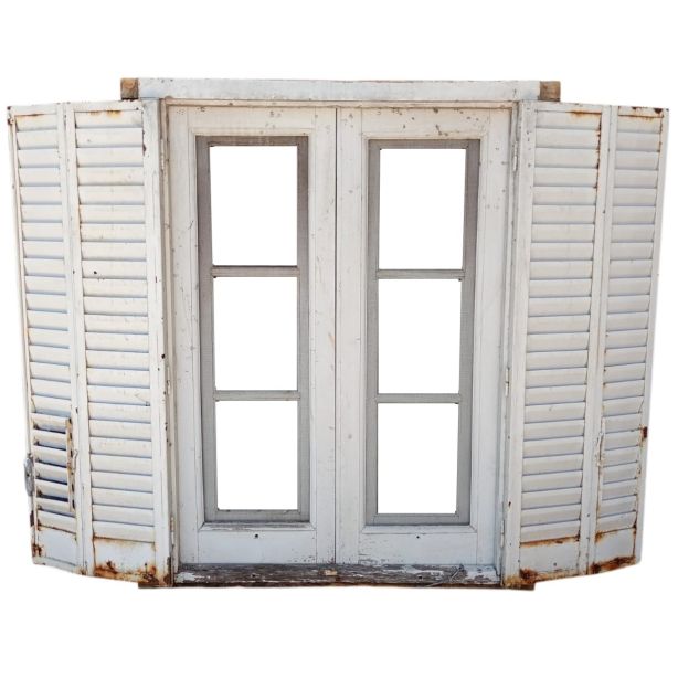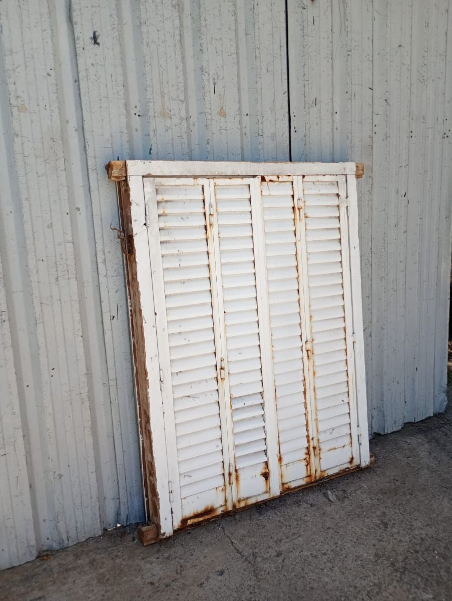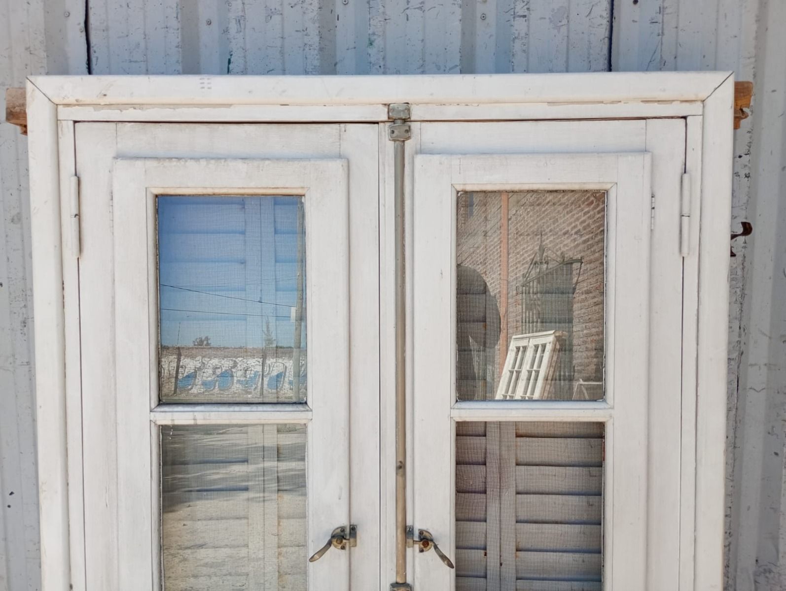 Antigua ventana de madera pino brasil. Es a dos hojas de abrir con mosquitero, con celosías de hierro, falleba, postigos vidriados a vidrios tipo repartidos en tres y marco de madera pinotea. La abertura no incluye los vidrios. Hojas de 48x138cm.