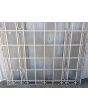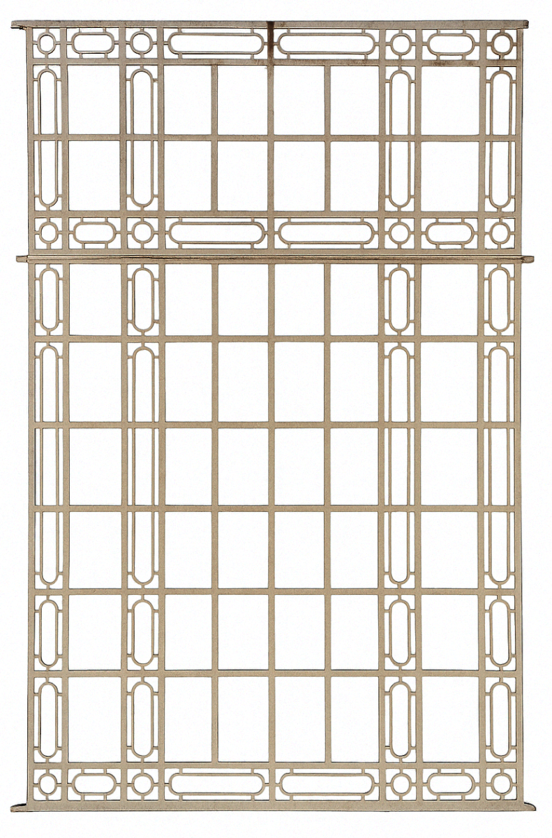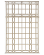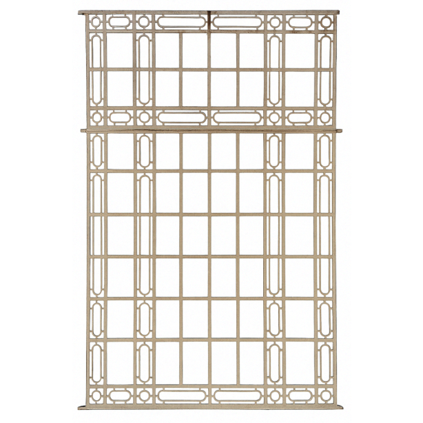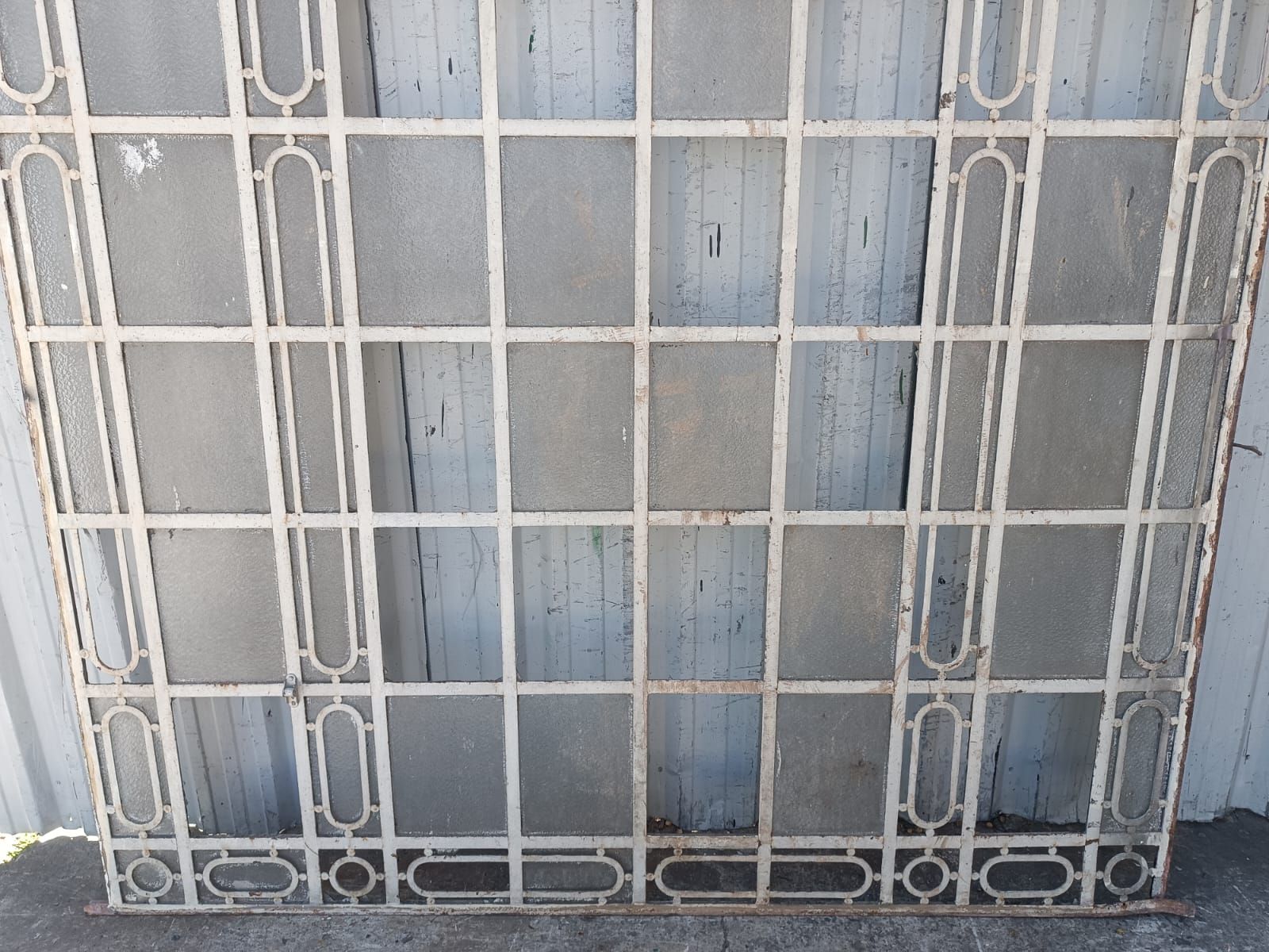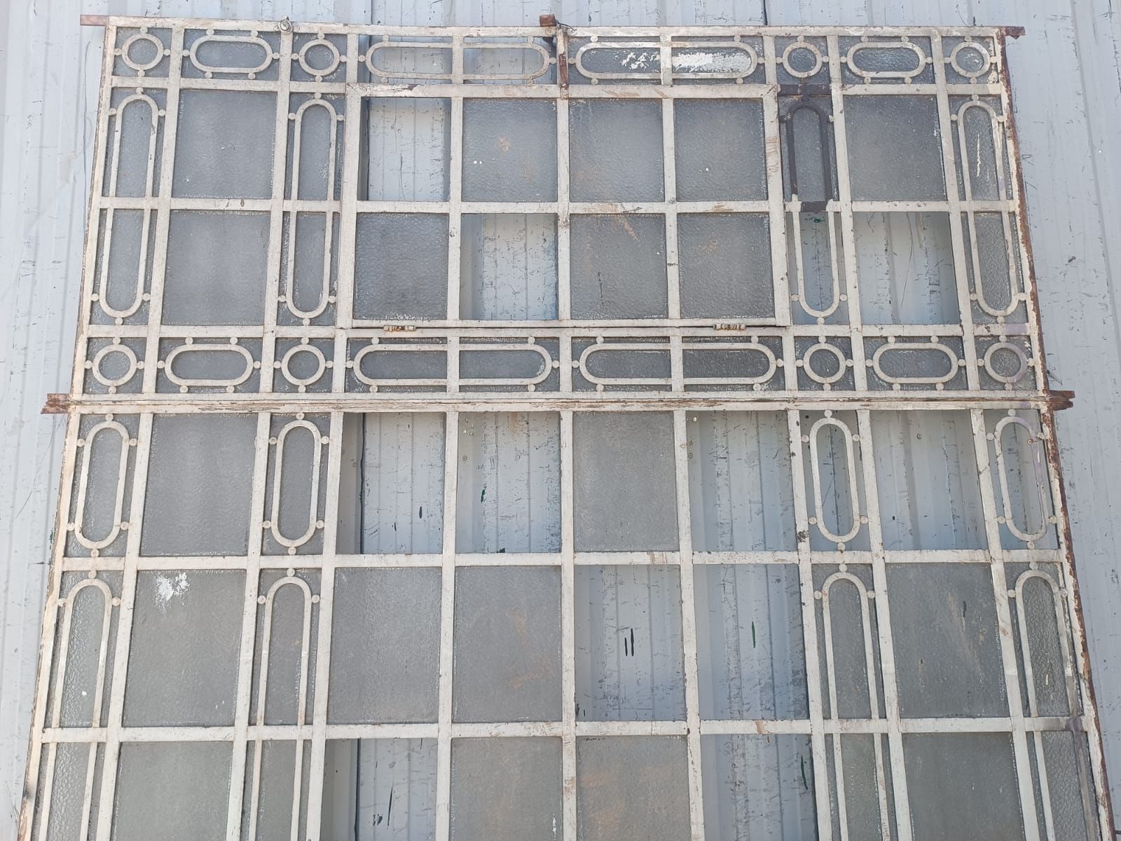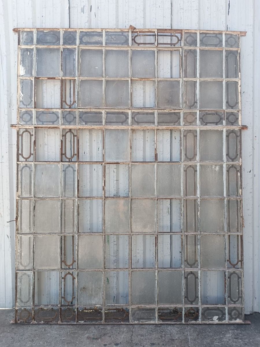 Antigua ventana tipo mampara de hierro pintada de blanco. Es a una hoja de abrir tipo ventiluz, con paño fijo, círculos y marco de hierro. La abertura no incluye todos los vidrios. Hoja de 93x55cm.