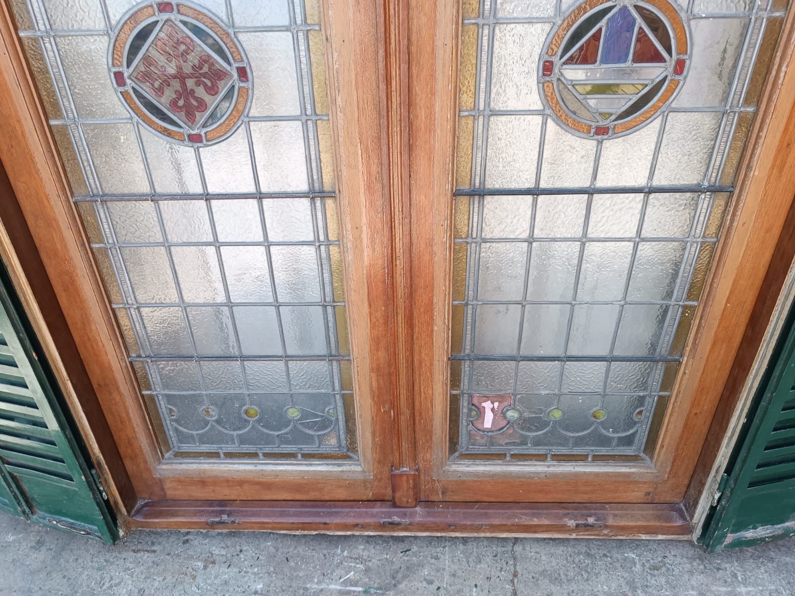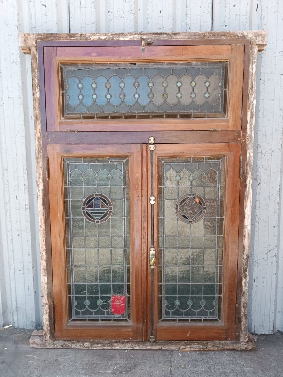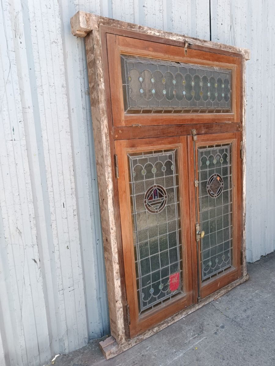 Dos antiguas ventanas de madera cedro al natural. Son a dos hojas de abrir, con vitraux, celosías de hierro, tapajunta, capitel, falleba y marco de madera dura. Una de las ventanas tiene algunos detalles en el vitraux que pueden observarse en las fotografías. Hojas de 60x133cm. EL PRECIO ES POR UNIDAD.