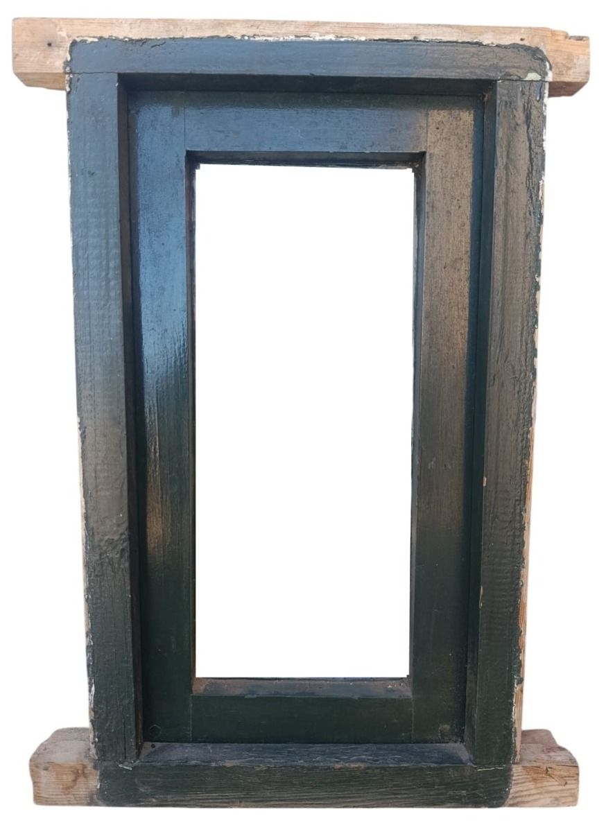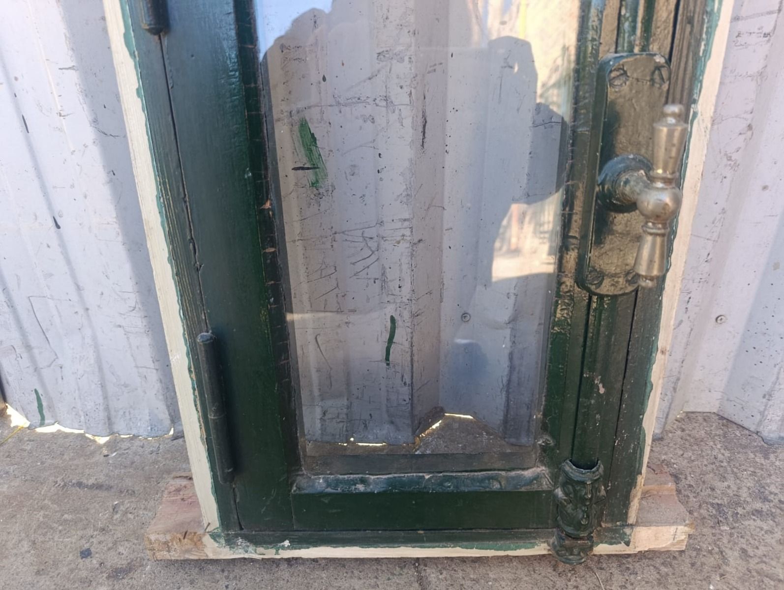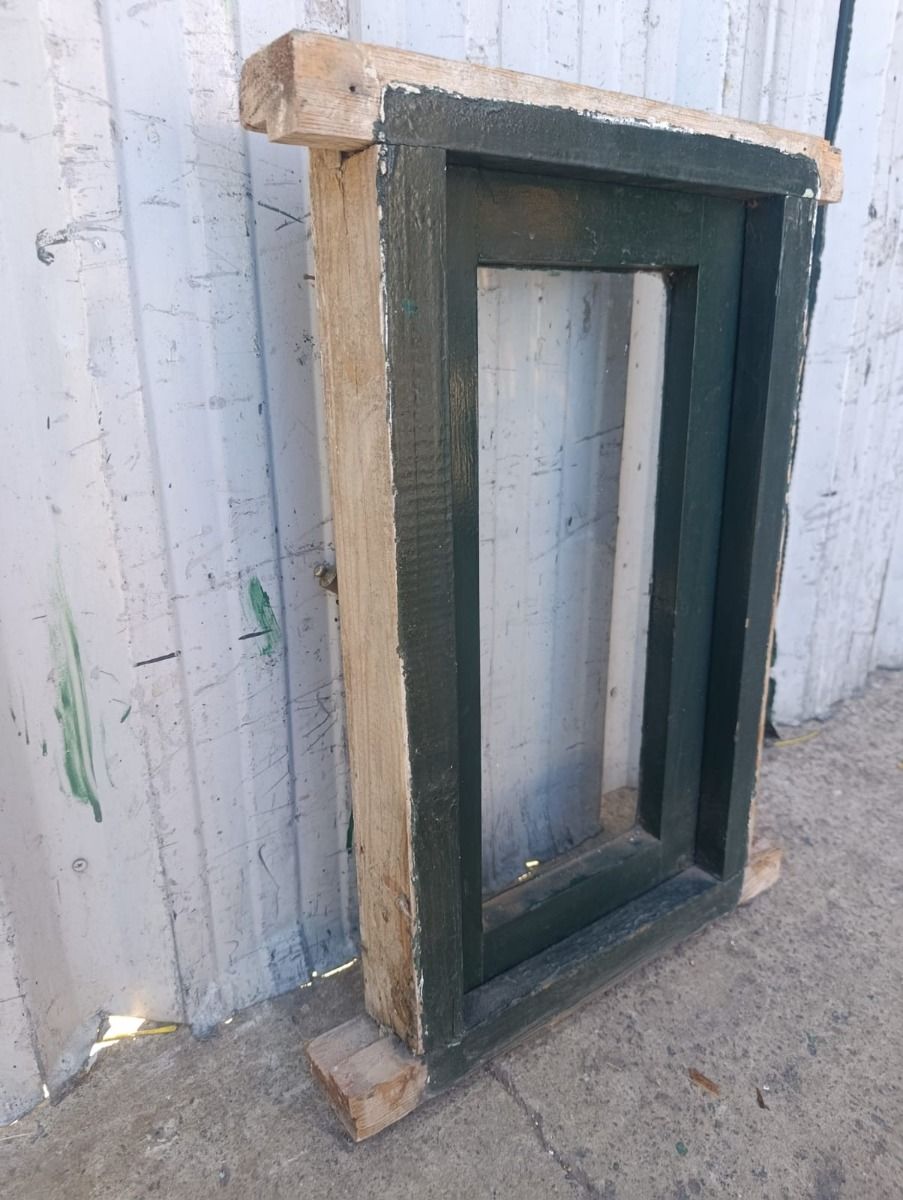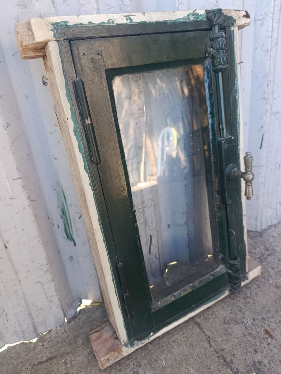 Dos antiguas ventanas de madera cedro pintadas de verde. Son a una hoja de abrir hacia la izquierda, con vidrios tipo enterizos, falleba y marco de madera pinotea. Las aberturas no incluyen los vidrios. Hoja de 28x54cm. EL PRECIO ES POR UNIDAD.