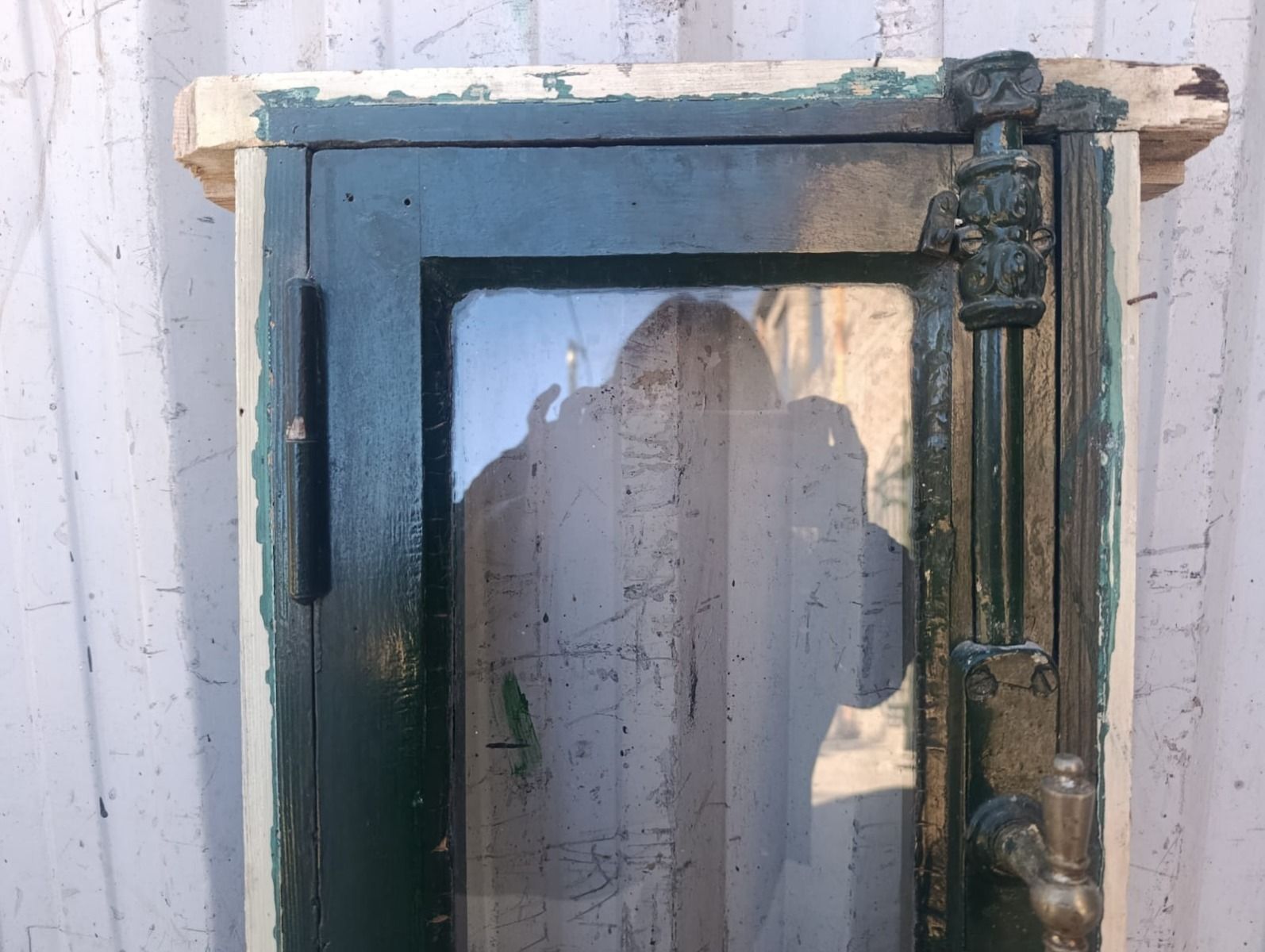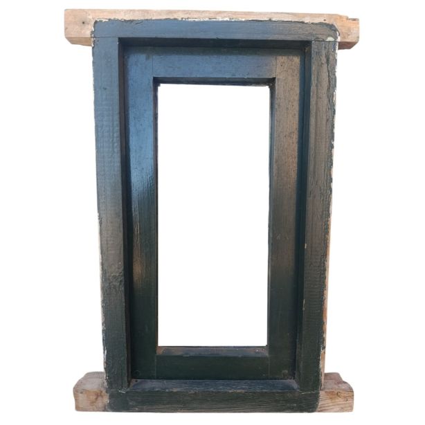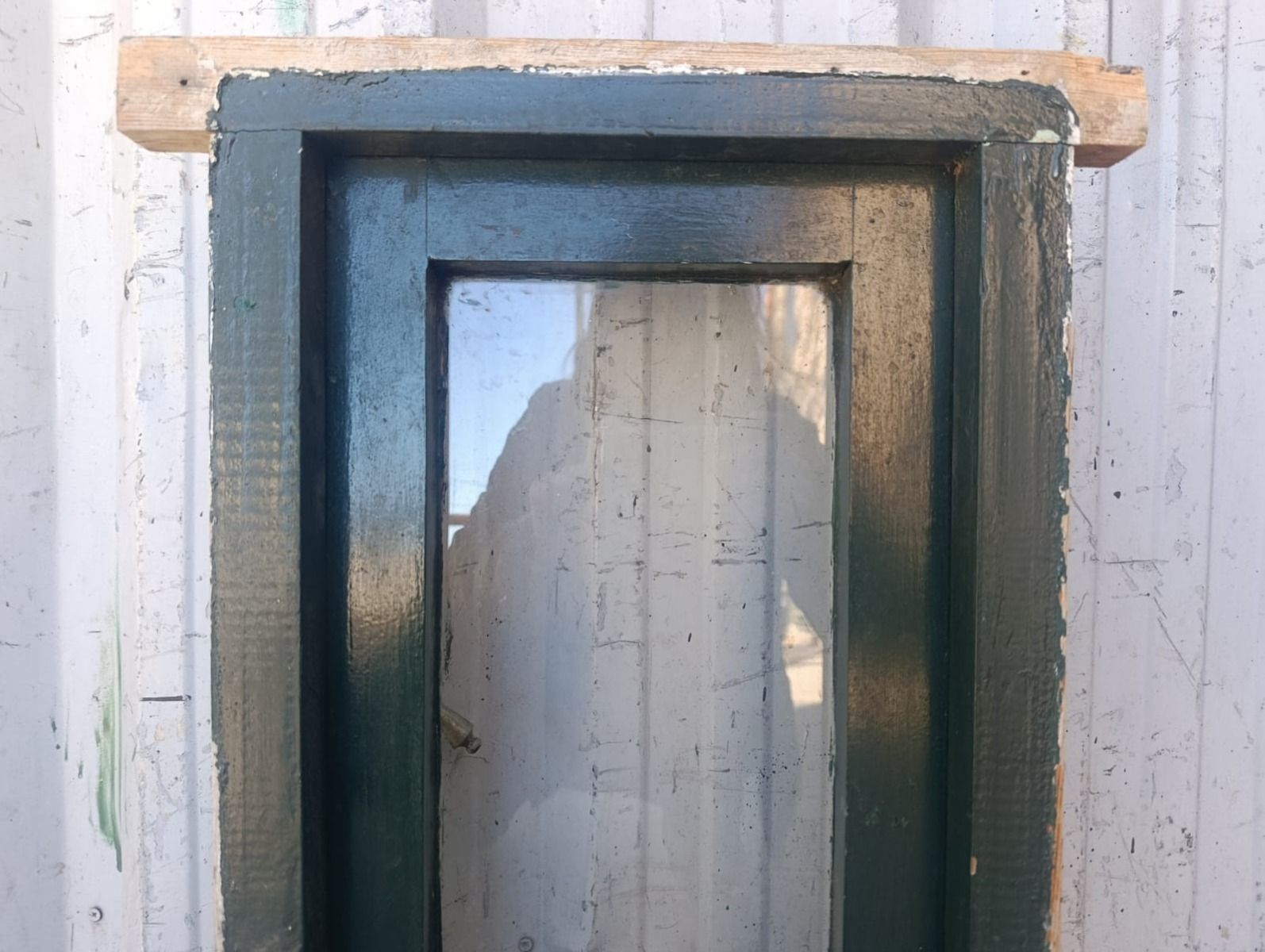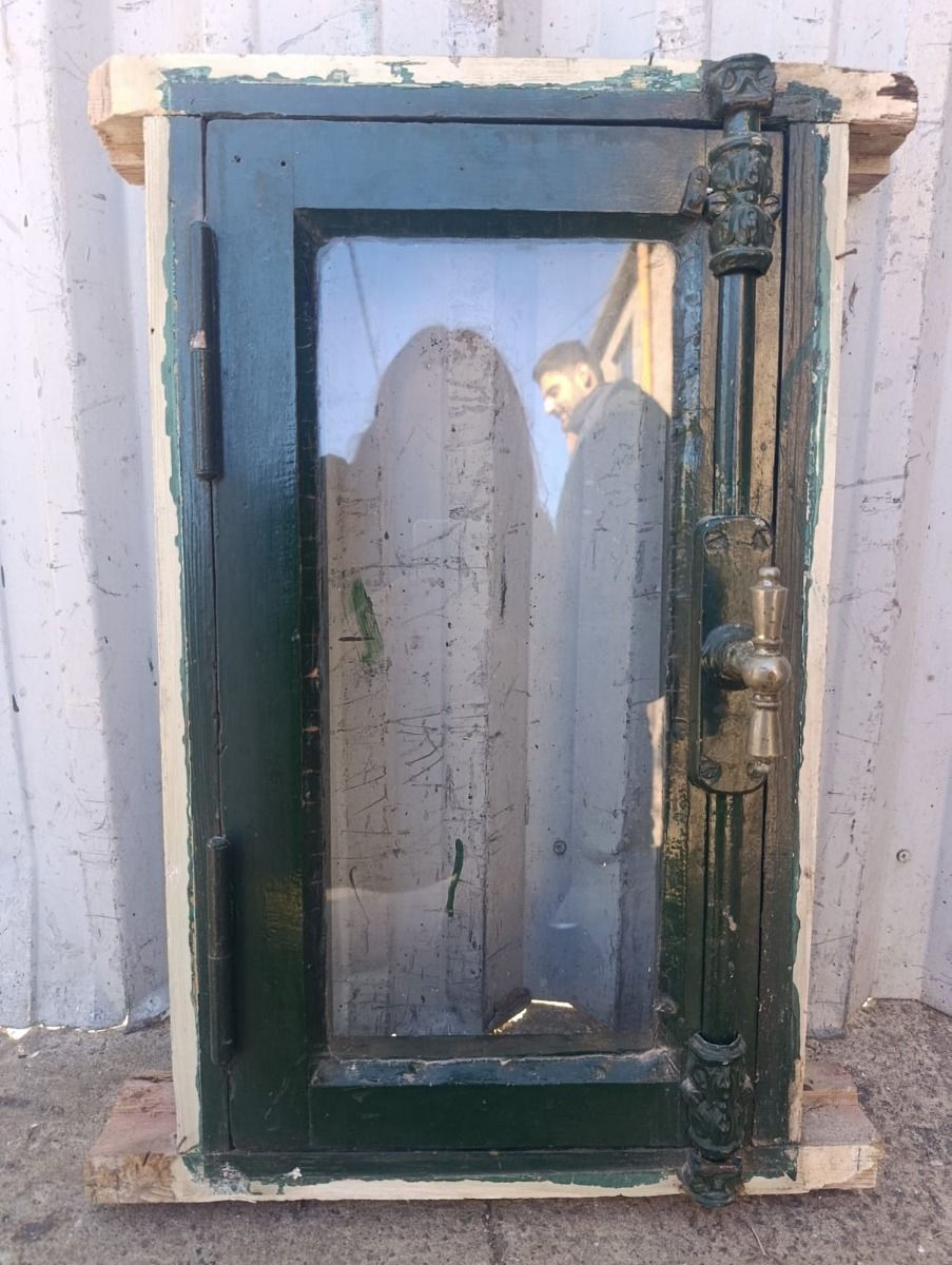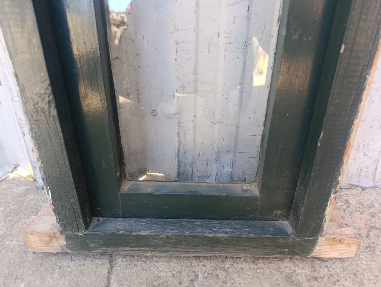 Dos antiguas ventanas de madera cedro pintadas de verde. Son a una hoja de abrir hacia la izquierda, con vidrios tipo enterizos, falleba y marco de madera pinotea. Las aberturas no incluyen los vidrios. Hoja de 28x54cm. EL PRECIO ES POR UNIDAD.