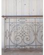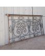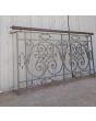 Antiguo balcón de hierro con baranda de bronce, rulos, borlas, óvalos y flores.