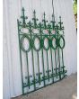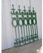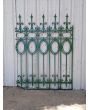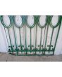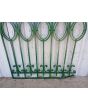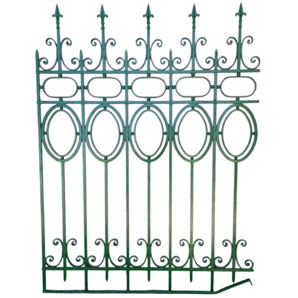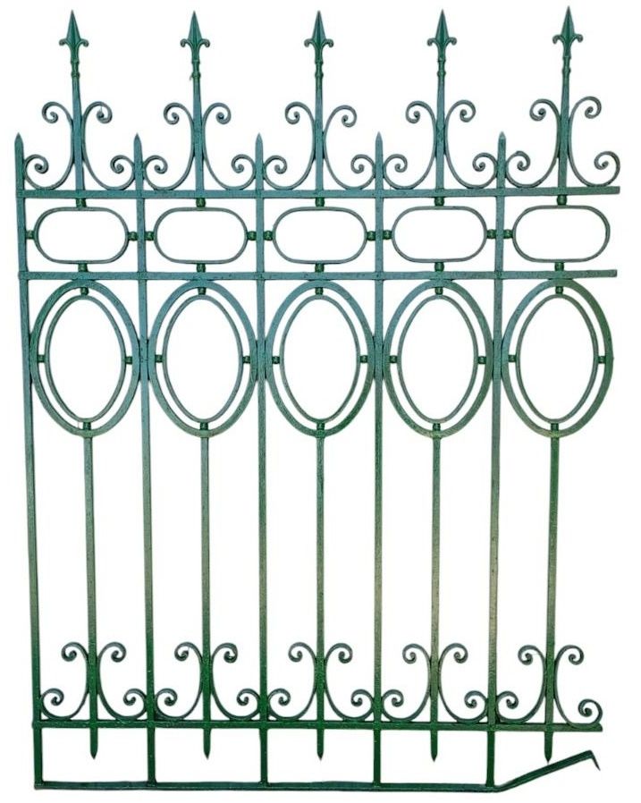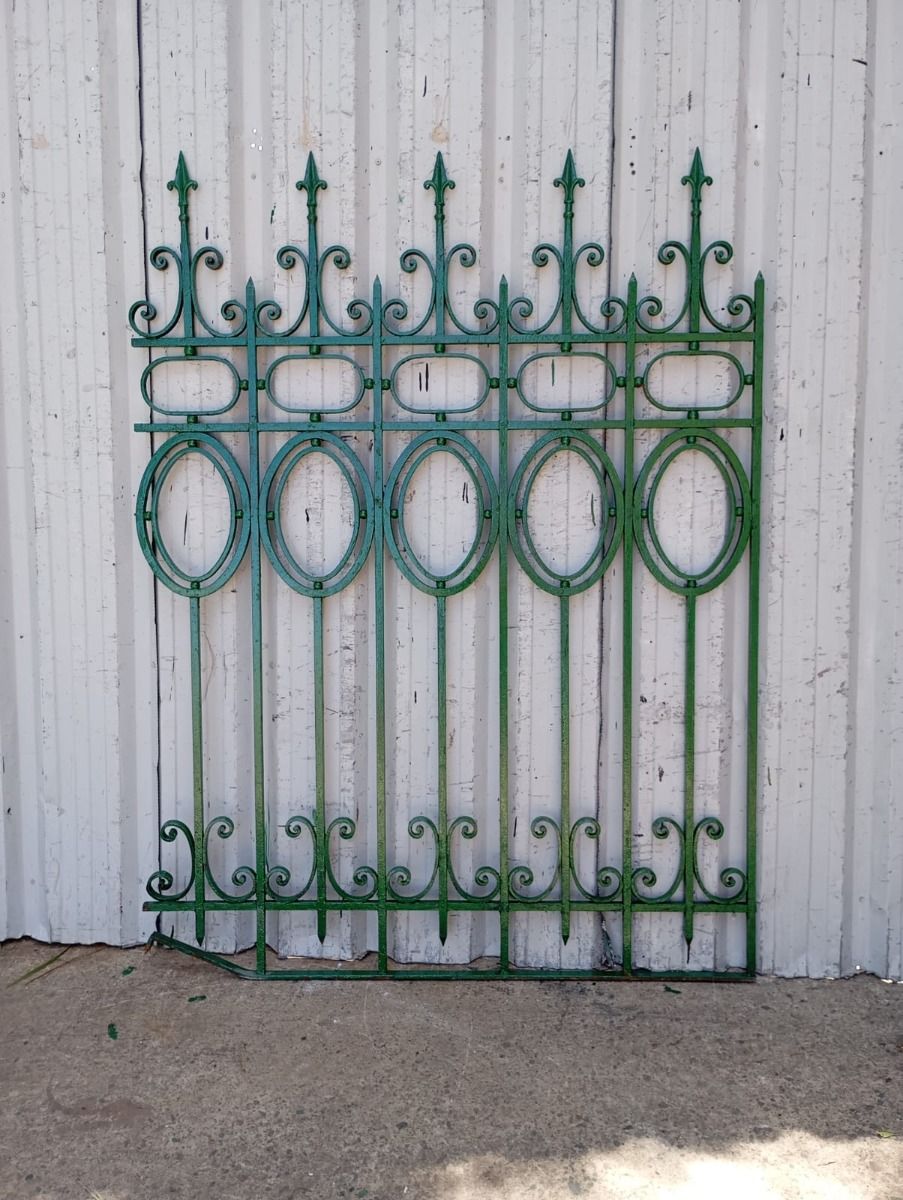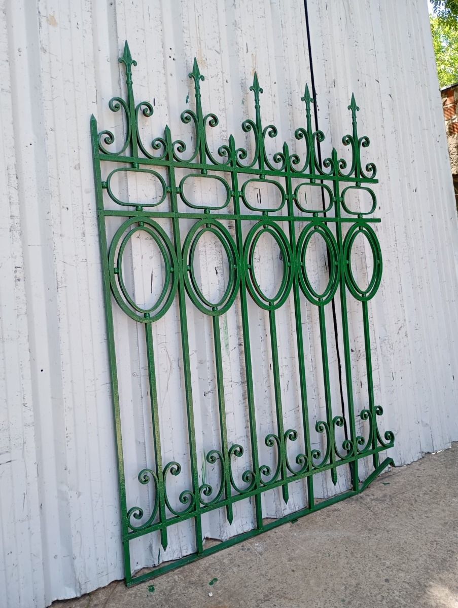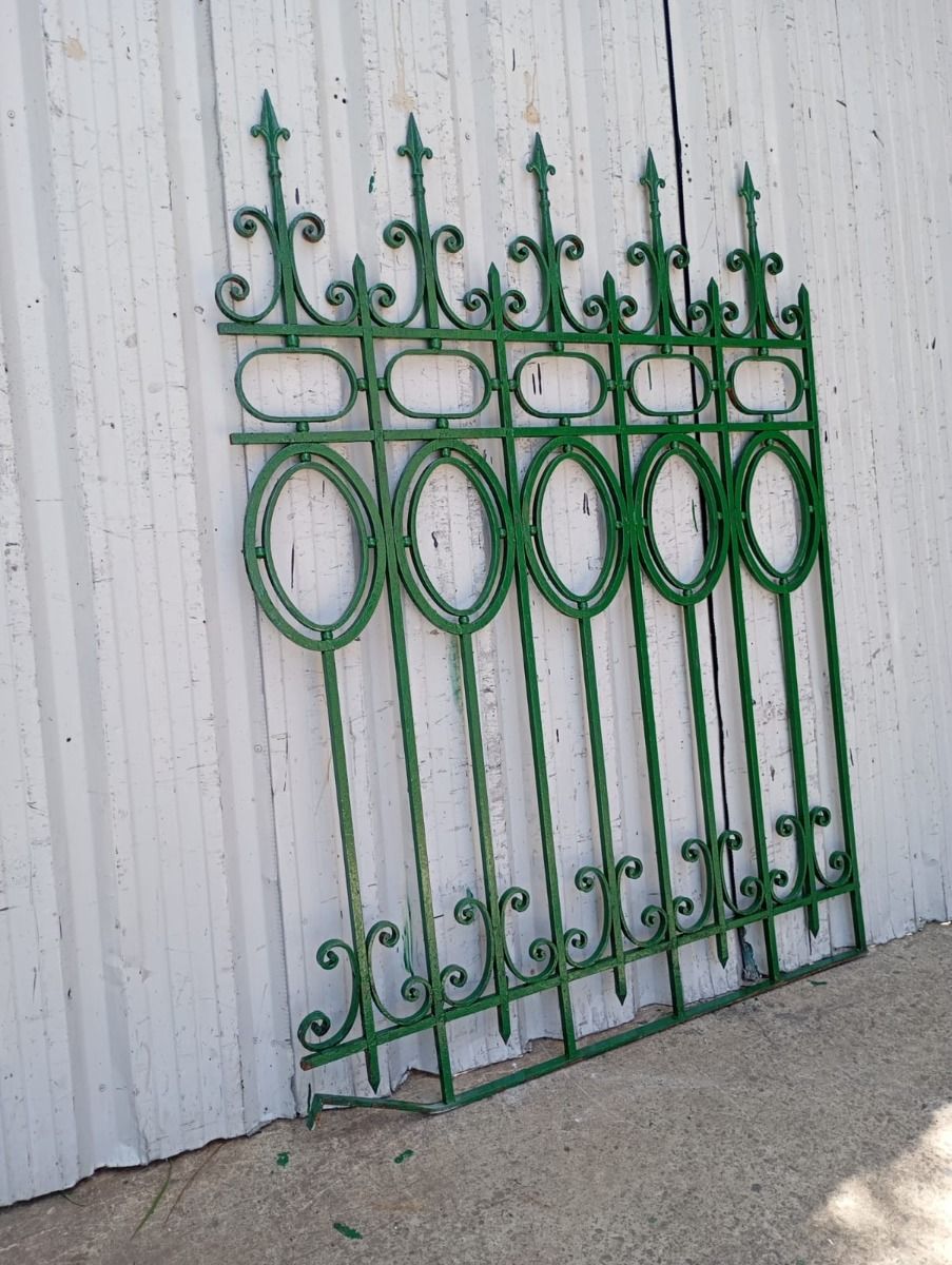 Cinco tramos antiguos de reja de hierro con detalles circulares y con punta de lanza. La medida publicada corresponde al ancho total del conjunto. Tiene cinco tramos: uno de 128cm, uno de 154cm, uno de 106cm, uno de 100cm y uno de 72cm. Se vende el conjunto completo.