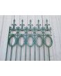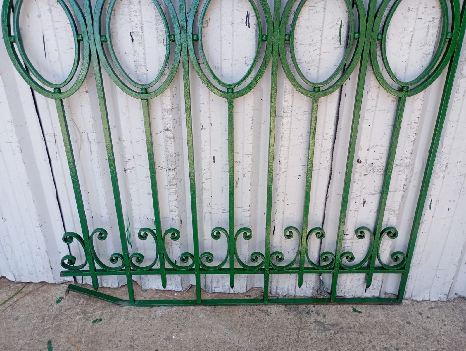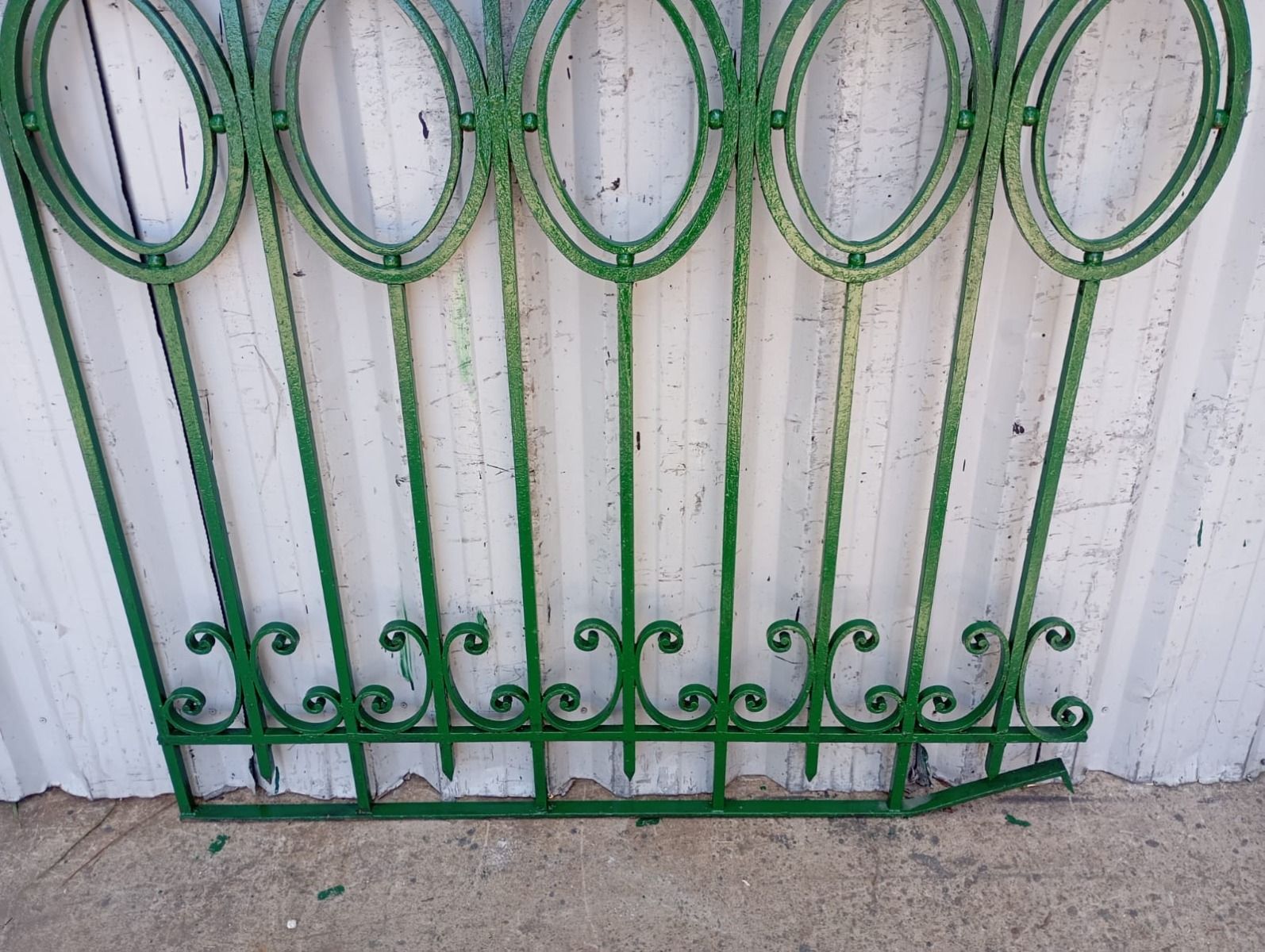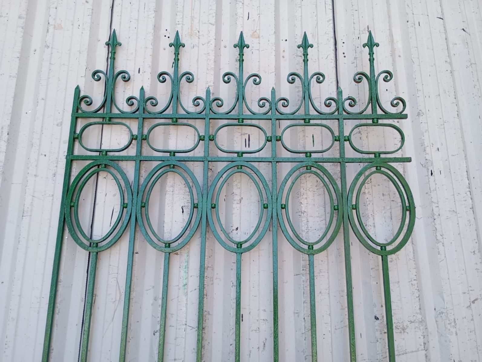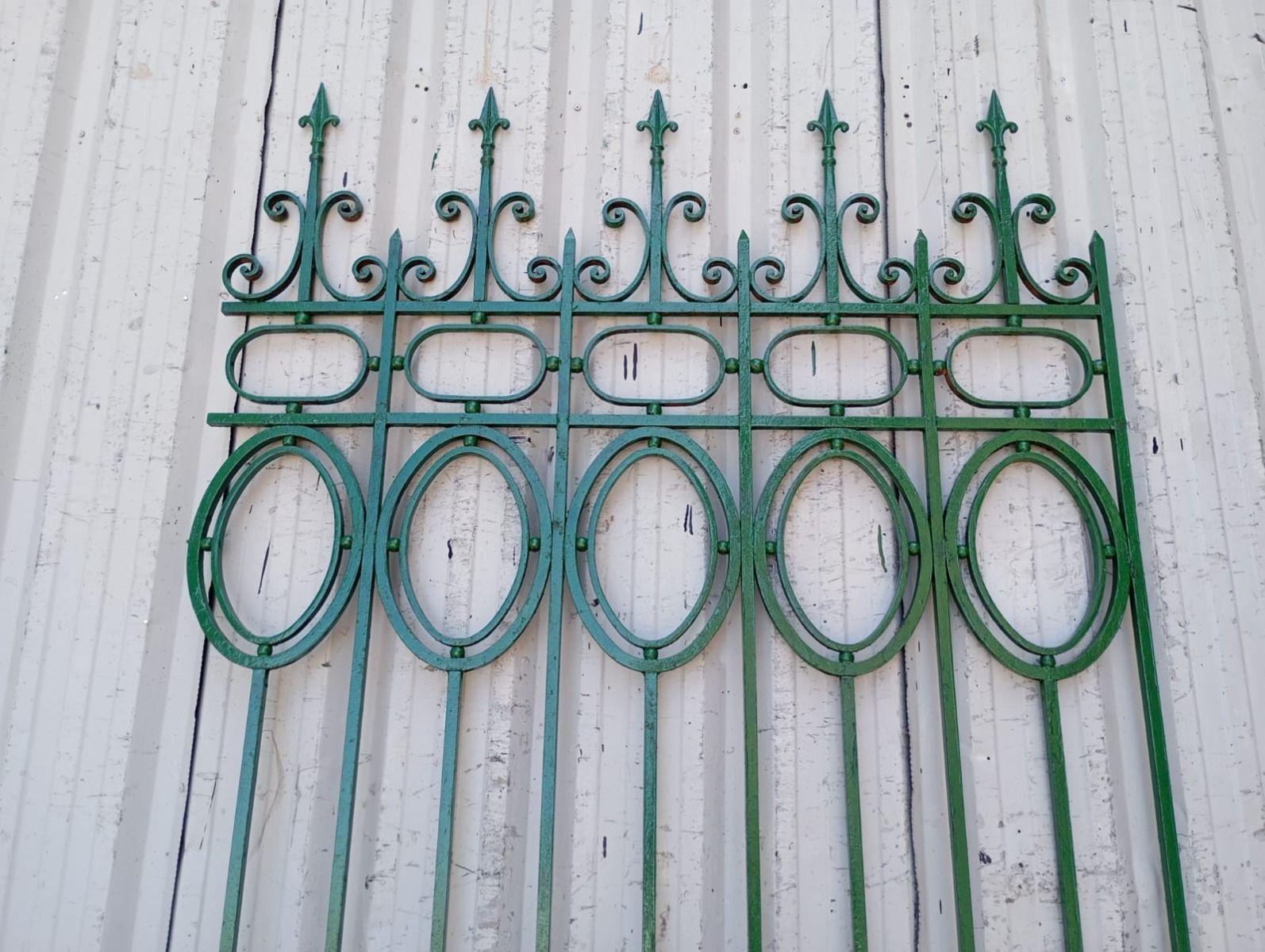 Cinco tramos antiguos de reja de hierro con detalles circulares y con punta de lanza. La medida publicada corresponde al ancho total del conjunto. Tiene cinco tramos: uno de 128cm, uno de 154cm, uno de 106cm, uno de 100cm y uno de 72cm. Se vende el conjunto completo.