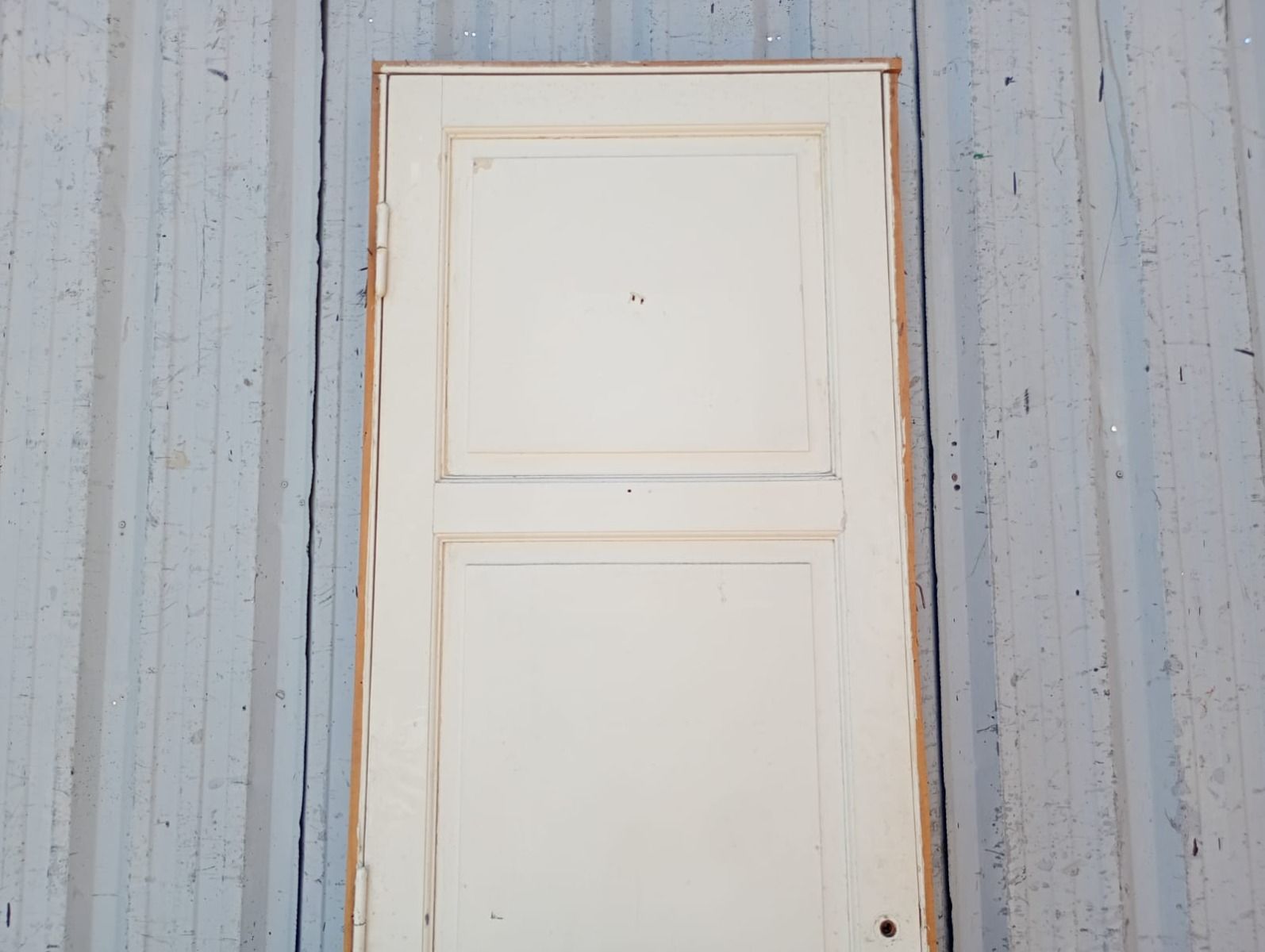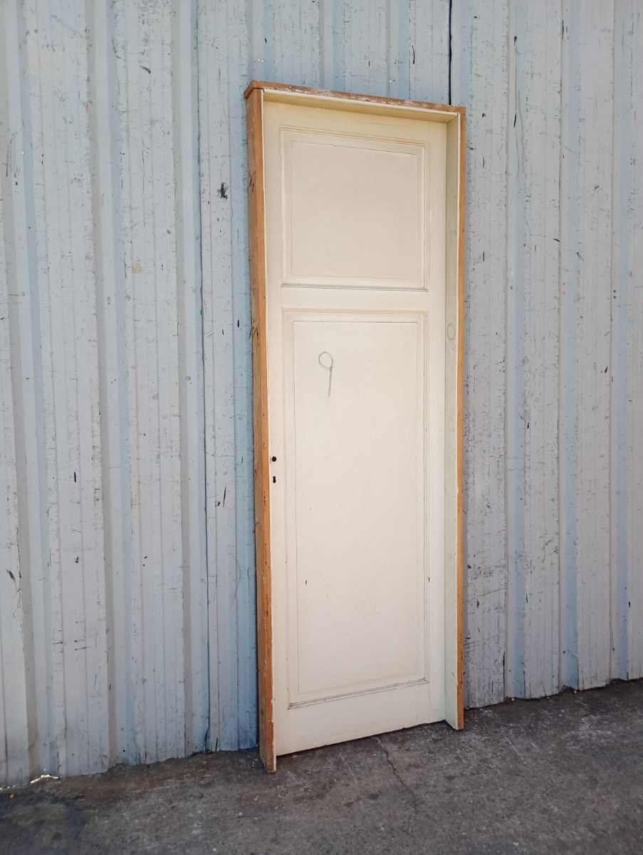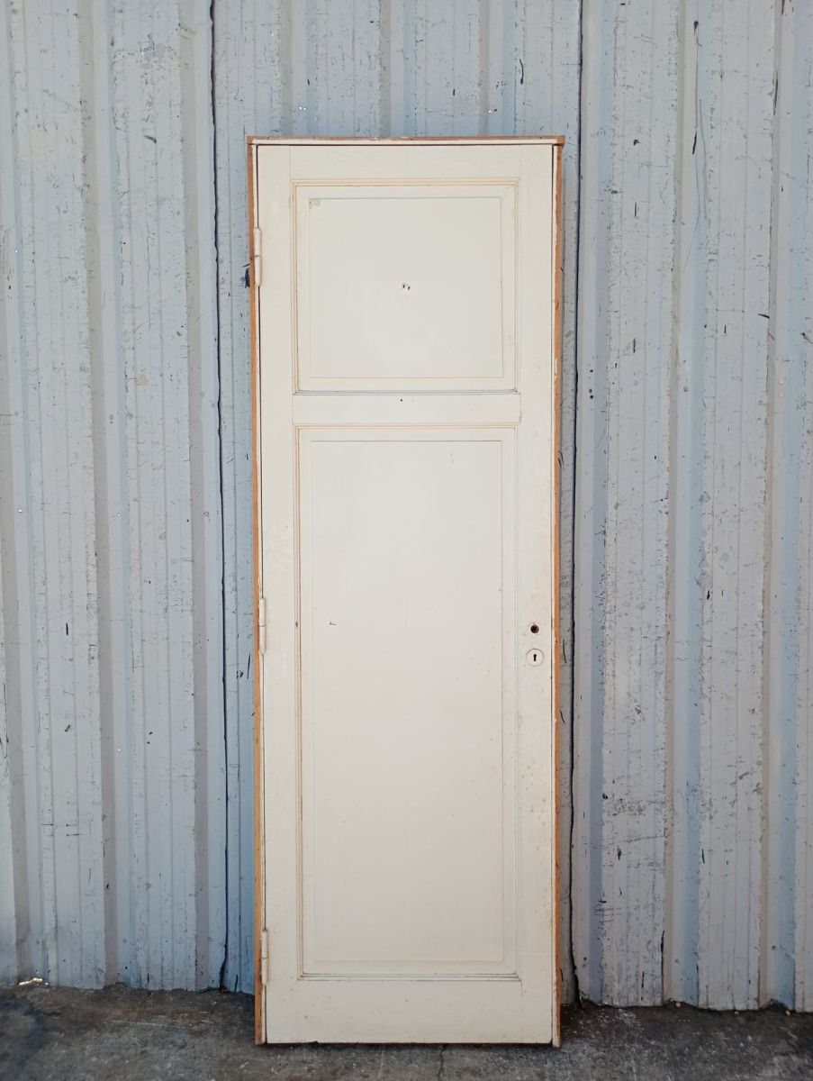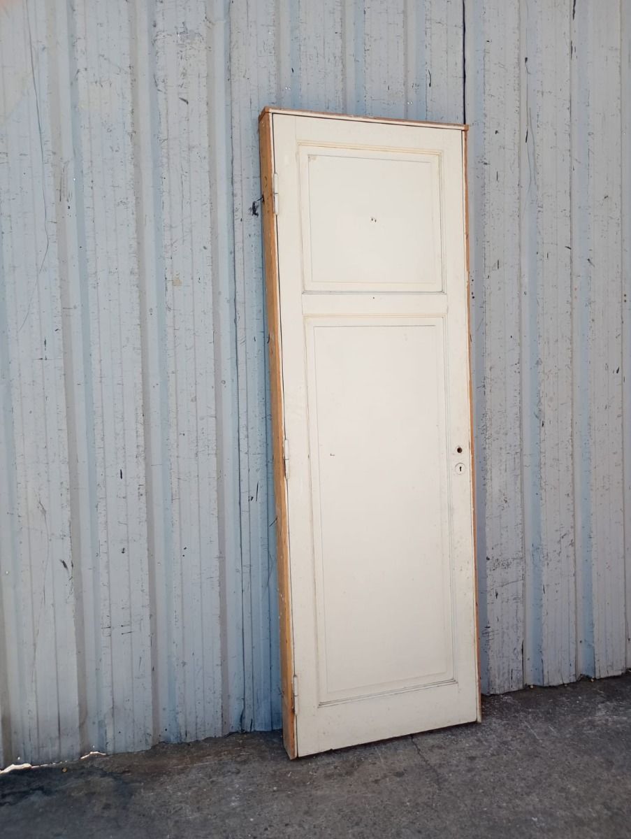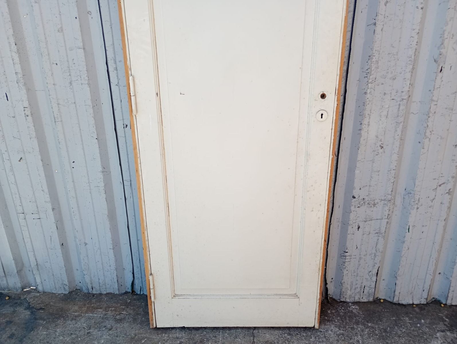 Cuatro antiguas puertas tablero de madera cedro pintadas de blanco. Son a una hoja de abrir (una es de apertura izquierda y tres de apertura derecha) con tableros doble replanados y marco de madera dura. Las aberturas no incluyen la cerradura ni el picaporte. Hojas de 72x223cm. EL PRECIO ES POR UNIDAD.