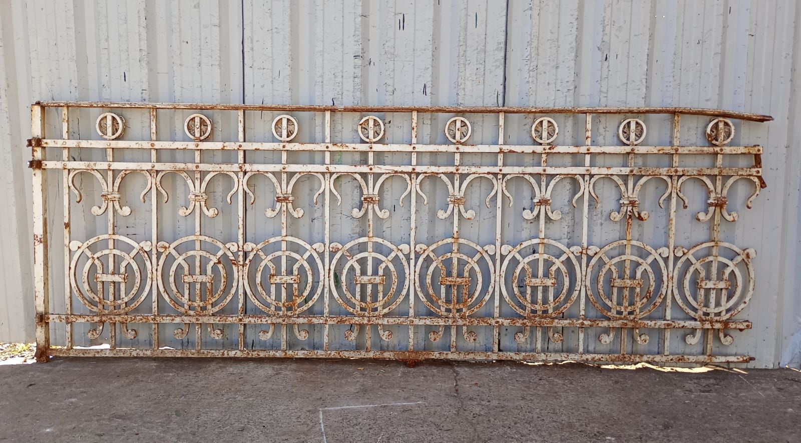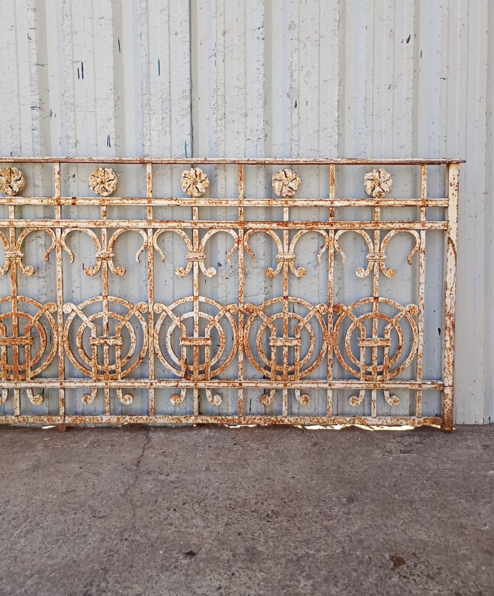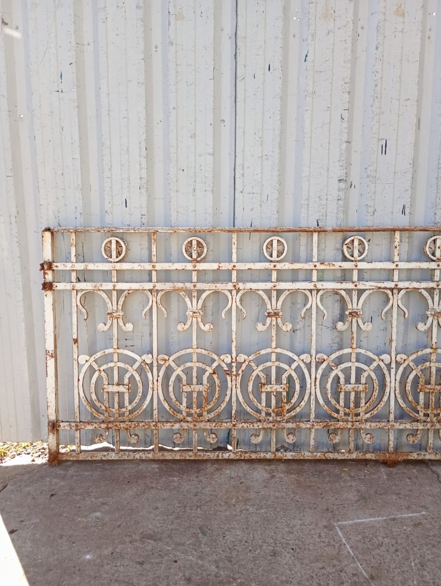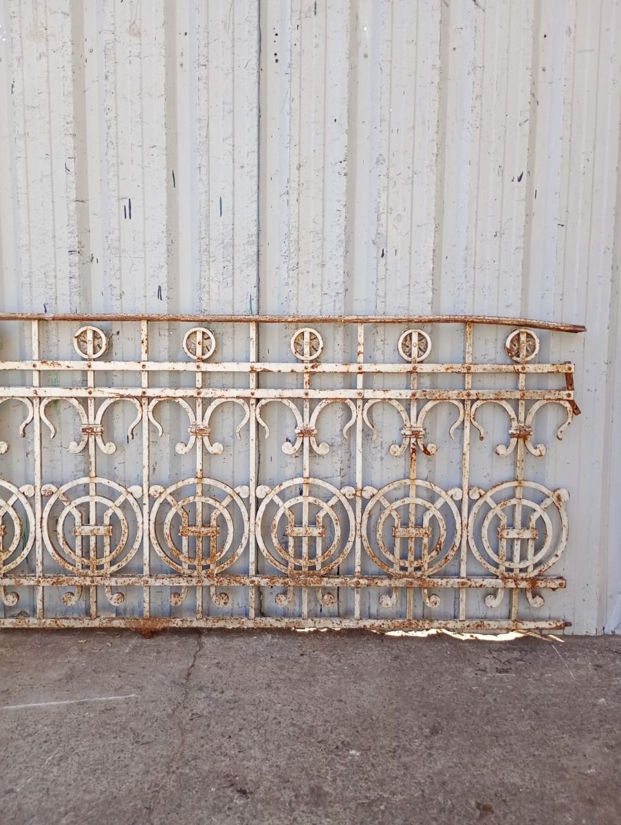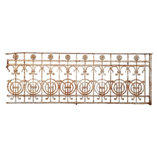 Seis metros de balcón antiguo de hierro remachado con flores y círculos. Son dos tramos de 255cm y uno de 90cm de ancho. SE VENDE EL CONJUNTO COMPLETO.