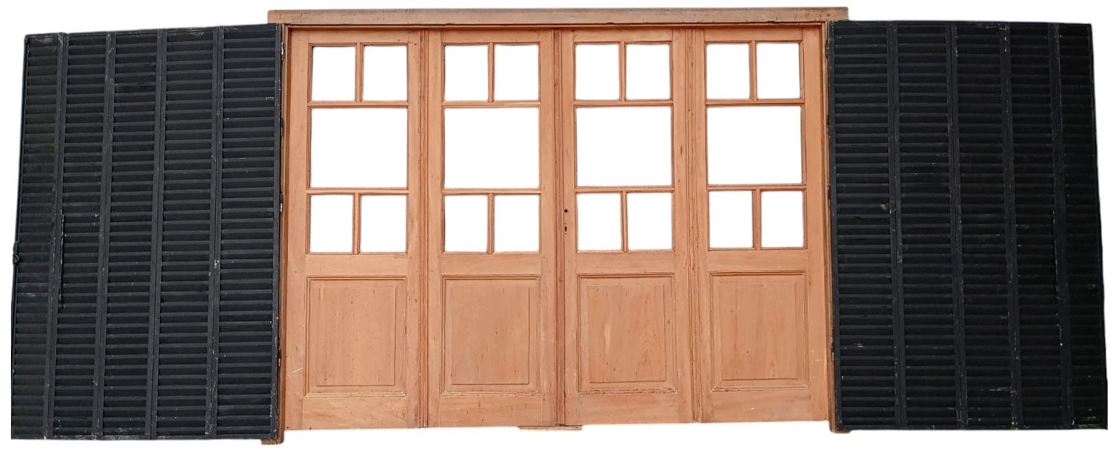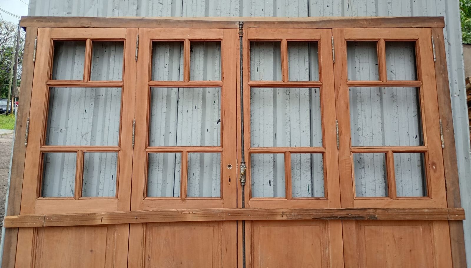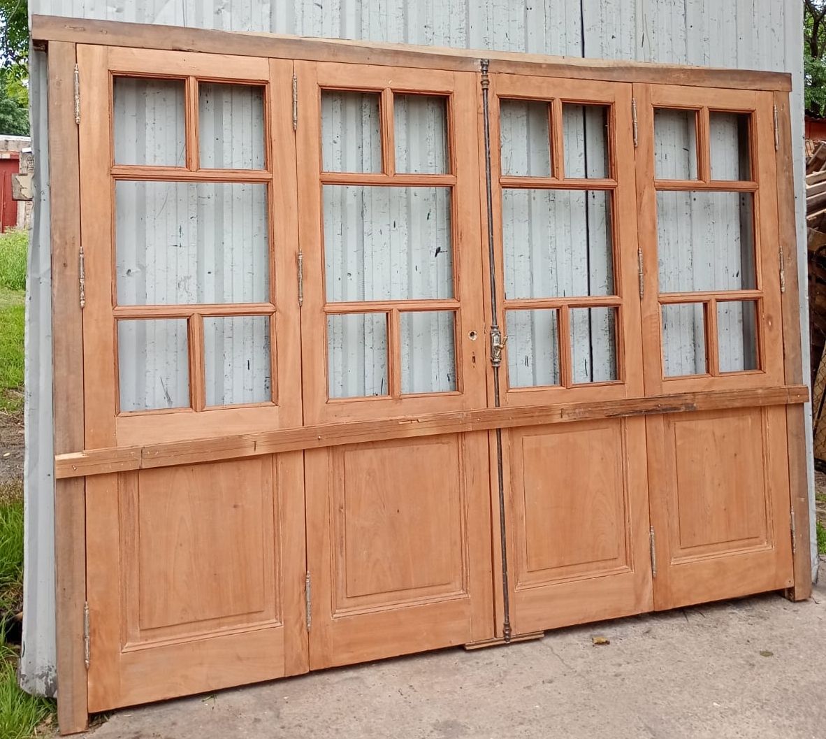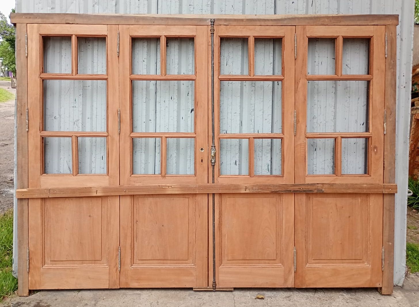 Portada balcón de madera antigua cedro al natural. Es a cuatro hojas de abrir, con vidrios tipo griegos, falleba, tapajuntas, tableros doble replanados inferiores, celosías de hierro y marco de madera dura. La abertura no incluye los vidrios, cerradura ni picaporte. Hojas de 68x203cm.