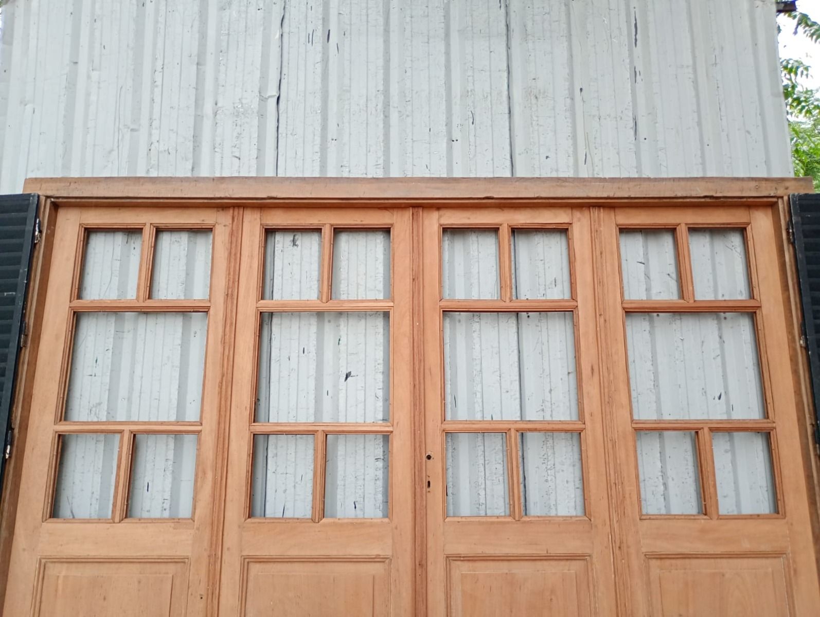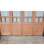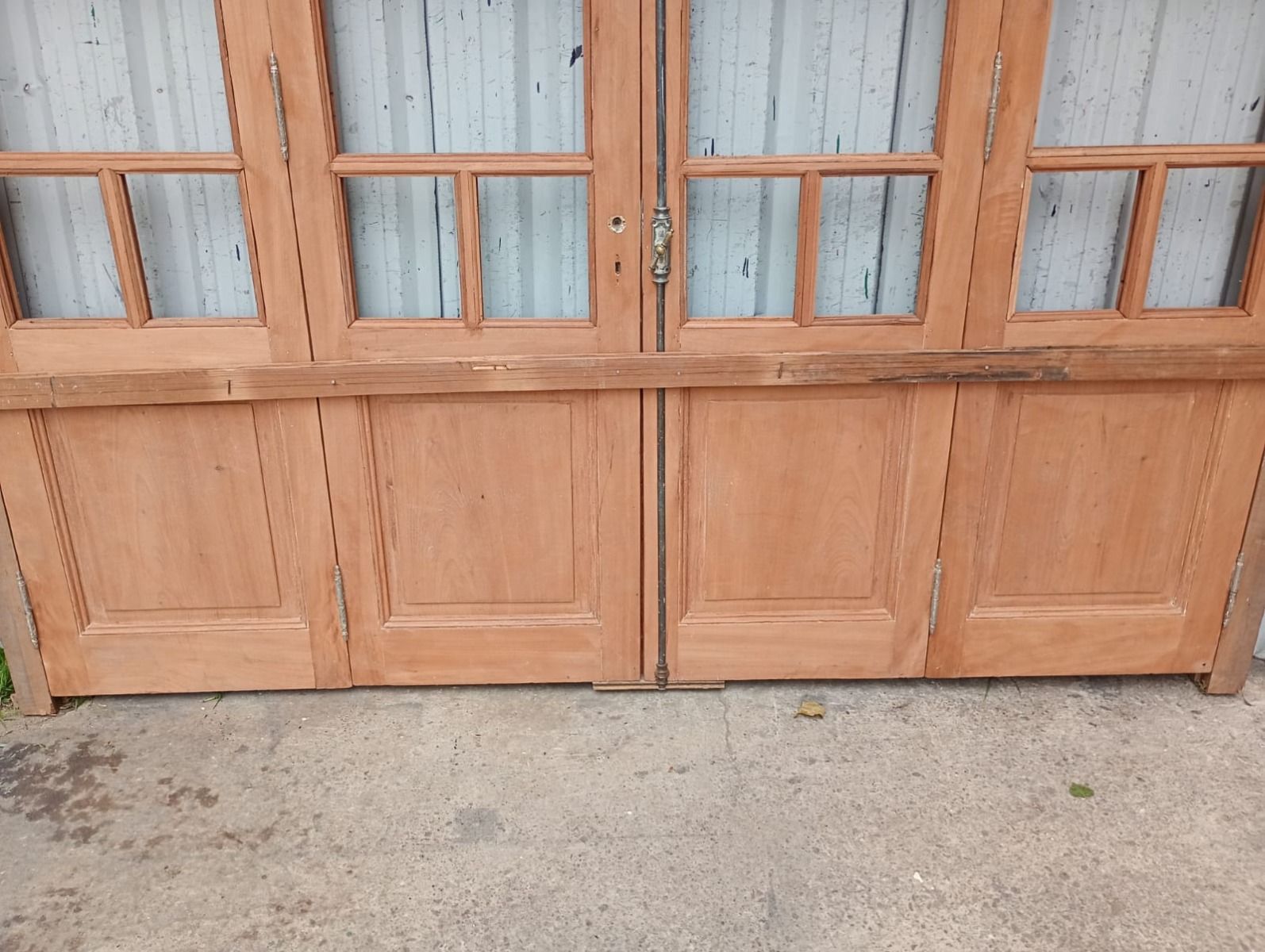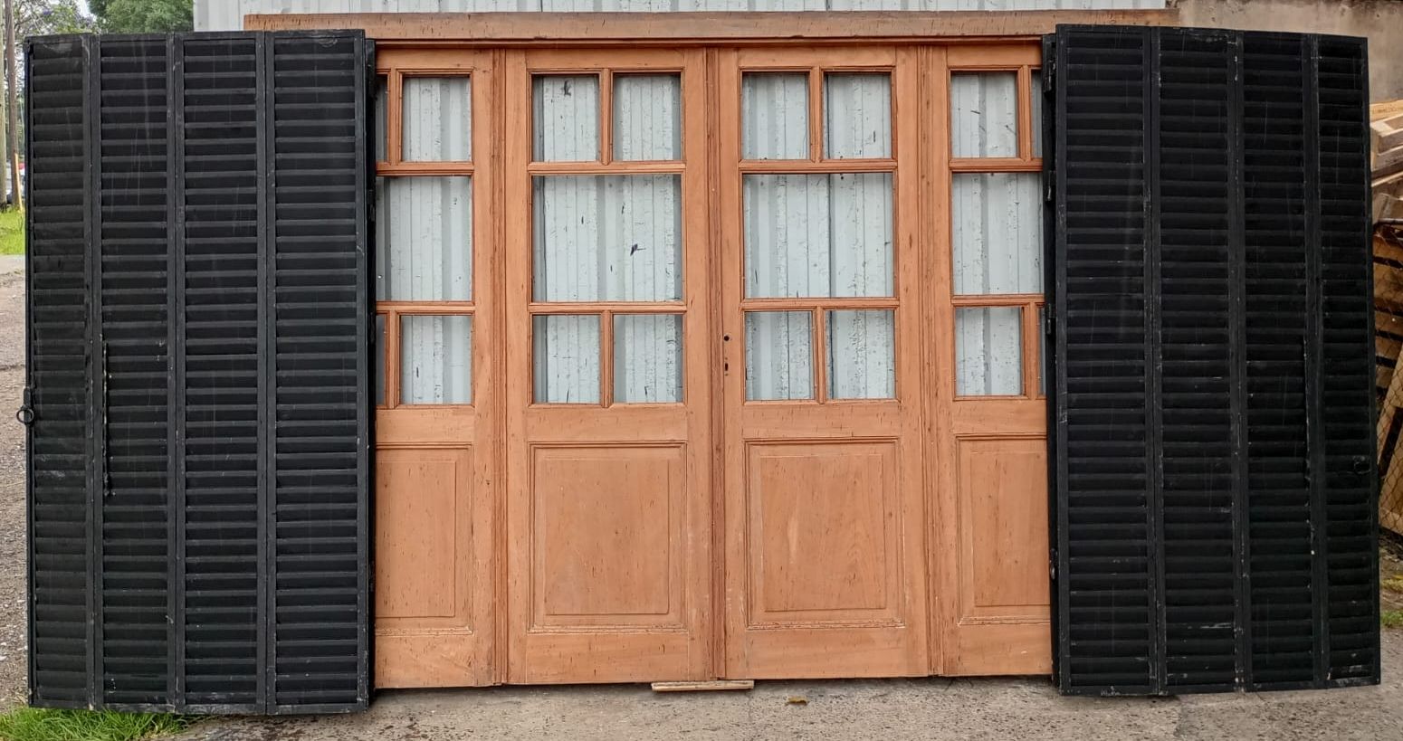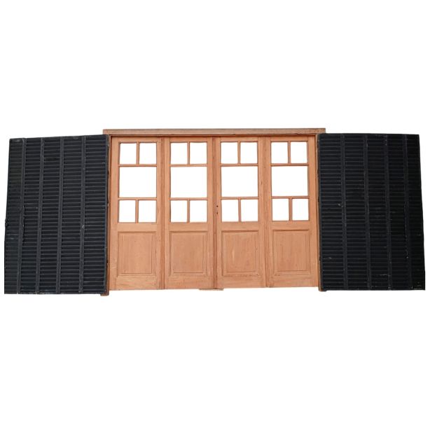 Portada balcón de madera antigua cedro al natural. Es a cuatro hojas de abrir, con vidrios tipo griegos, falleba, tapajuntas, tableros doble replanados inferiores, celosías de hierro y marco de madera dura. La abertura no incluye los vidrios, cerradura ni picaporte. Hojas de 68x203cm.