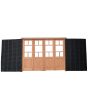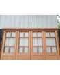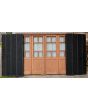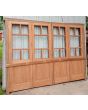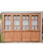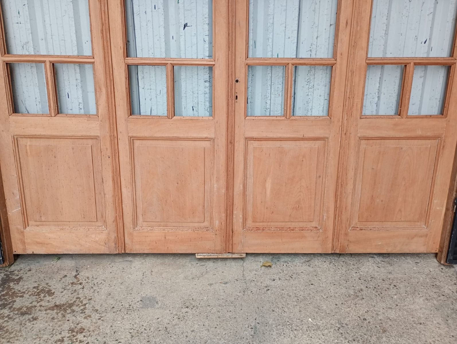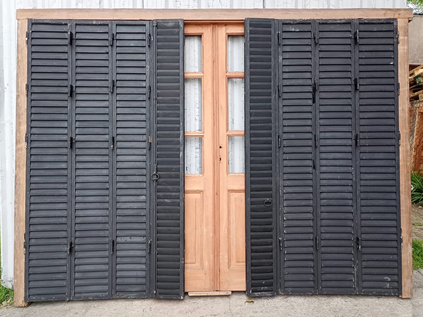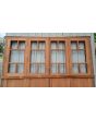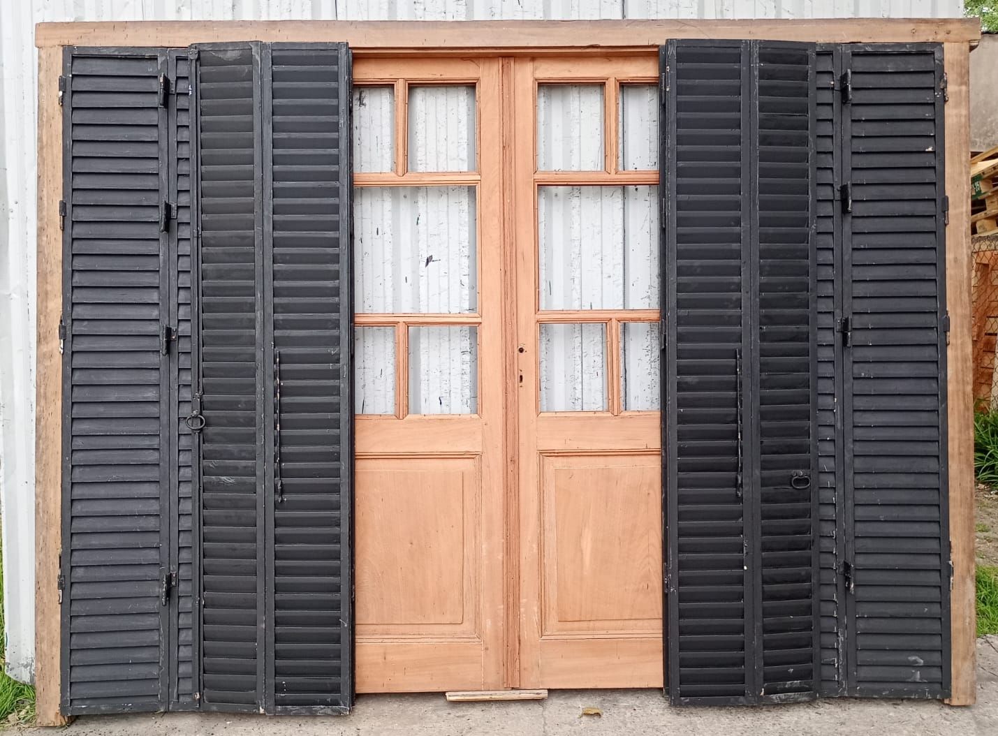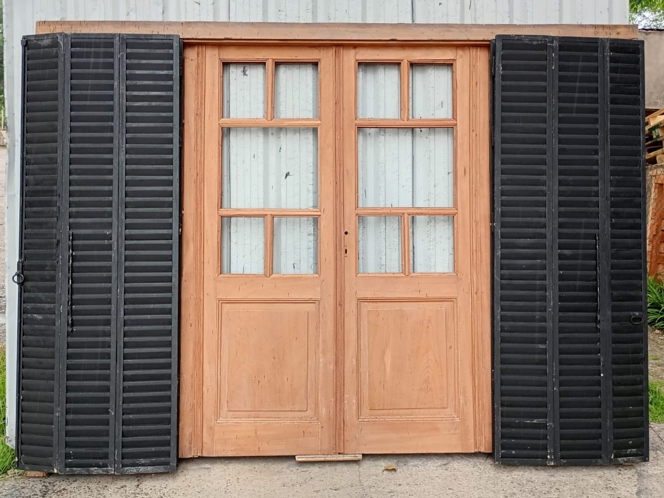 Portada balcón de madera antigua cedro al natural. Es a cuatro hojas de abrir, con vidrios tipo griegos, falleba, tapajuntas, tableros doble replanados inferiores, celosías de hierro y marco de madera dura. La abertura no incluye los vidrios, cerradura ni picaporte. Hojas de 68x203cm.
