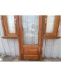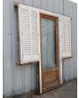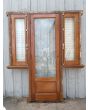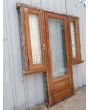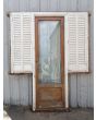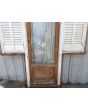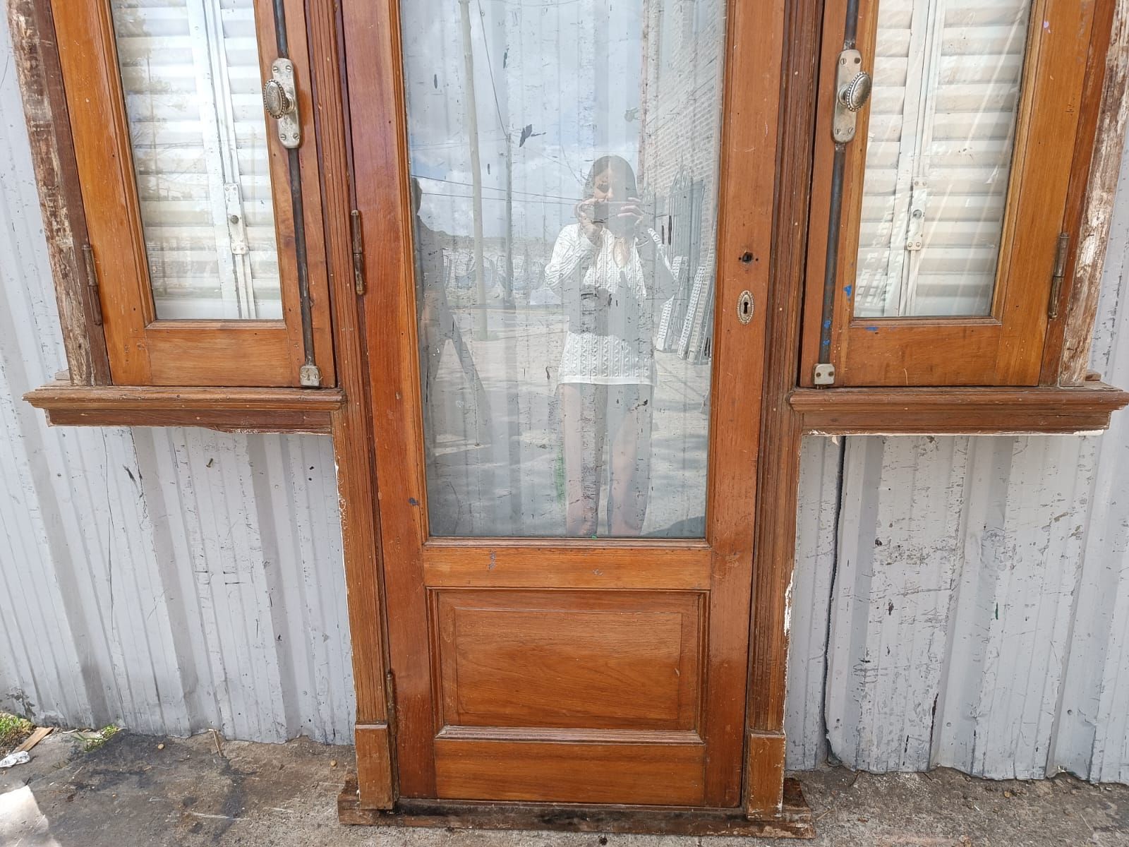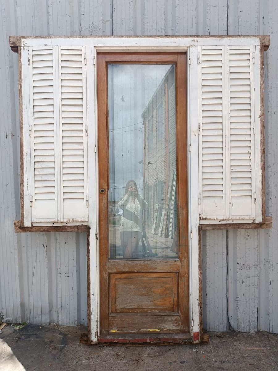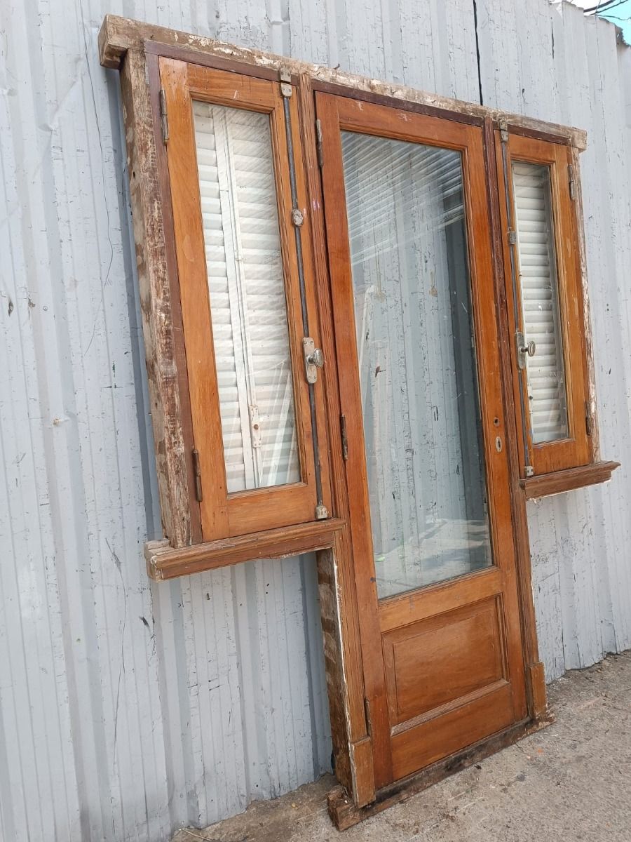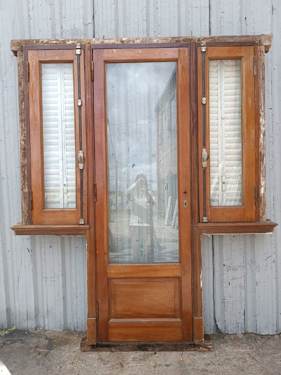 Puerta antigua de madera cedro al natural. Es a una hoja de abrir hacia la derecha y vidrio tipo enterizo. Con ventanas laterales a una hoja de abrir de 42x130cm, celosías de hierro, fallebas y marco de madera dura. La hoja de la puerta mide 72x222cm. La abertura no incluye cerradura ni picaporte, y tiene un alto total de 237cm con el umbral.