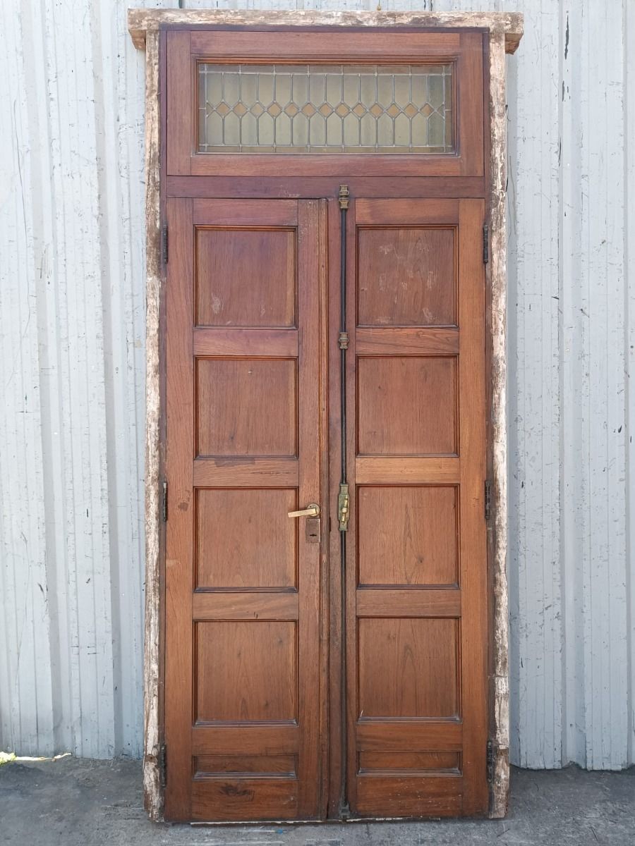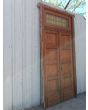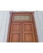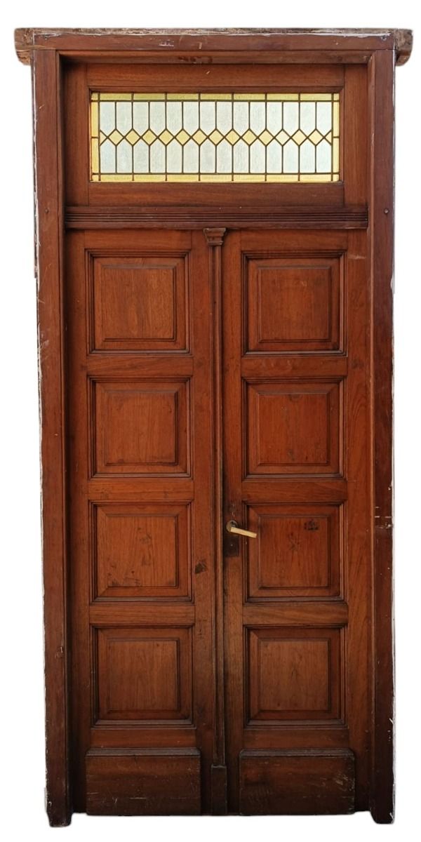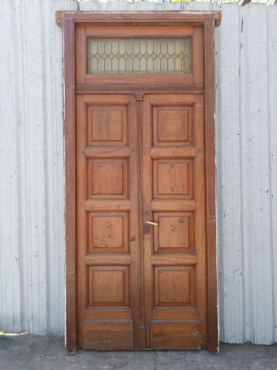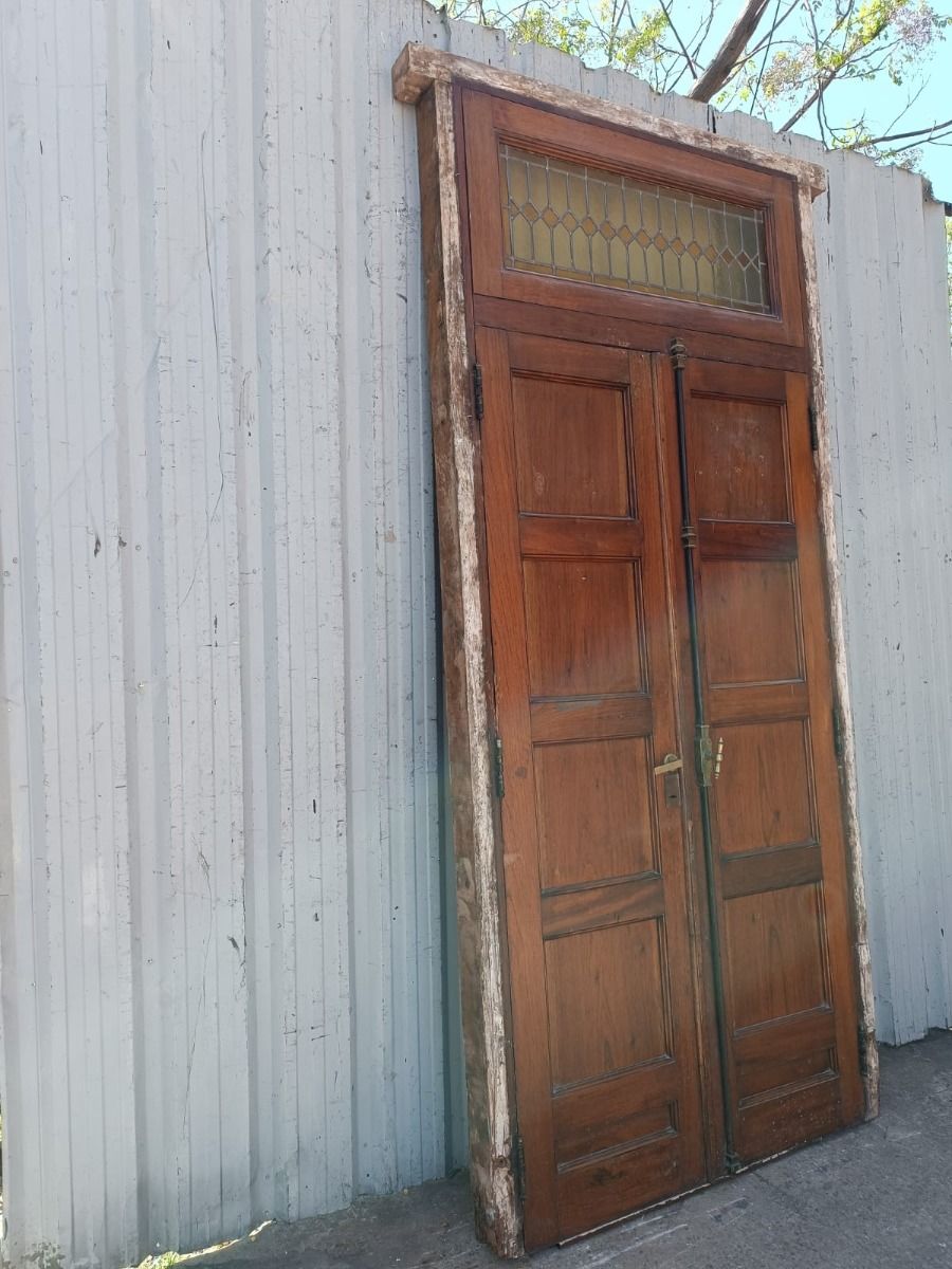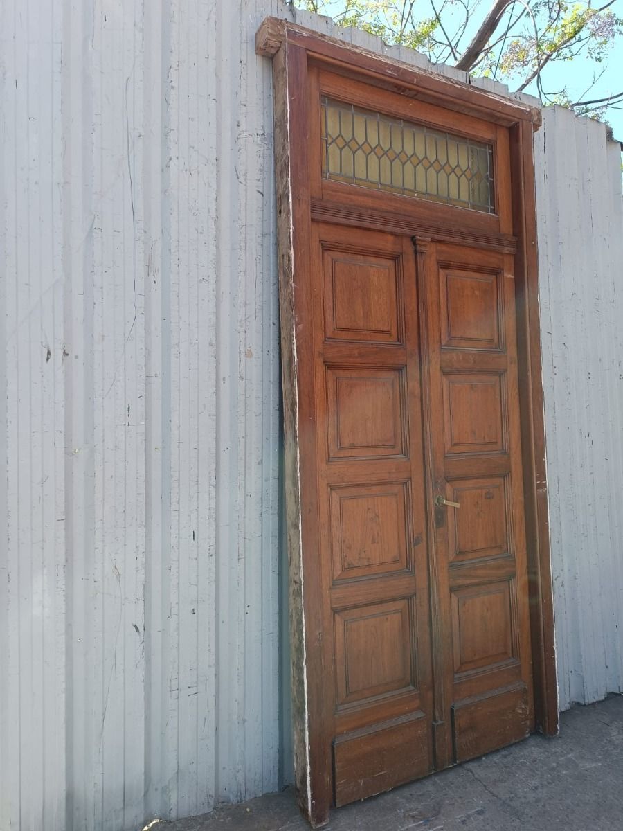 Puerta de frente de madera antigua cedro al natural. Es a dos hojas de abrir ciegas, con tapajunta, capitel, tableros replanados moldurados, banderola fija vitraux, falleba, faldones inferiores y marco de madera dura. La abertura no incluye cerradura ni picaporte. Hojas de 56x217cm.