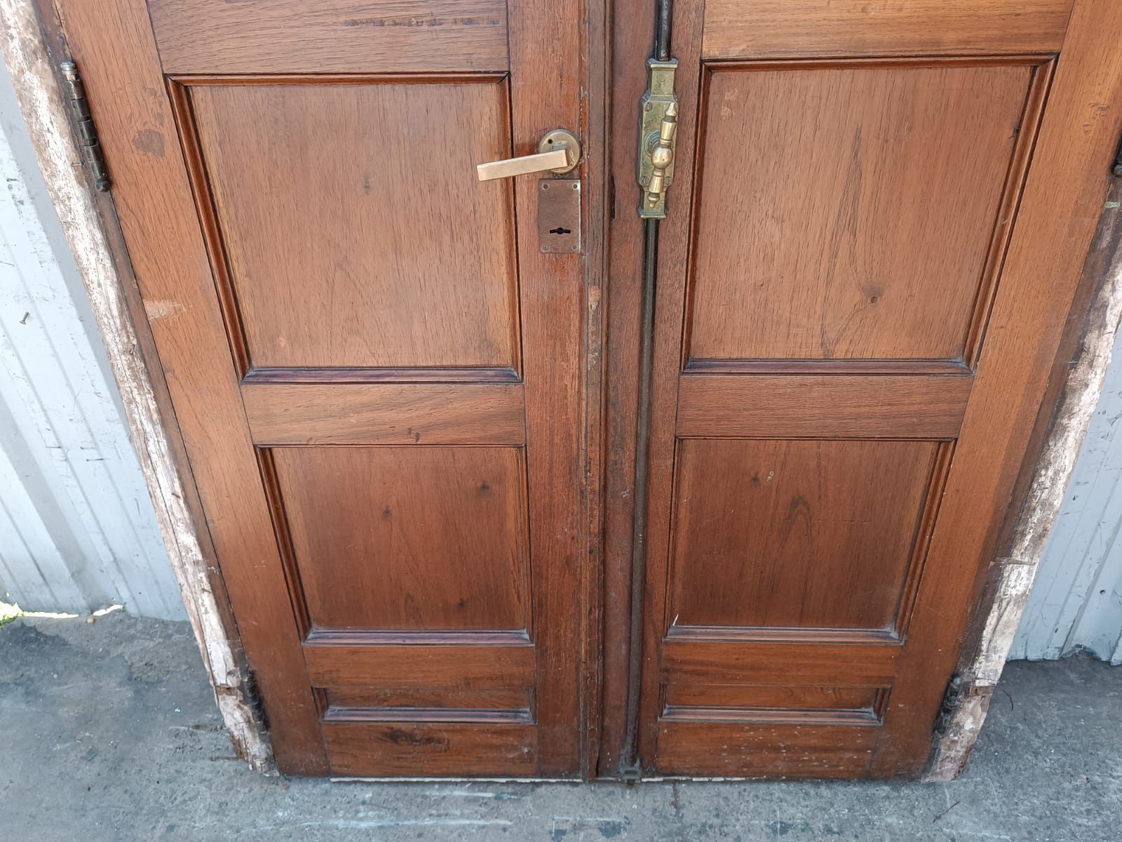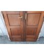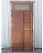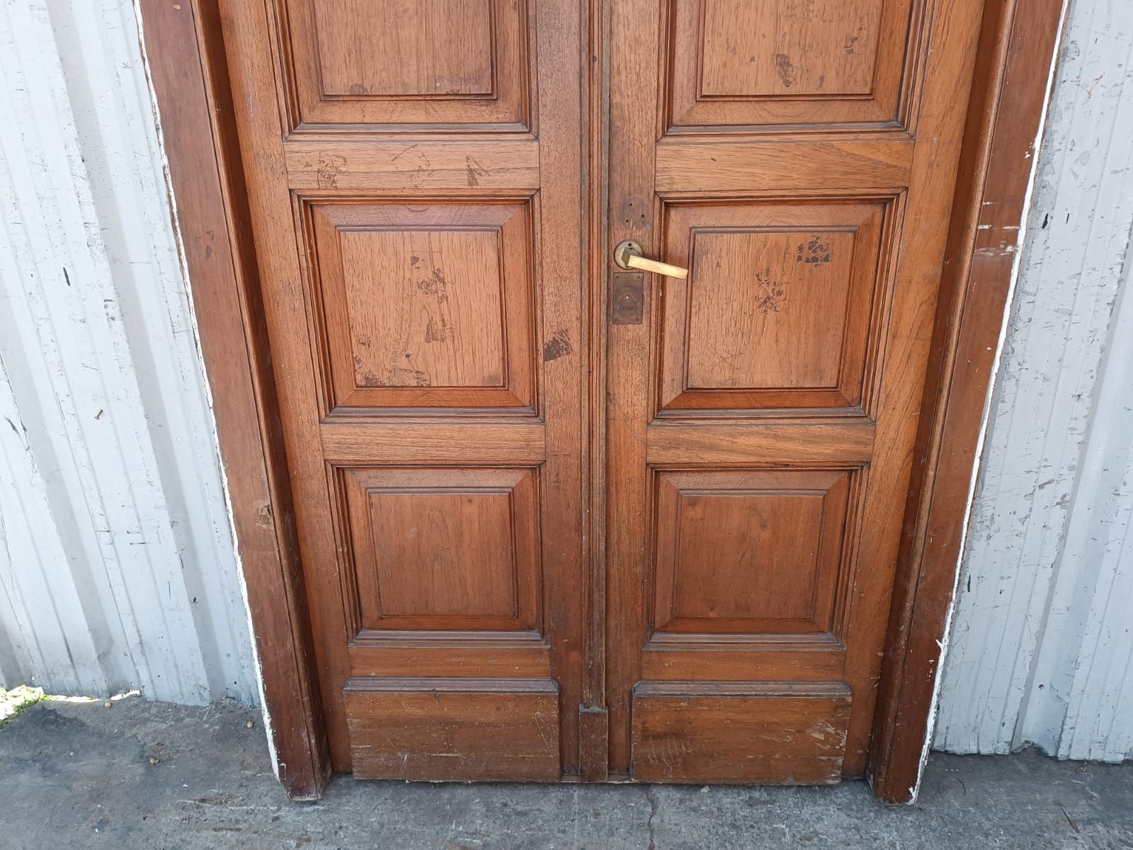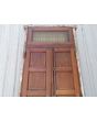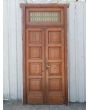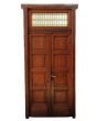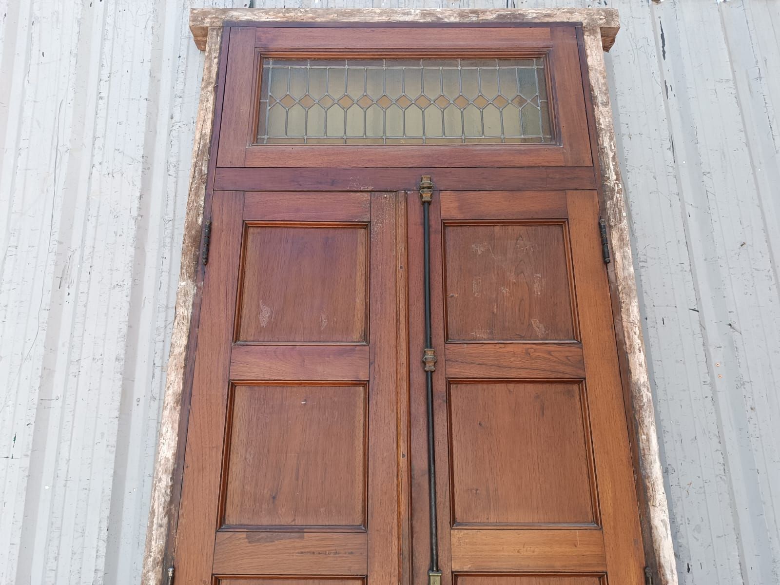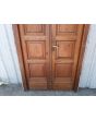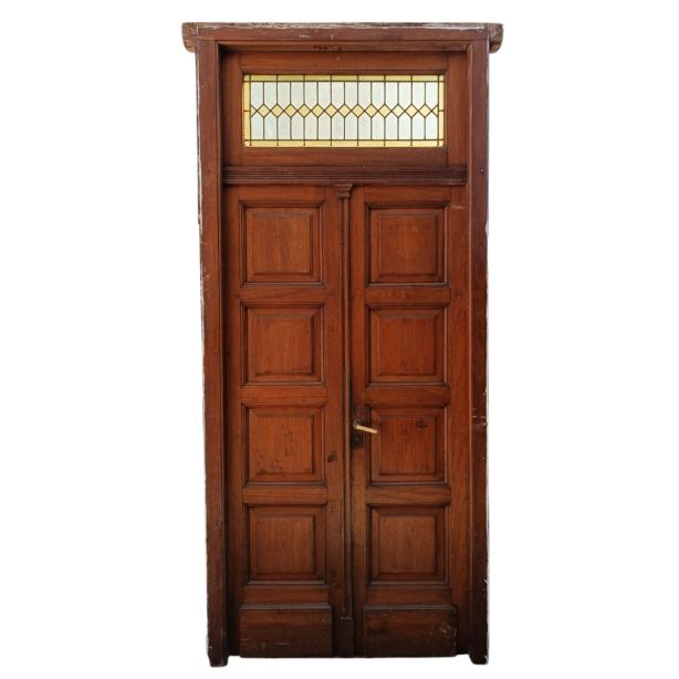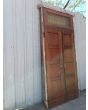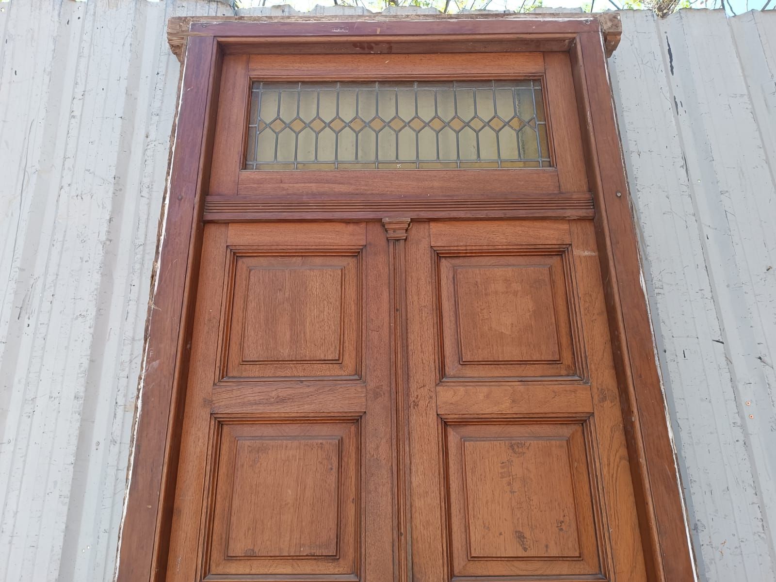 Puerta de frente de madera antigua cedro al natural. Es a dos hojas de abrir ciegas, con tapajunta, capitel, tableros replanados moldurados, banderola fija vitraux, falleba, faldones inferiores y marco de madera dura. La abertura no incluye cerradura ni picaporte. Hojas de 56x217cm.
