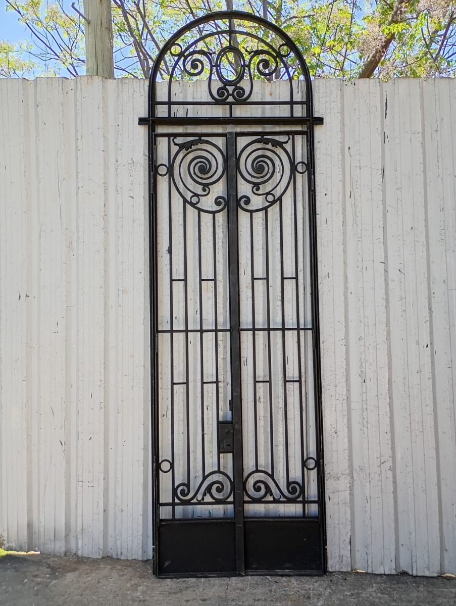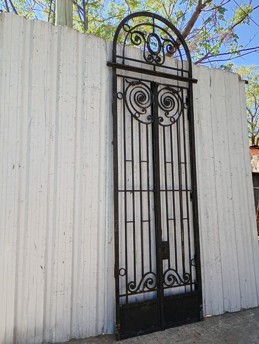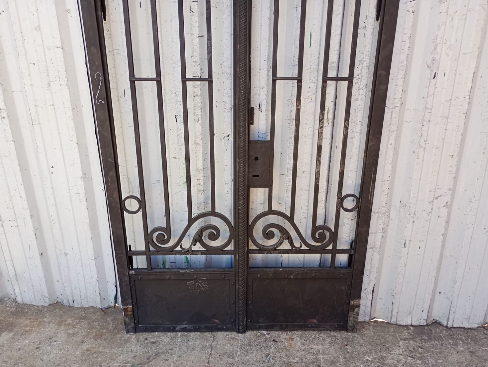 Dos antiguas puertas de frente de hierro forjado recicladas, arenadas y pintadas de negro. A dos hojas de abrir, con banderola fija, círculos, rulos, tapajunta moldurada, y marco de hierro. Una tiene postigos y la otra no. Las aberturas no incluyen bisagras, cerradura, vidrios ni picaporte. Hojas de 50x267cm. PRECIO POR UNIDAD.