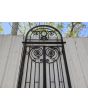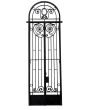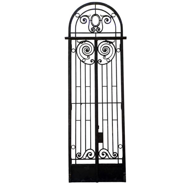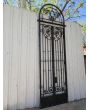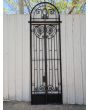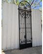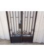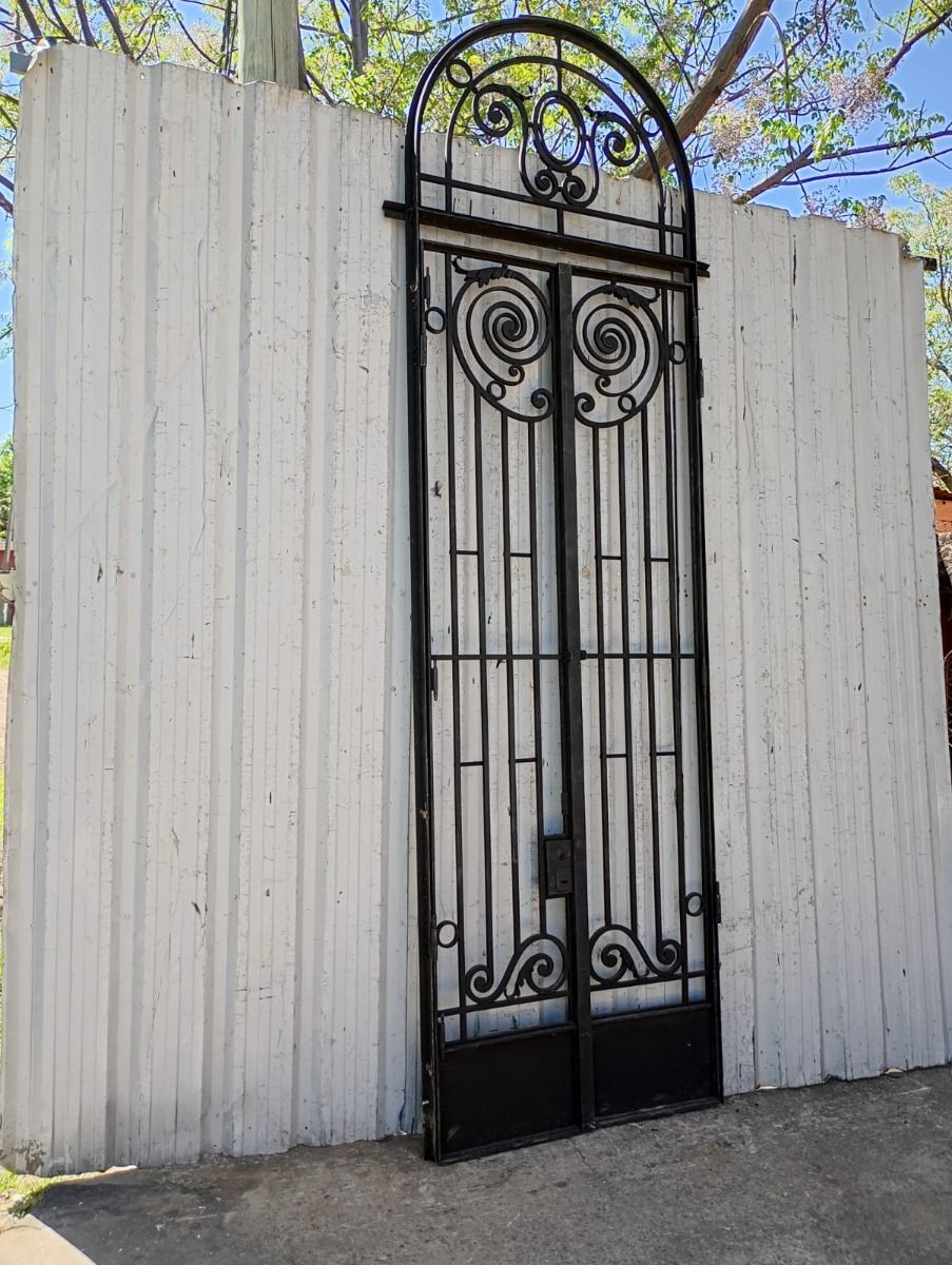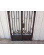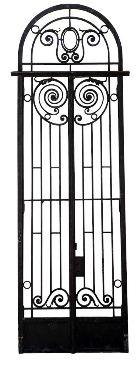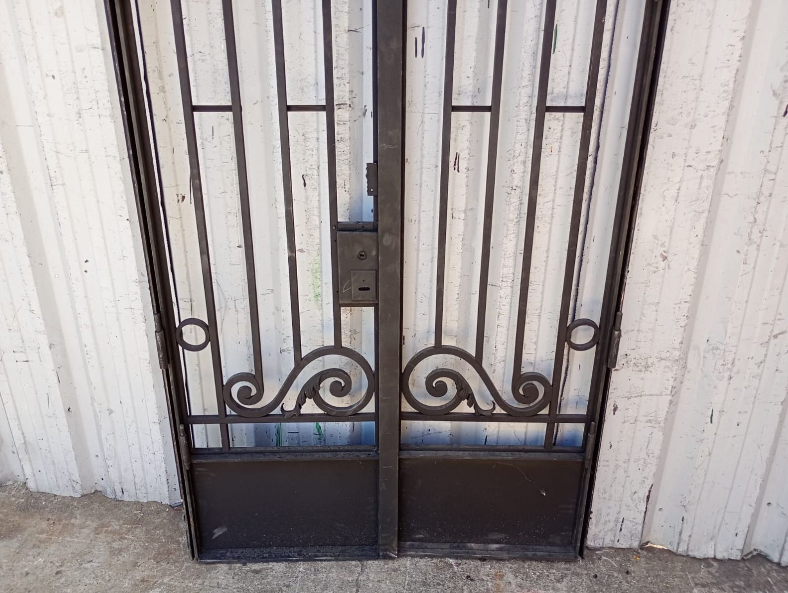 Dos antiguas puertas de frente de hierro forjado recicladas, arenadas y pintadas de negro. A dos hojas de abrir, con banderola fija, círculos, rulos, tapajunta moldurada, y marco de hierro. Una tiene postigos y la otra no. Las aberturas no incluyen bisagras, cerradura, vidrios ni picaporte. Hojas de 50x267cm. PRECIO POR UNIDAD.