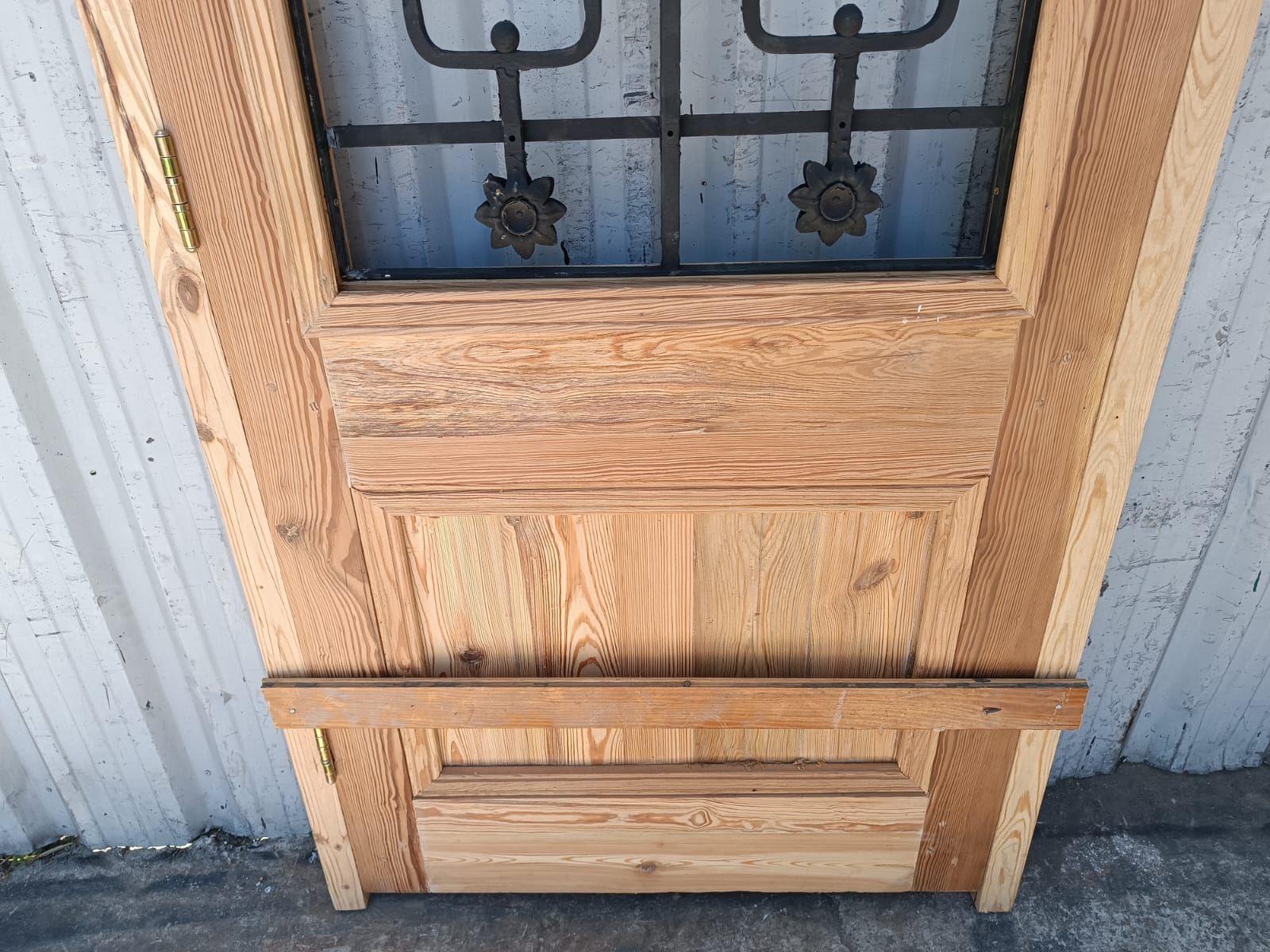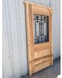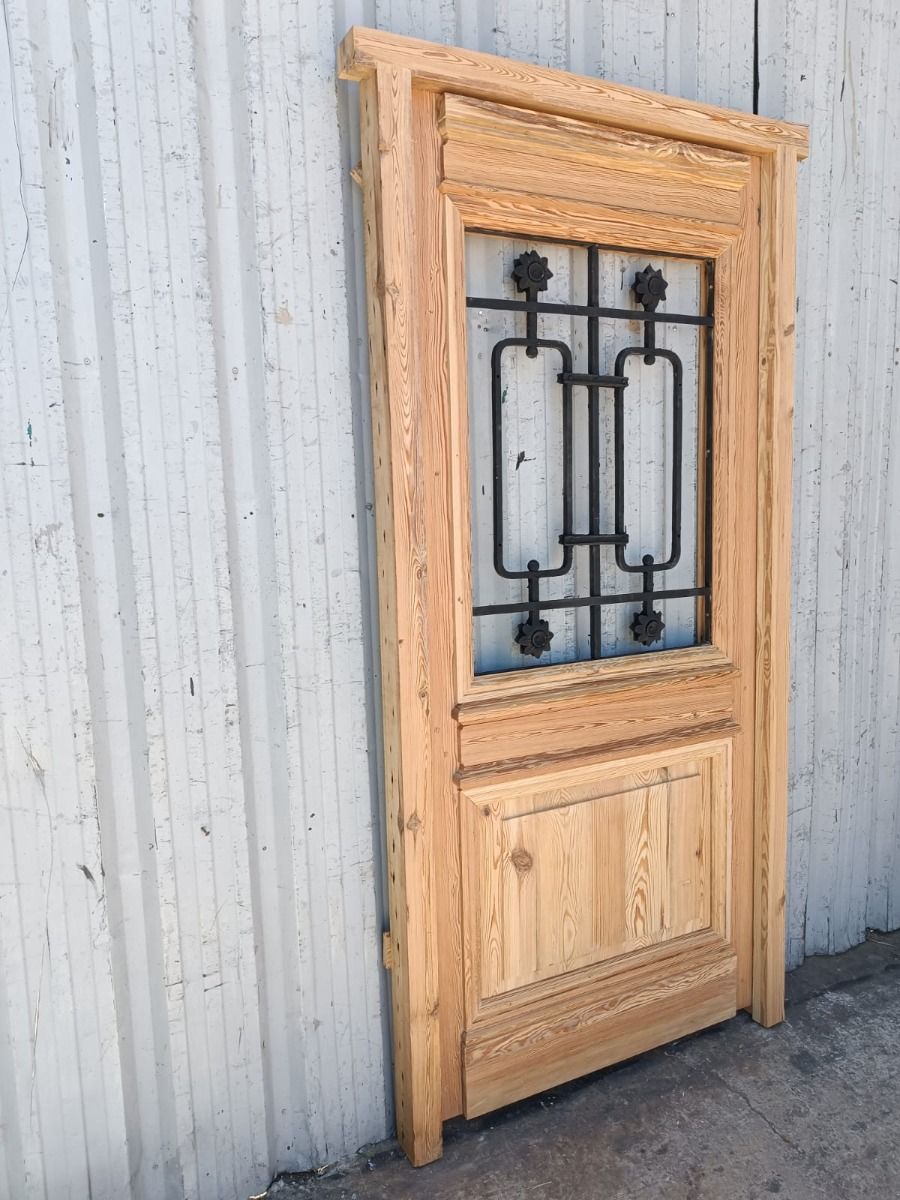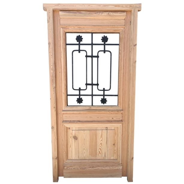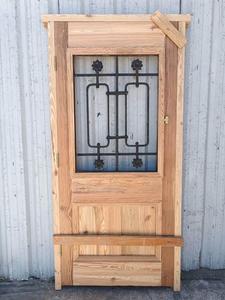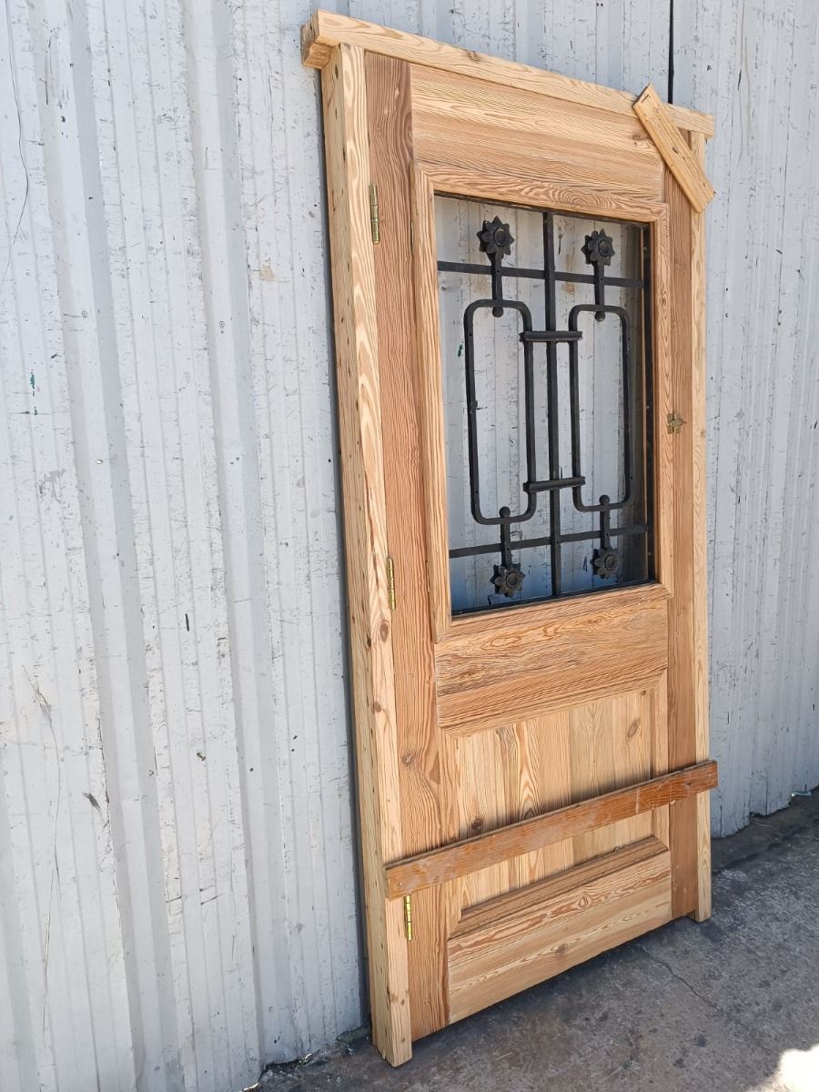 Puerta de frente en madera antigua pinotea al natural. Es de dos pulgadas de espesor, a una hoja de abrir hacia la derecha. Con reja de hierro, postigo vidriado de abrir, molduras superiores, tablero replanado moldurado inferior y marco de madera dura. La abertura no incluye vidrios, caladura, cerradura ni picaporte. Hoja de 90x205cm.