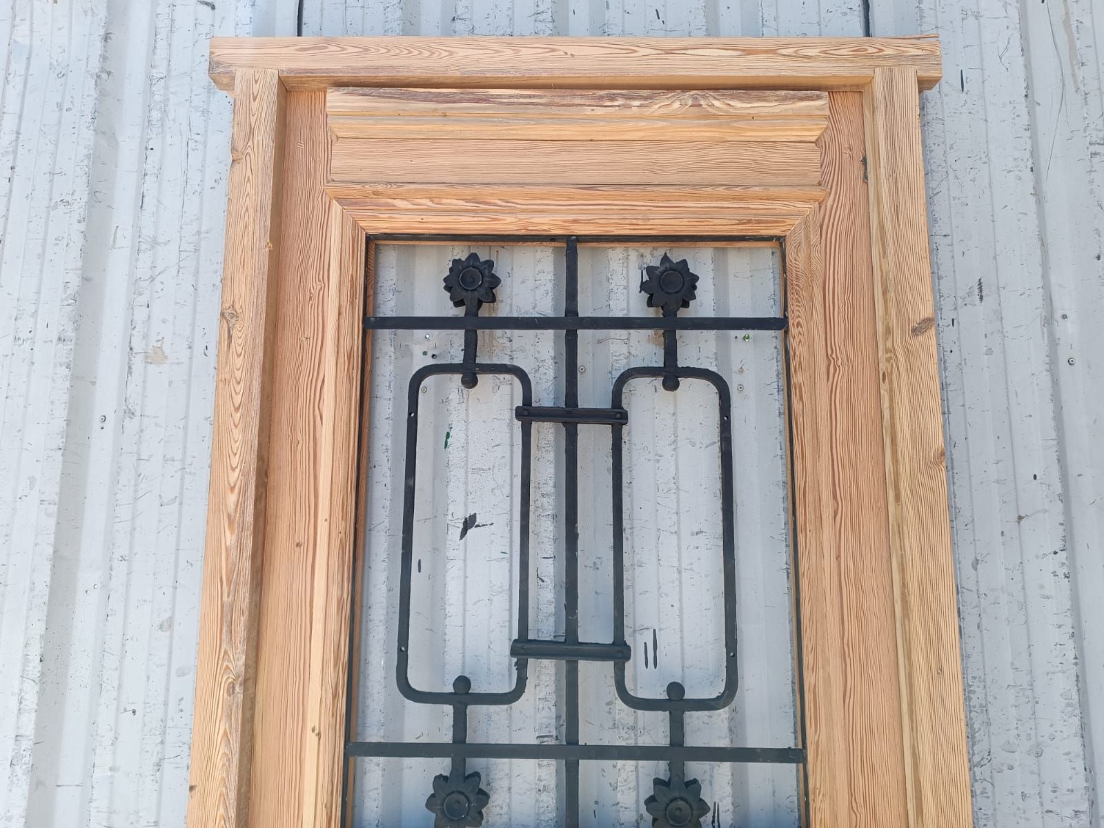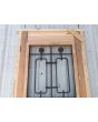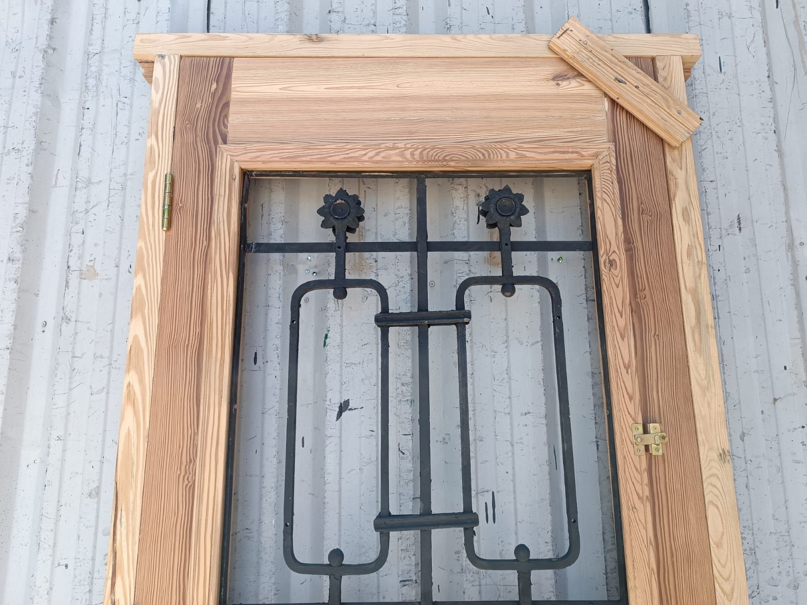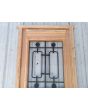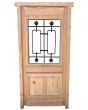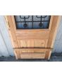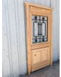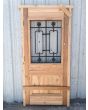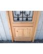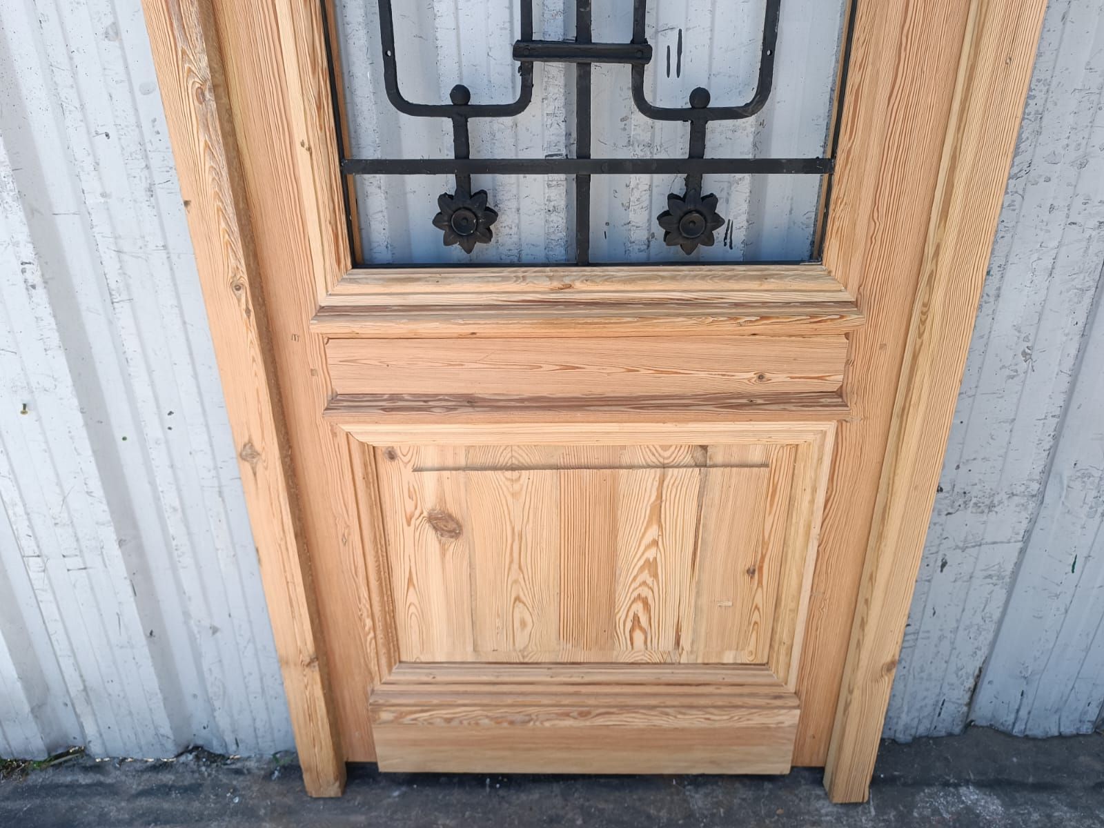 Puerta de frente en madera antigua pinotea al natural. Es de dos pulgadas de espesor, a una hoja de abrir hacia la derecha. Con reja de hierro, postigo vidriado de abrir, molduras superiores, tablero replanado moldurado inferior y marco de madera dura. La abertura no incluye vidrios, caladura, cerradura ni picaporte. Hoja de 90x205cm.