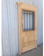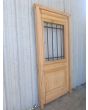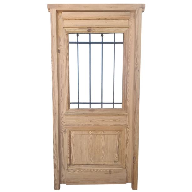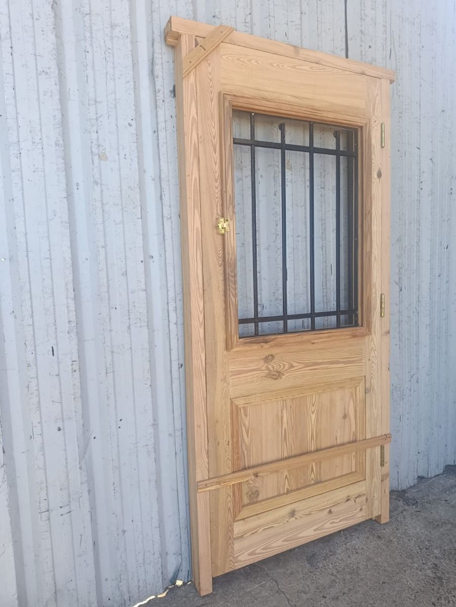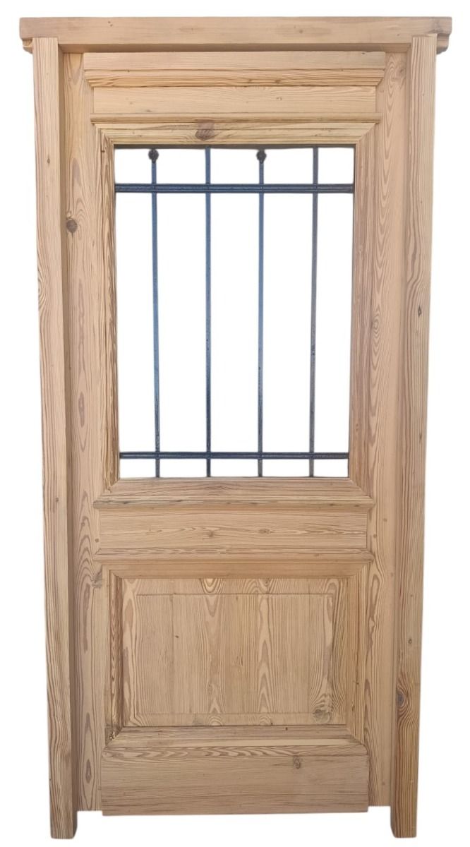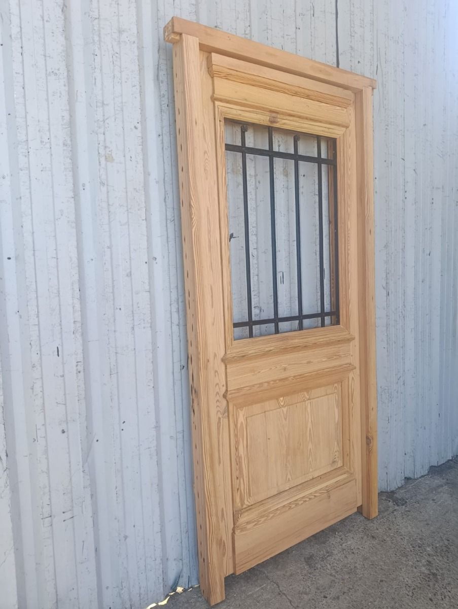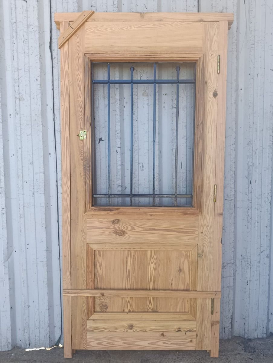 Puerta de frente en madera antigua pinotea al natural. Es de dos pulgadas de espesor, a una hoja de abrir hacia la izquierda. Con reja de hierro, postigo vidriado de abrir, molduras superiores, tablero replanado moldurado inferior y marco de madera dura. La abertura no incluye vidrios, caladura, cerradura ni picaporte. Hoja de 90x205cm.