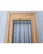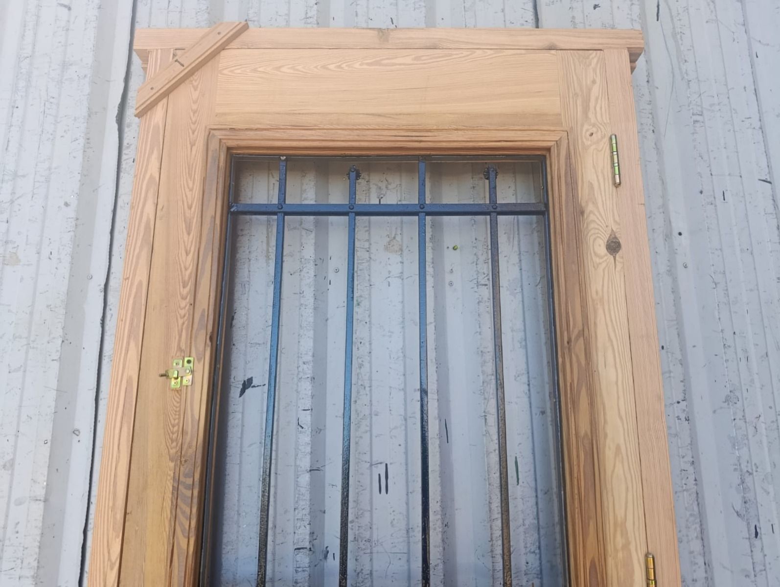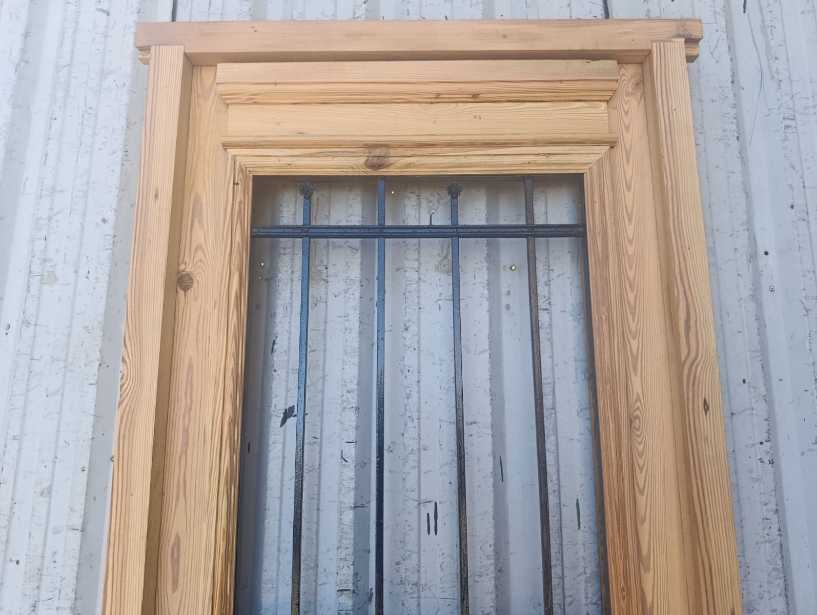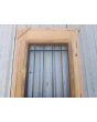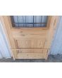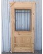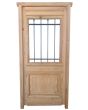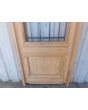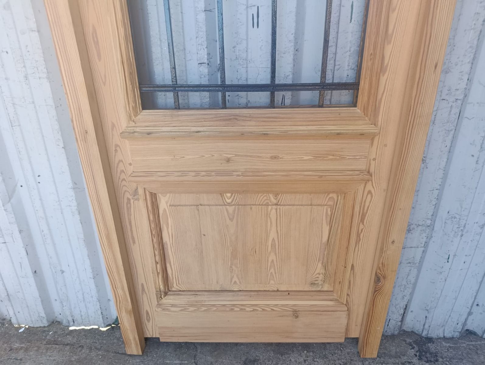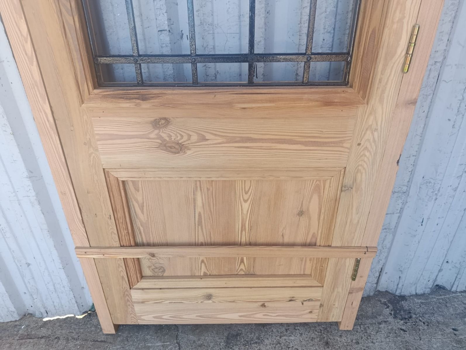Puerta de frente en madera antigua pinotea al natural. Es de dos pulgadas de espesor, a una hoja de abrir hacia la izquierda. Con reja de hierro, postigo vidriado de abrir, molduras superiores, tablero replanado moldurado inferior y marco de madera dura. La abertura no incluye vidrios, caladura, cerradura ni picaporte. Hoja de 90x205cm.