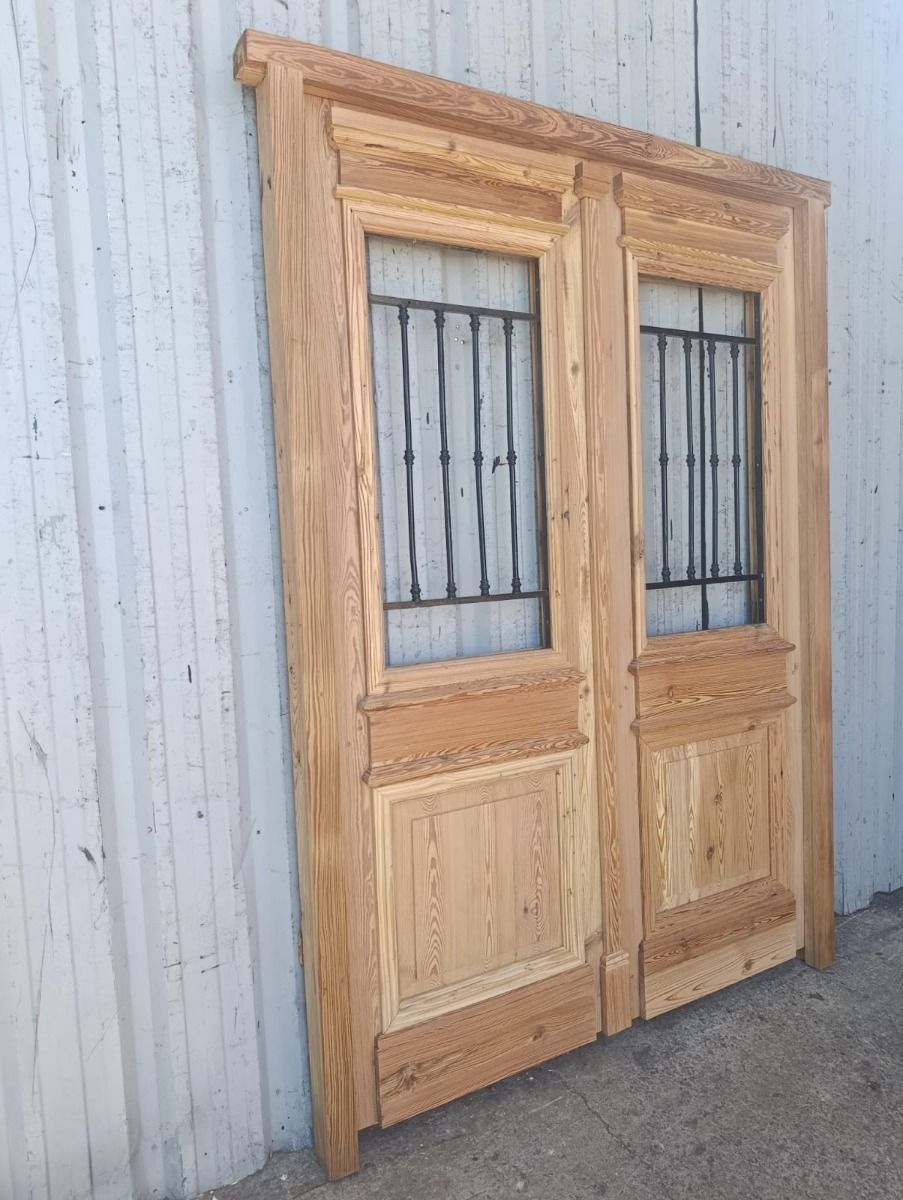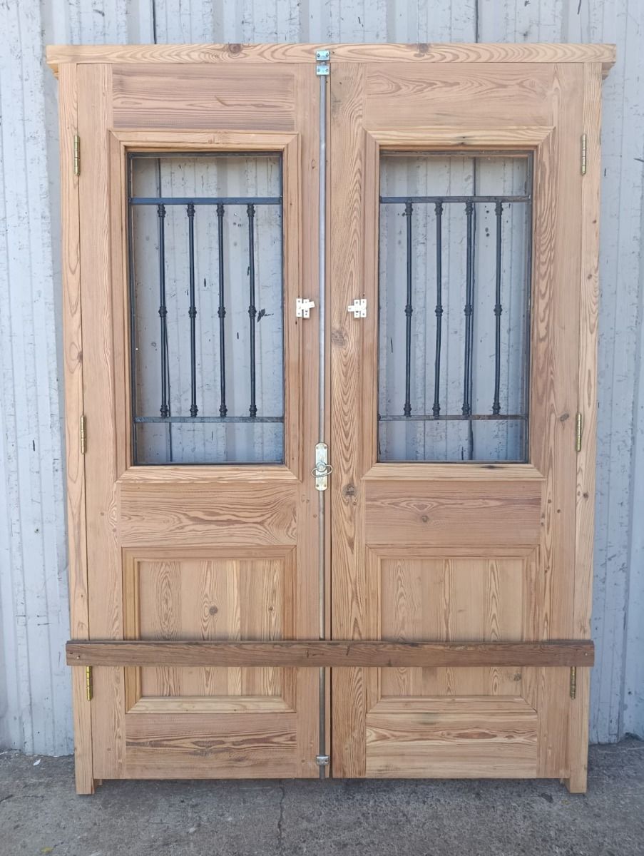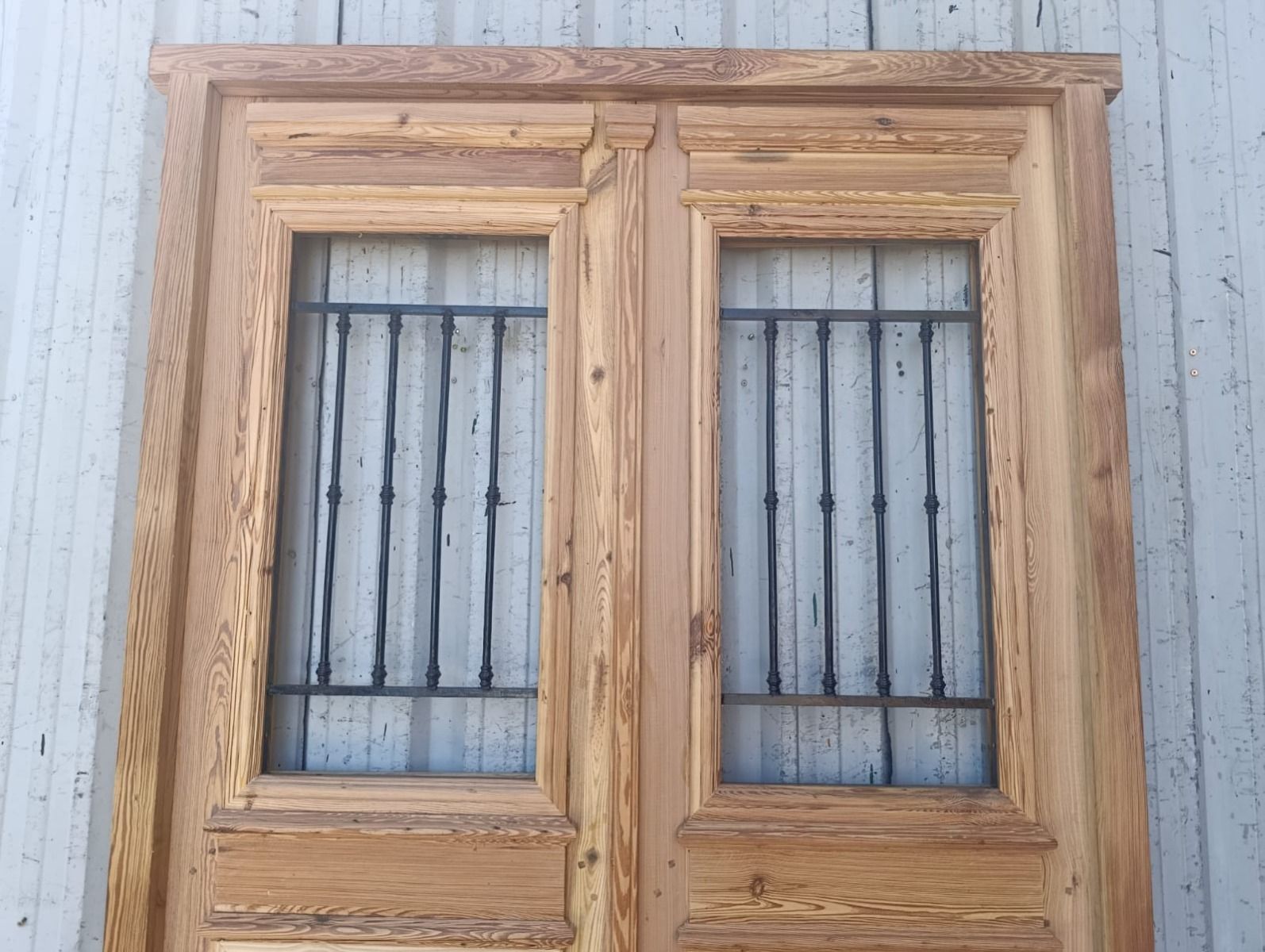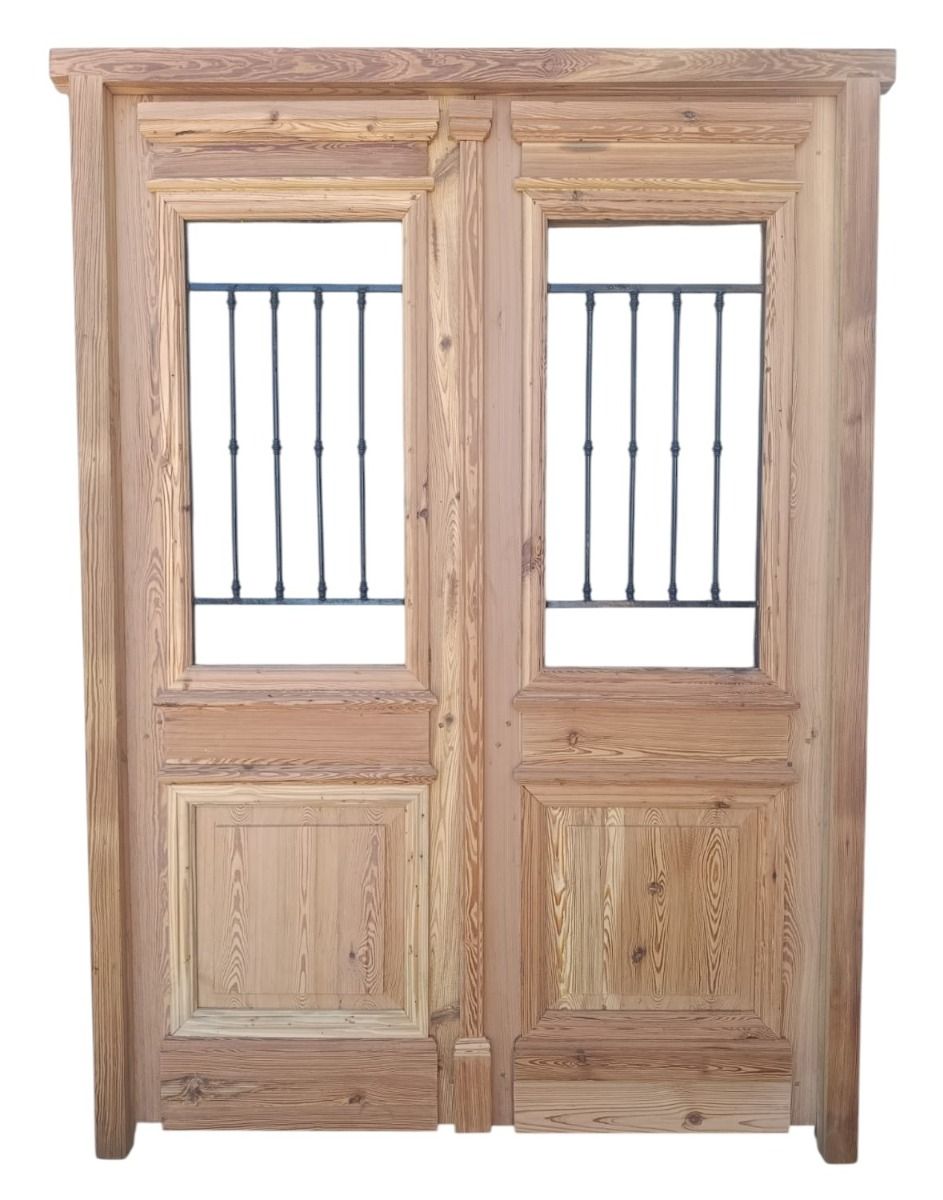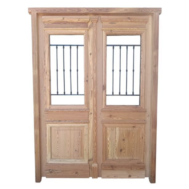 Puerta de frente en madera antigua pinotea al natural. Es de dos pulgadas de espesor, a dos hojas de abrir y vidrios tipo enterizos. Con rejas de hierro, postigos vidriados de abrir, molduras superiores, tapajunta, capitel, tableros replanados moldurados inferiores, falleba y marco de madera dura. La abertura no incluye vidrios, caladura, cerradura ni picaporte. Hojas de 70x205cm.