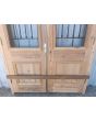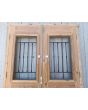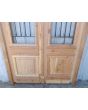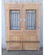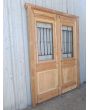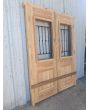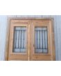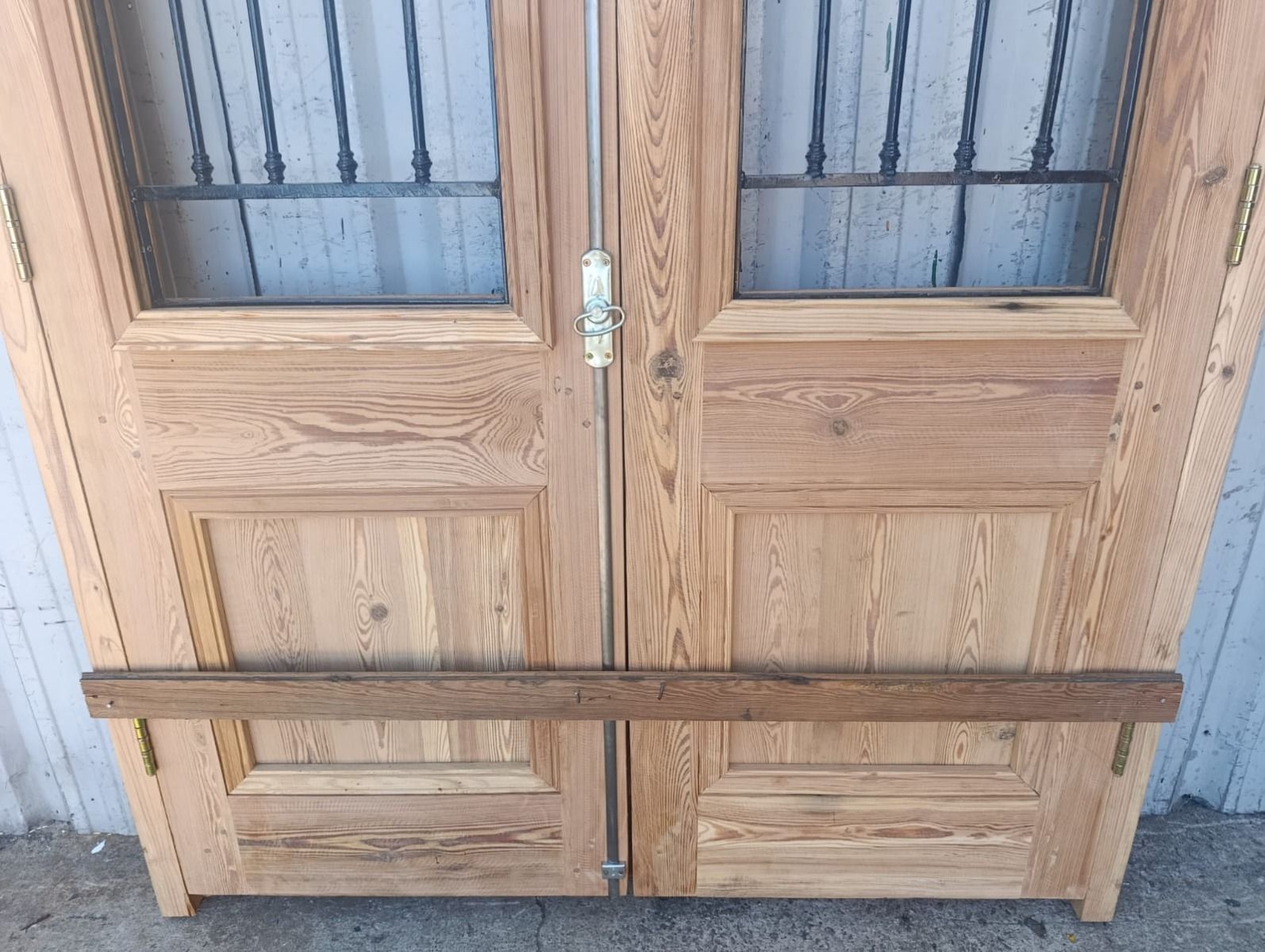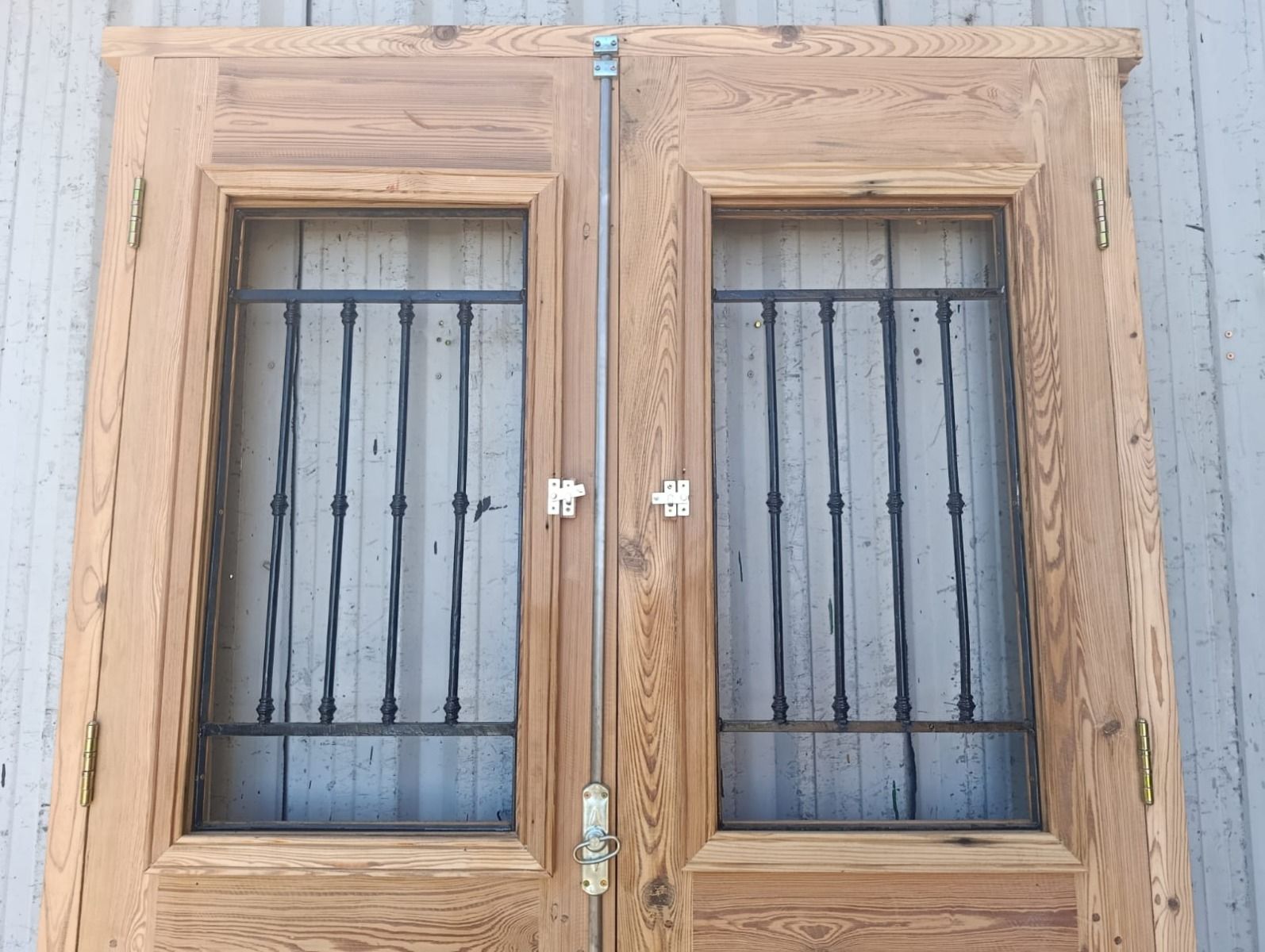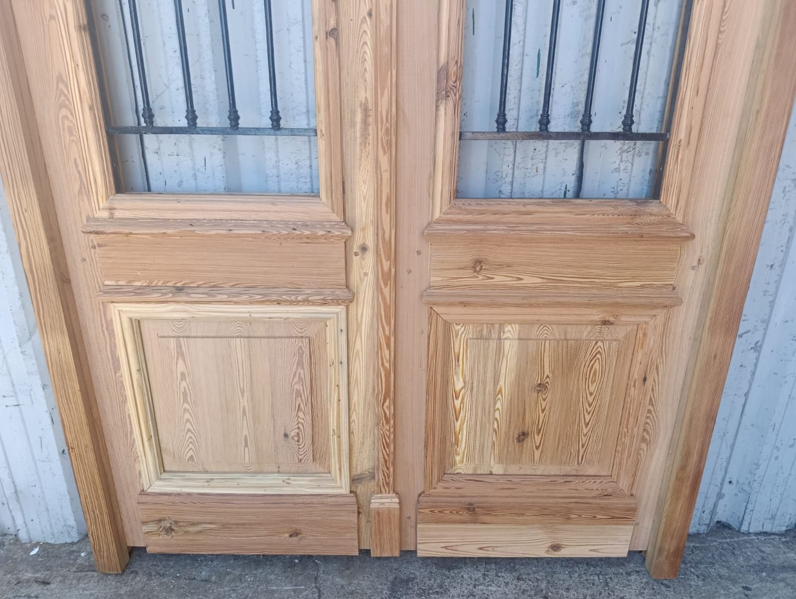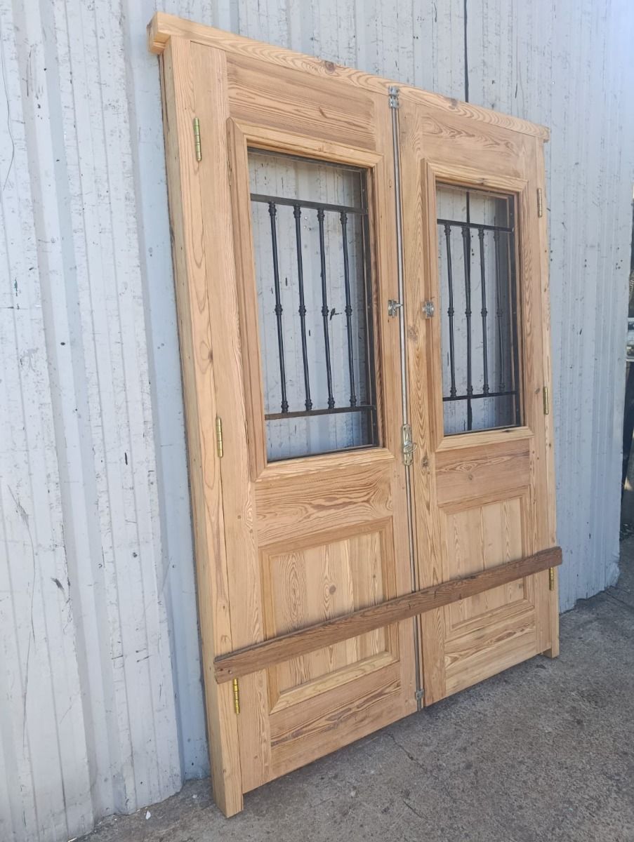 Puerta de frente en madera antigua pinotea al natural. Es de dos pulgadas de espesor, a dos hojas de abrir y vidrios tipo enterizos. Con rejas de hierro, postigos vidriados de abrir, molduras superiores, tapajunta, capitel, tableros replanados moldurados inferiores, falleba y marco de madera dura. La abertura no incluye vidrios, caladura, cerradura ni picaporte. Hojas de 70x205cm.