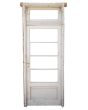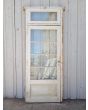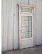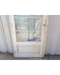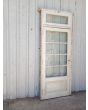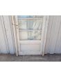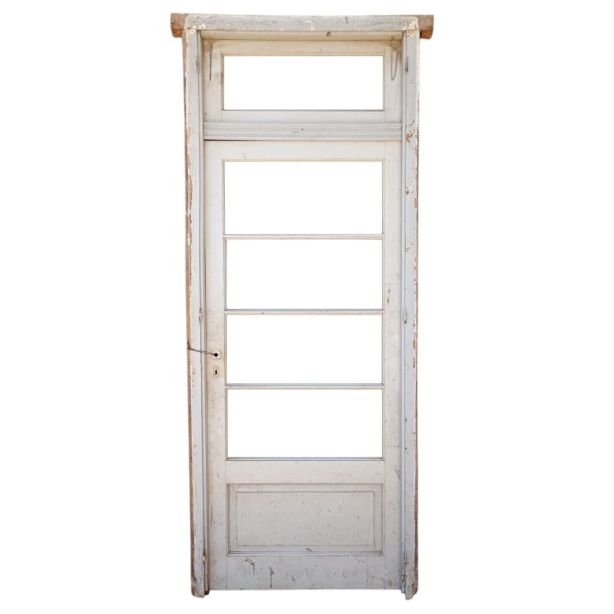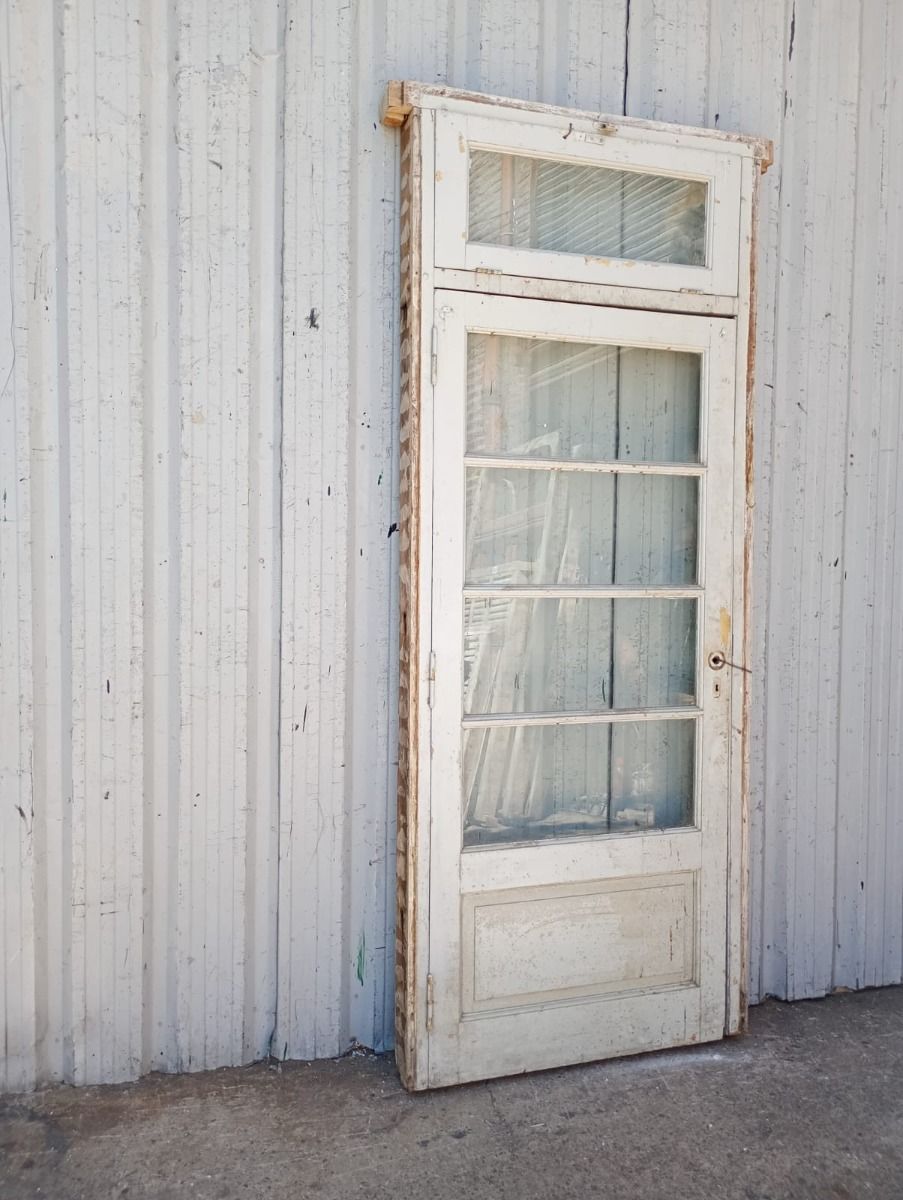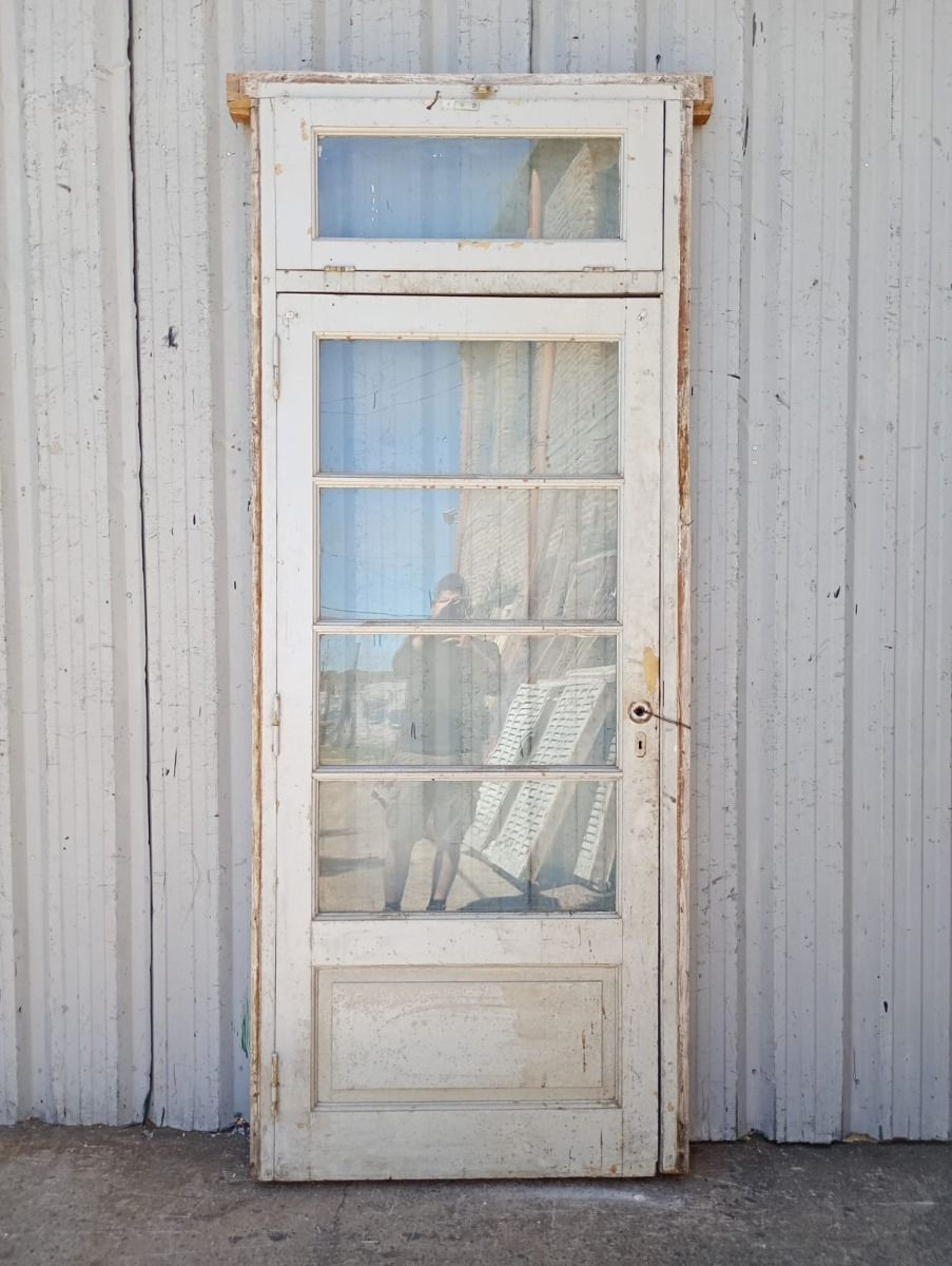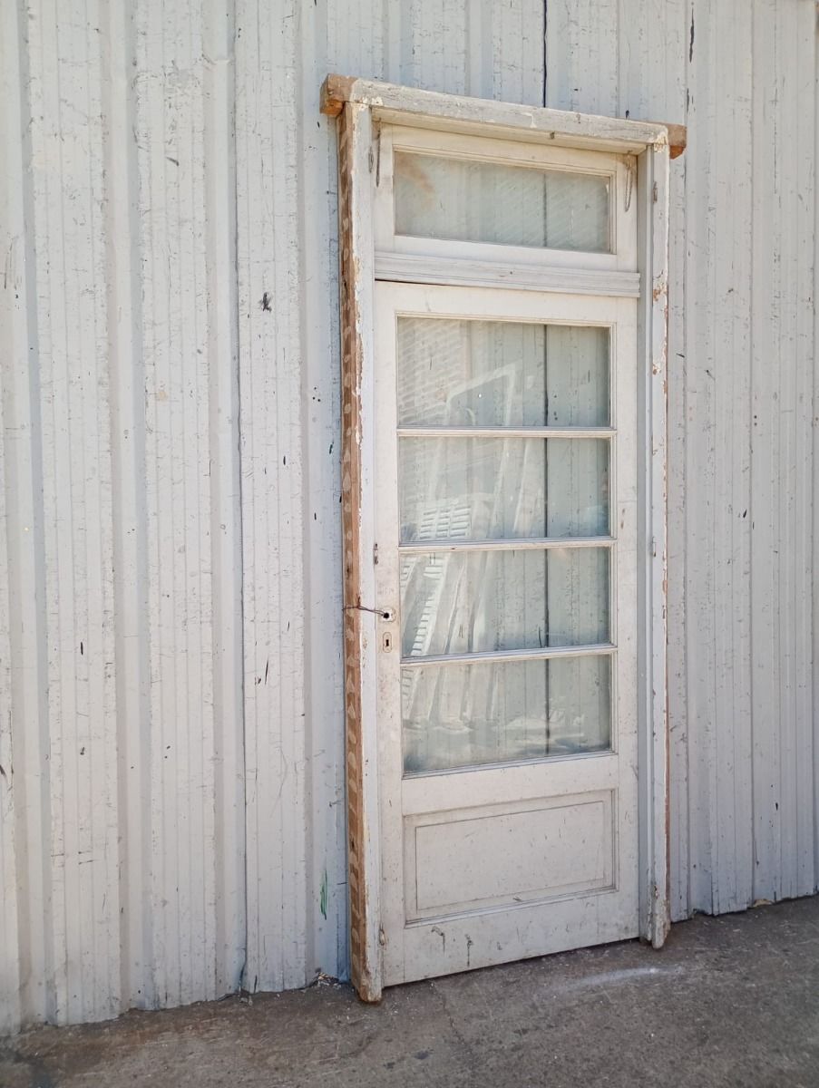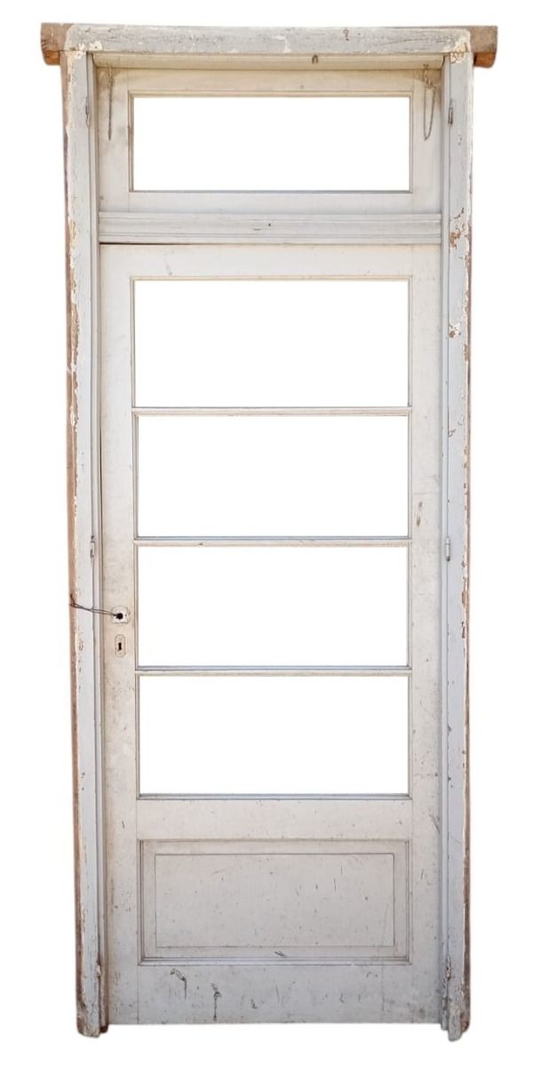 Antigua puerta de madera cedro pintada de blanco. Es a una hoja de abrir hacia la derecha, con vidrios tipo apaisados, banderola de abrir, tablero doble replanado inferior y marco de madera pinotea. La abertura no incluye todos los vidrios, la cerradura ni el picaporte. Hoja de 87x200cm.