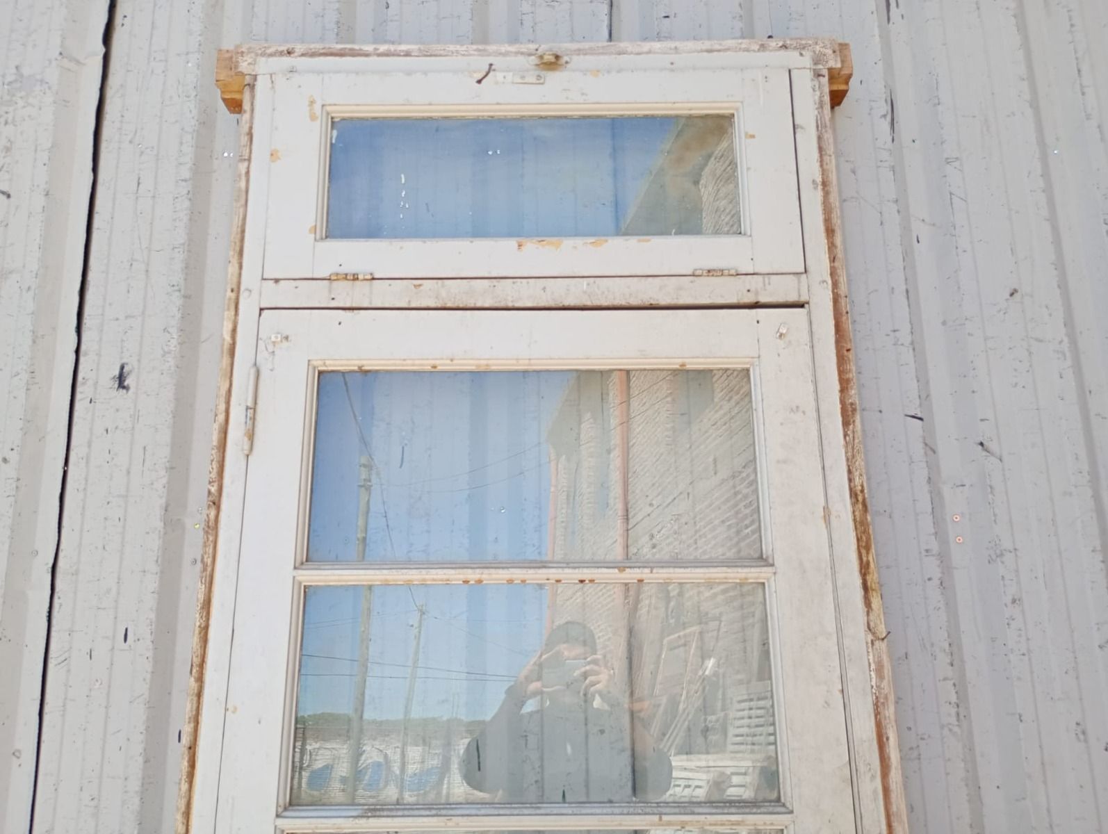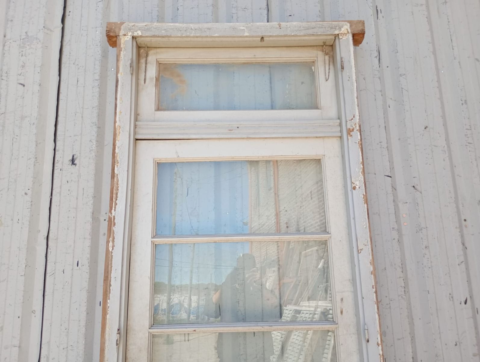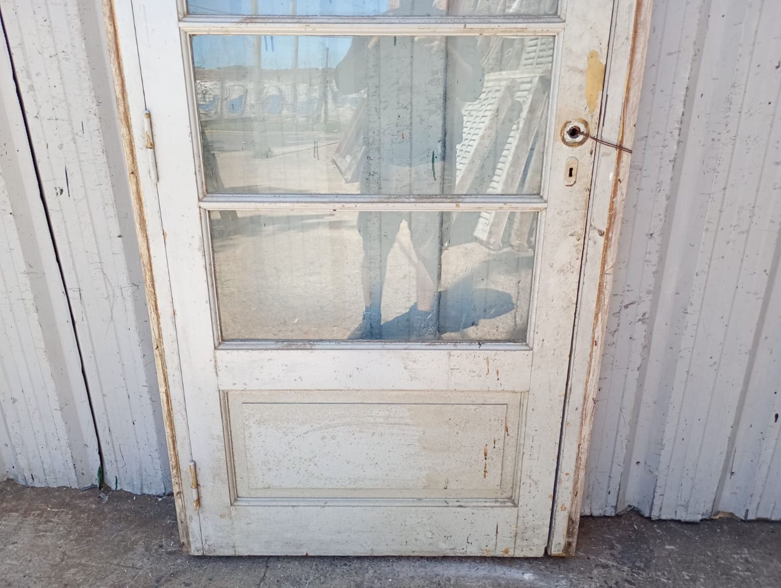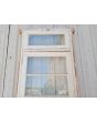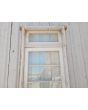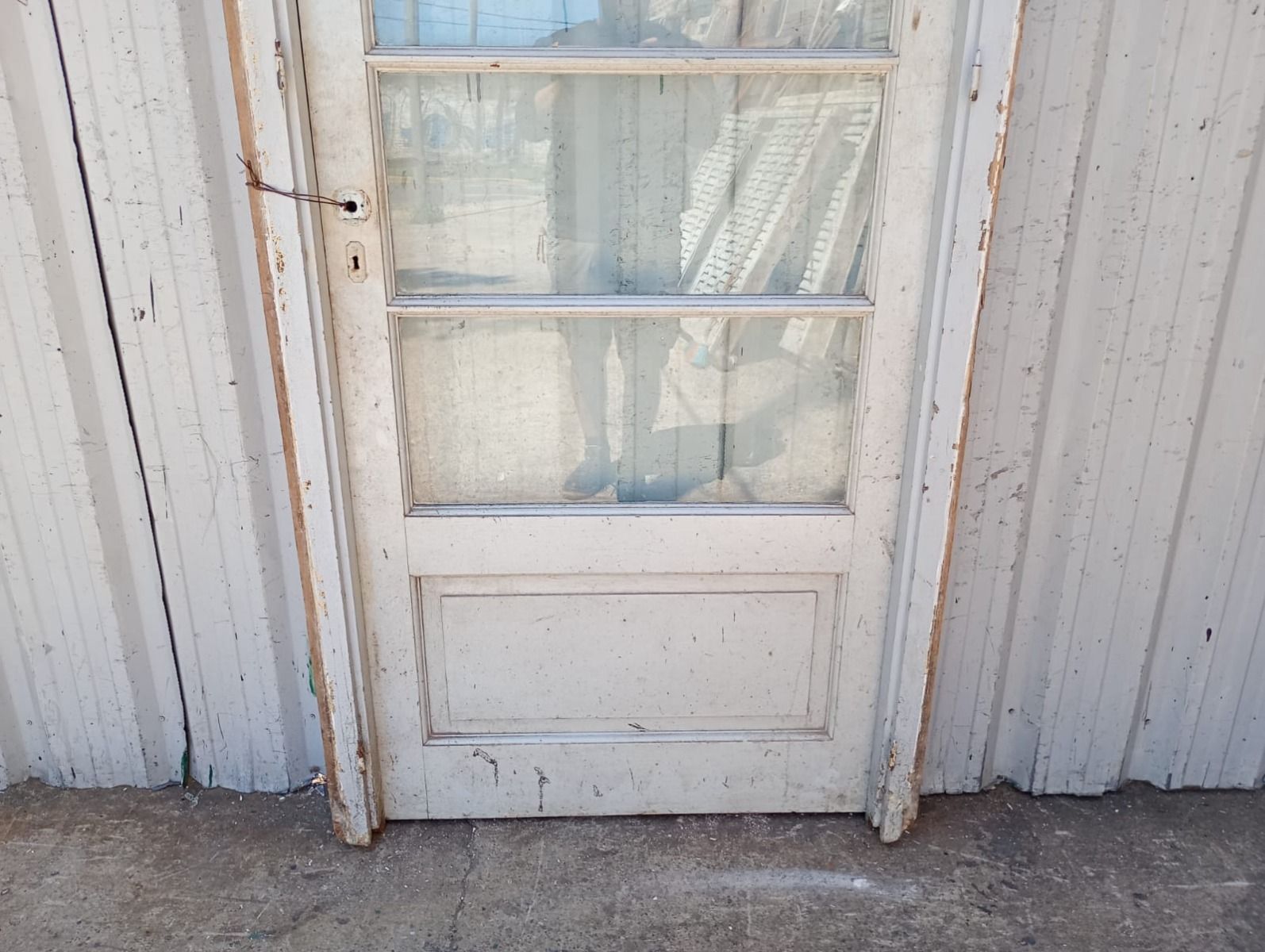 Antigua puerta de madera cedro pintada de blanco. Es a una hoja de abrir hacia la derecha, con vidrios tipo apaisados, banderola de abrir, tablero doble replanado inferior y marco de madera pinotea. La abertura no incluye todos los vidrios, la cerradura ni el picaporte. Hoja de 87x200cm.