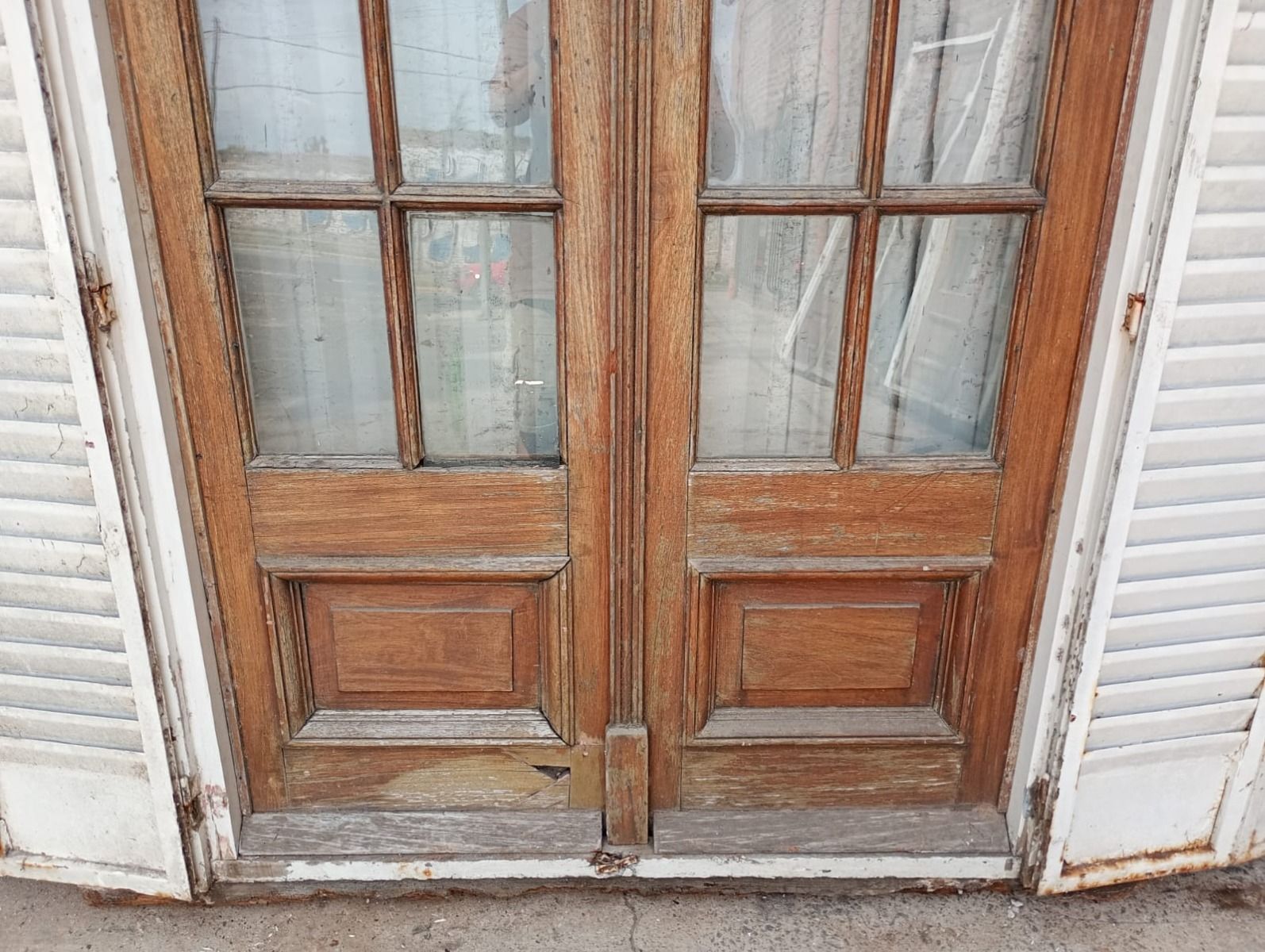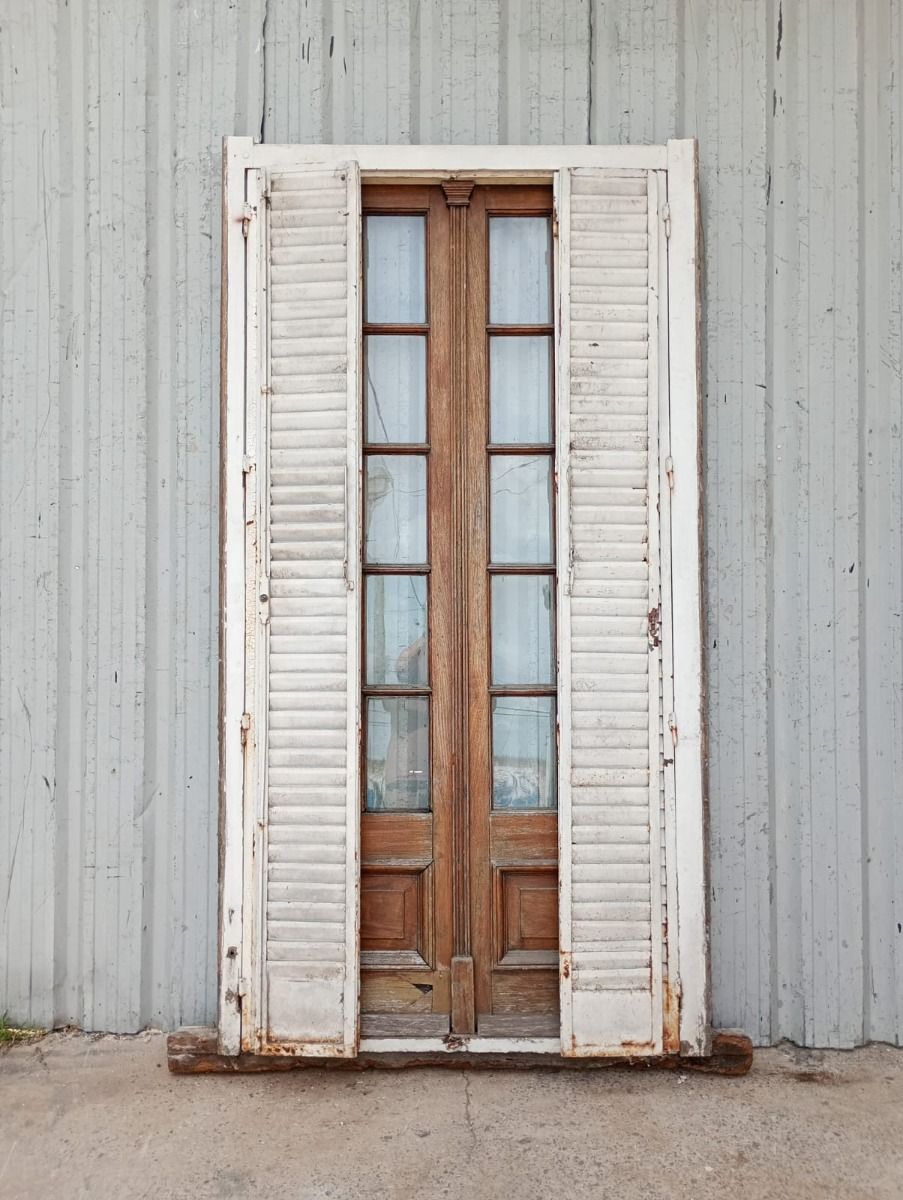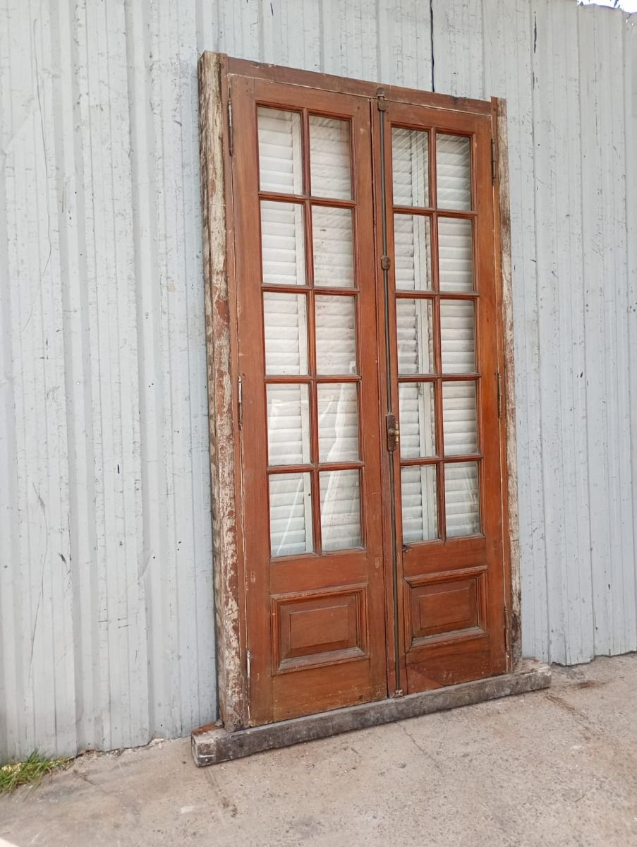 Antigua puerta de madera cedro al natural. Es a dos hojas de abrir y vidrios repartidos. Con celosías de hierro, celosías de hierro, tableros doble replanados moldurados inferiores, falleba, tapajunta, capitel y marco de madera dura. Tiene algunas averías que pueden observarse en las fotografías. La abertura no incluye todos los vidrios, la caladura, cerradura ni el picaporte. Hojas de 57x233cm. Con umbral incluído, la abertura tiene una altura de 250cm.