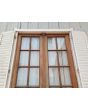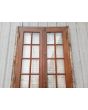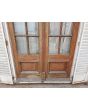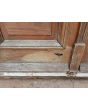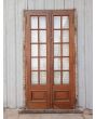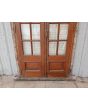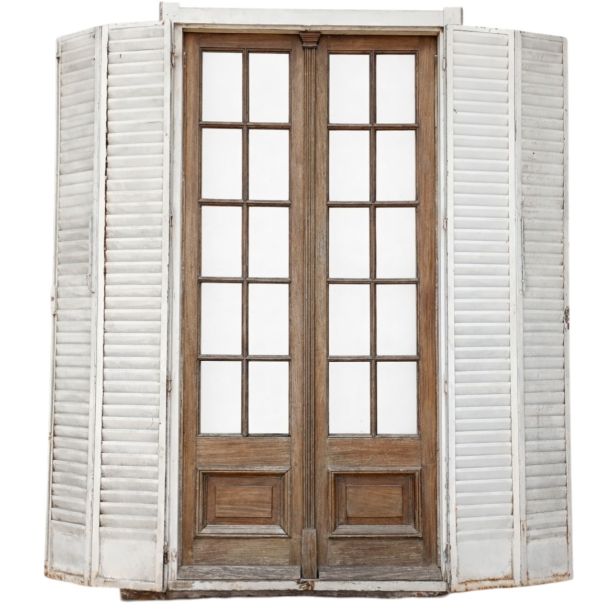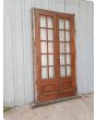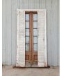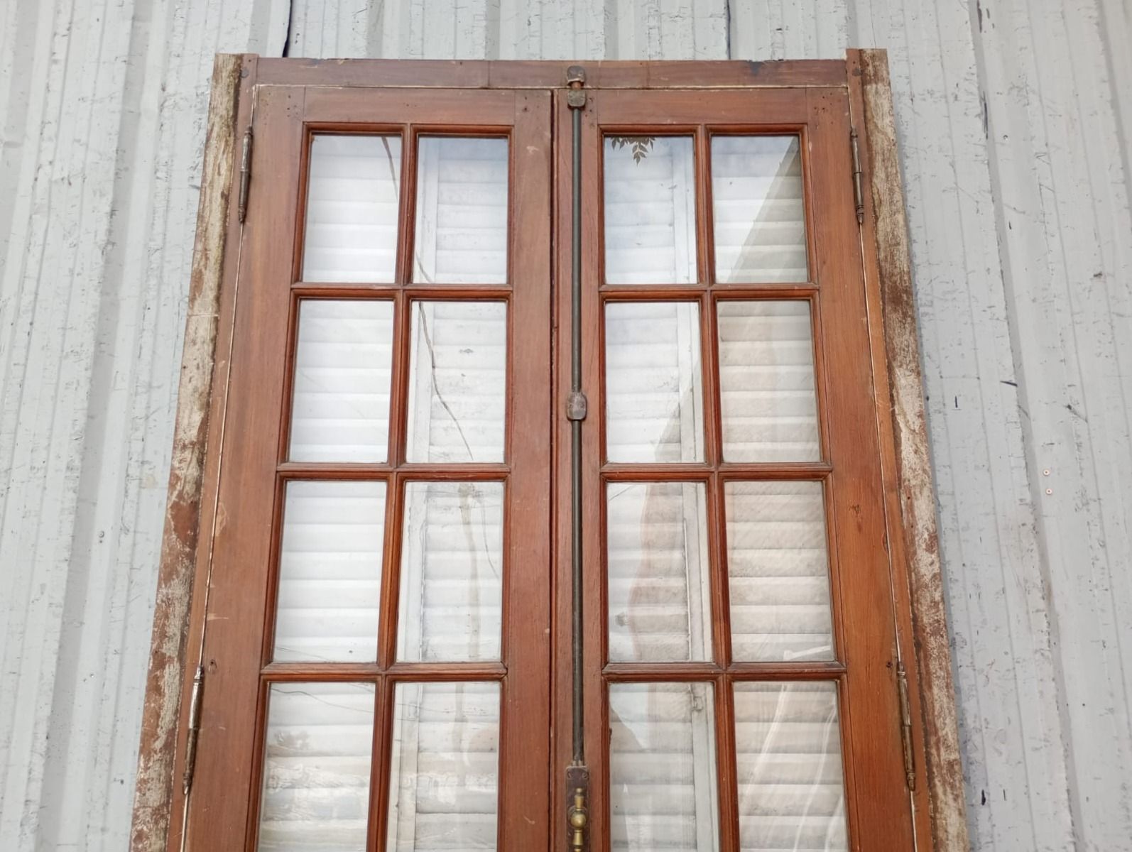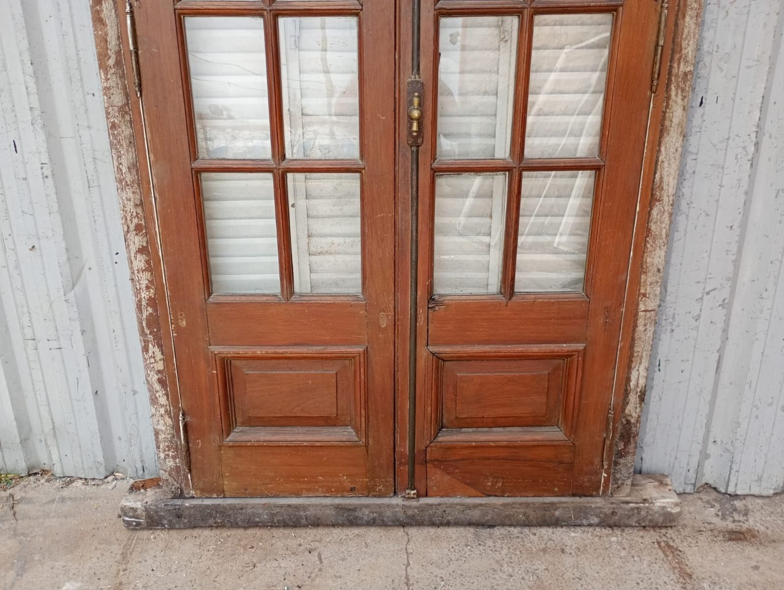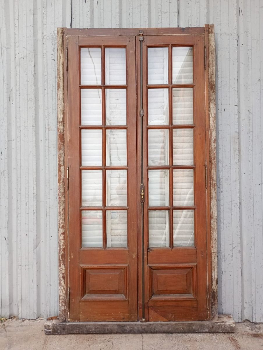 Antigua puerta de madera cedro al natural. Es a dos hojas de abrir y vidrios repartidos. Con celosías de hierro, celosías de hierro, tableros doble replanados moldurados inferiores, falleba, tapajunta, capitel y marco de madera dura. Tiene algunas averías que pueden observarse en las fotografías. La abertura no incluye todos los vidrios, la caladura, cerradura ni el picaporte. Hojas de 57x233cm. Con umbral incluído, la abertura tiene una altura de 250cm.