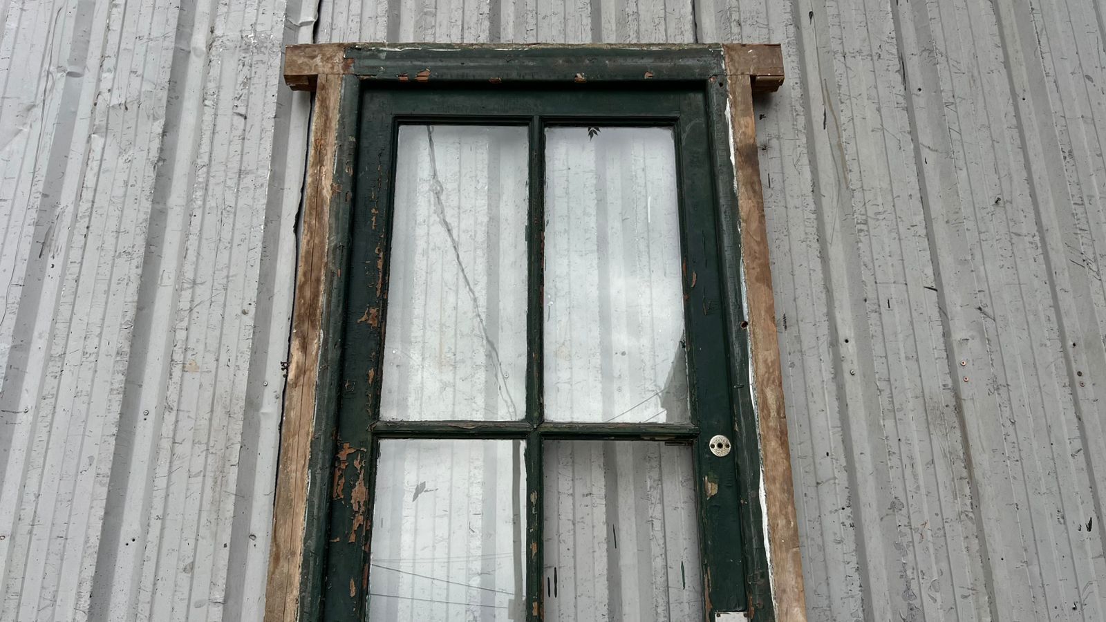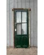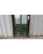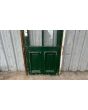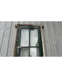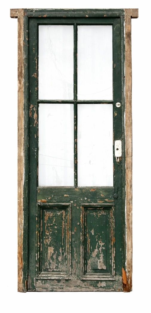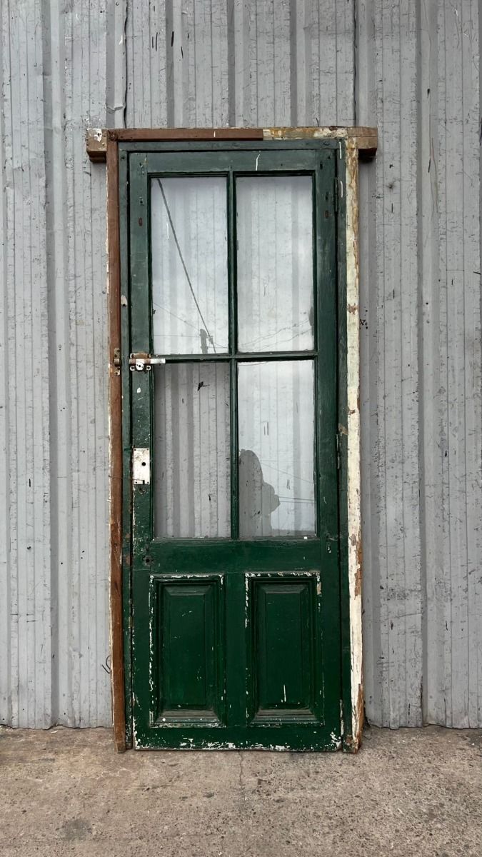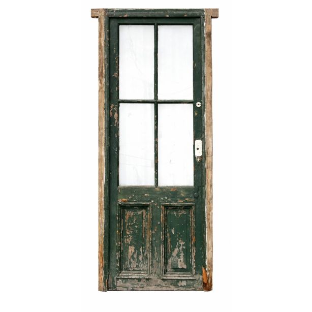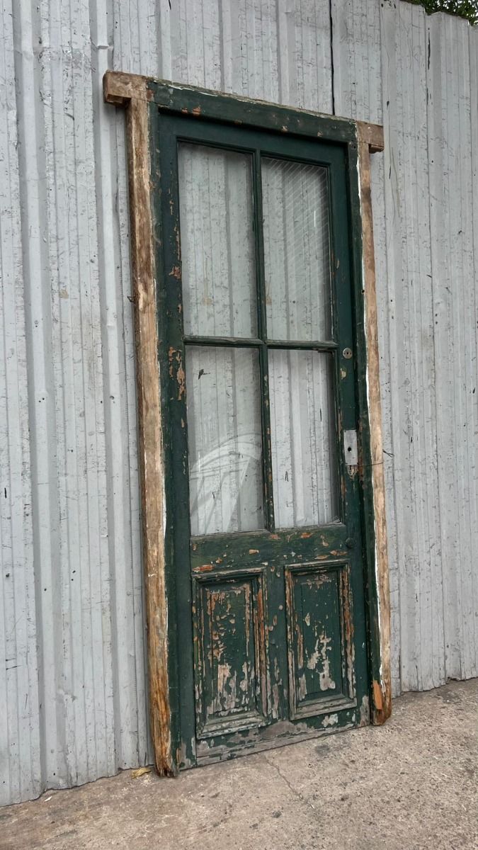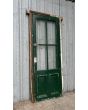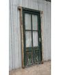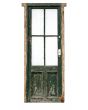 Antigua puerta de madera cedro pintada. Es a una hoja de abrir hacia la izquierda, con vidrios tipo crucero, tableros doble replanados inferiores y marco de madera dura. La abertura no incluye todos los vidrios, la cerradura ni el picaporte. Hoja de 80x233cm.