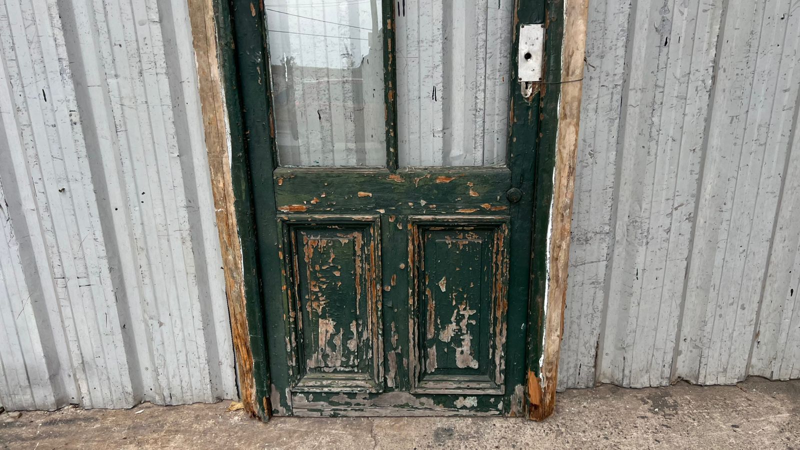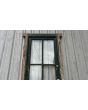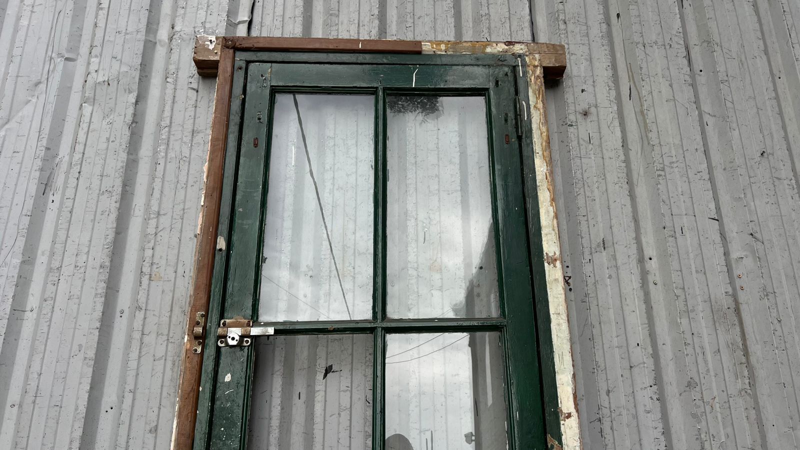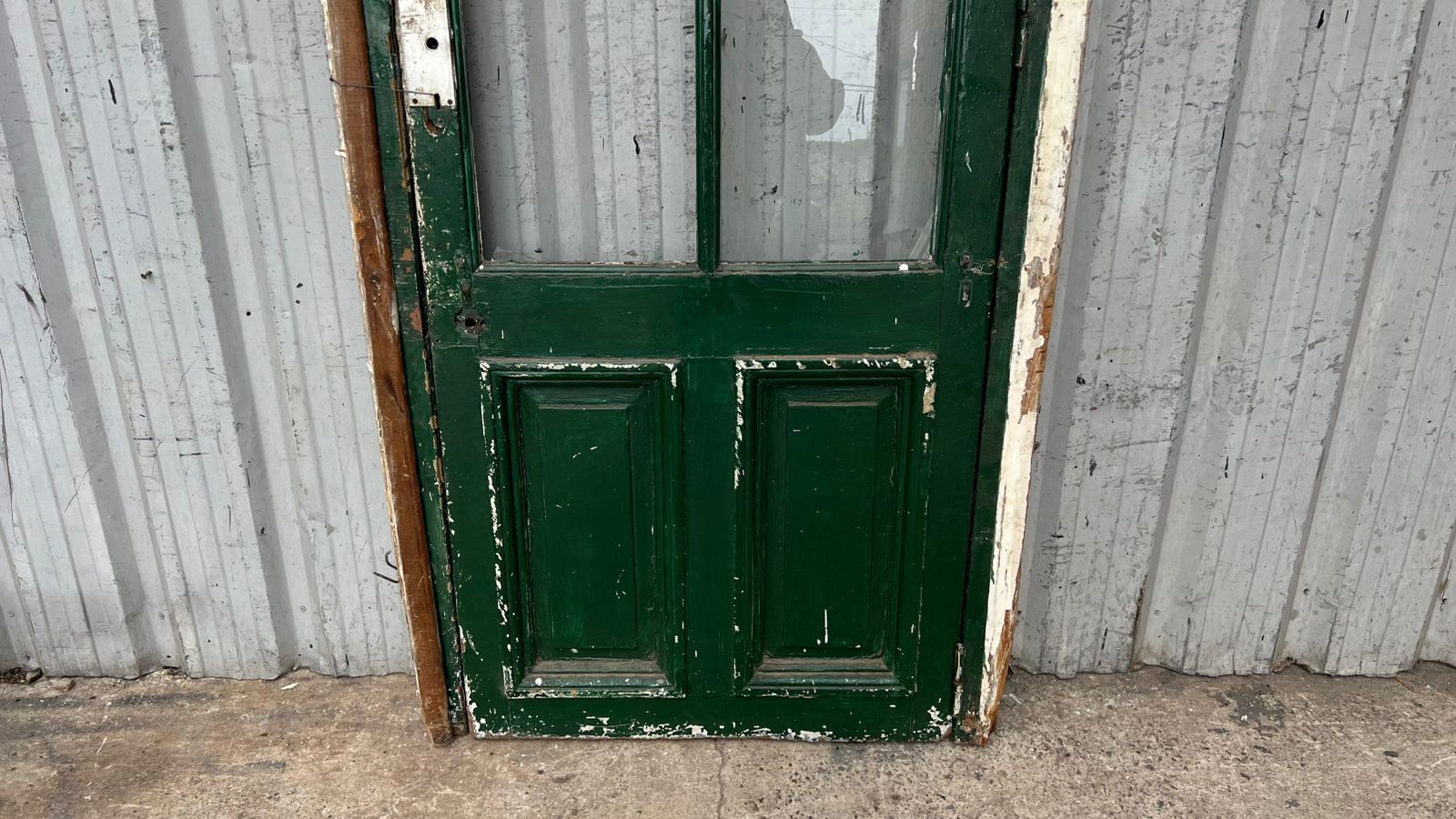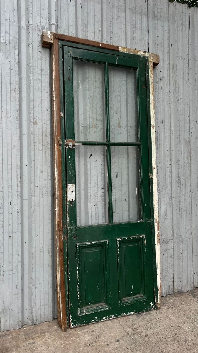 Antigua puerta de madera cedro pintada. Es a una hoja de abrir hacia la izquierda, con vidrios tipo crucero, tableros doble replanados inferiores y marco de madera dura. La abertura no incluye todos los vidrios, la cerradura ni el picaporte. Hoja de 80x233cm.